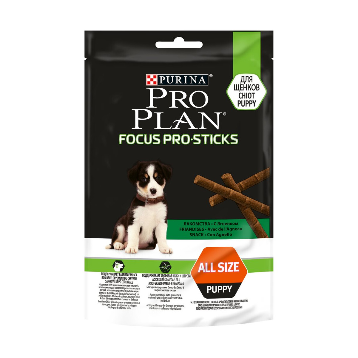 Notre équipe de nutritionnistes pour animaux de compagnie, en collaboration avec des experts de la santé animale, a mis au point, PRO PLAN Focus PRO Sticks, avec du DHA pour un développement sain de la vue et du cerveau du chiot. Il constitue un moyen agréable de garder votre chiot concentré pendant le dressage et de le récompenser avec notre combinaison de nutriments la plus avancée et efficace. Le DHA (acide docosahexaénoïque) est un acide gras oméga-3 présent dans l'huile de poisson qui aide à soutenir le bon développement du cerveau et de la vision de votre chiot dès le début de sa vie. Donnez un Focus PRO Sticks avec du DHA en entier ou en petits morceaux, à votre chiot il l'adorera à tout moment de la journée. Formulé sans colorants ajoutés, sans arômes ni conservateurs artificiels ajoutés.Spécifications techniques