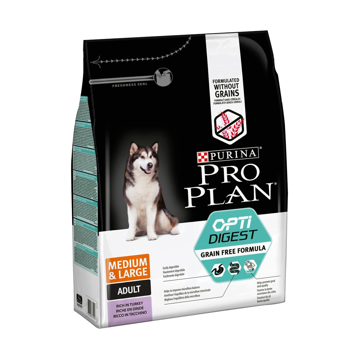 Croquettes PRO PLAN Formule sans céréales Medium & Large Adult Sensitive Digestion riche en Dinde - 2,5kg - croquettes pour chien adulte Favorise la bonne consistance des selles - Avec des ingrédients spécifiques pour favoriser la bonne santé intestinale et la bonne consistance des selles Contient des protéines de Dinde de haute qualité Hautement digestible - Formulé avec des ingrédients qui facilitent la digestion comme les œufs qui sont hautement digestibles, une argile naturelle comme la bentonite qui assure une bonne consistance des selles et un prébiotique issu de la pulpe de betterave qui favorise la bonne santé intestinale.Spécifications techniques