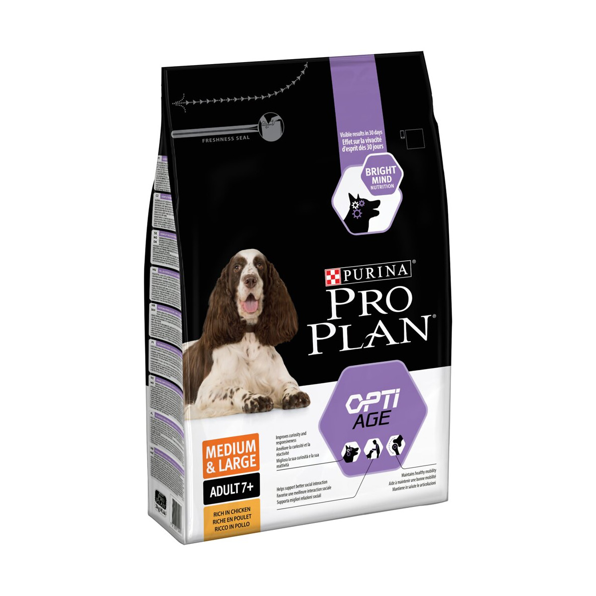 Croquettes au poulet Pro Plan Adult Medium & Large pour chien sénior de 7 ans et plus. Lorsque votre chien atteint sa pleine maturité, ses fonctions mentales ralentissent. Développée par nos vétérinaires et nutritionnistes, la formule Pro Plan OPTIAGE aide à garder le cerveau de votre chien actif et vif plus longtemps. Notre combinaison de nutriments brevetée (en cours de dépôt) OPTIAGE est prouvée pour aider à améliorer les fonctions cérébrales et aider à accroître l'activité, la vivacité et l'intérêt des chiens matures durant les temps de jeu. Formulées pour une bonne hygiène bucco-dentaire, ces croquettes soutiennent la bonne santé des chiens vieillissants grâce à une nutrition adaptée. Contenance : 3 kg. Soutient la bonne santé des chiens vieillissants grâce à une nutrition adaptée Prouvé pour améliorer les fonctions cérébrales grâce à notre complexe exclusif de nutriments.Spécifications techniques