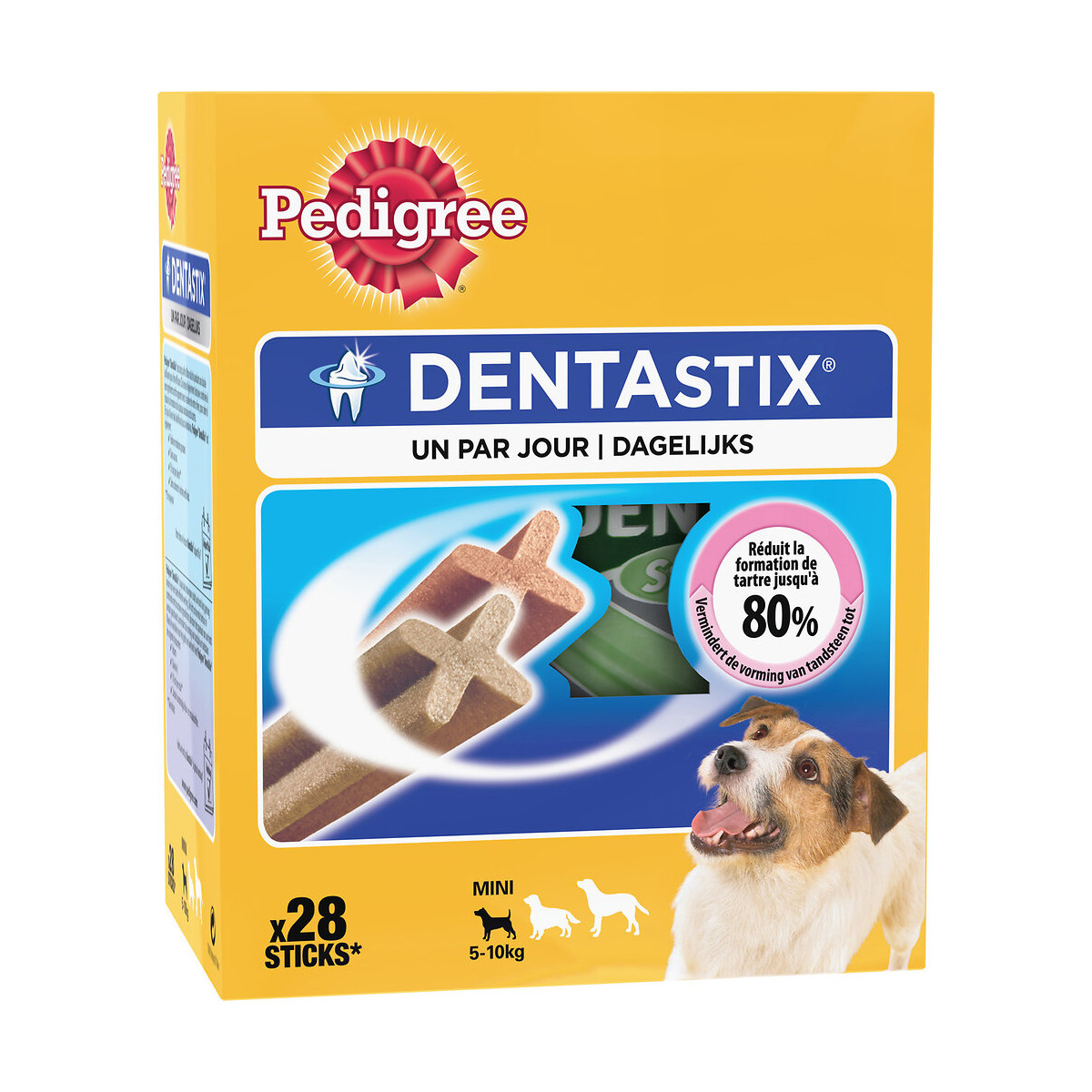 Aliment complémentaire pour chiens de petite taille <10kg ( type Teckel) et jeunes chiens à partir de 4 mois. Les bâtonnets à mâcher Pedigree® Dentastix™ vous aident à garder les dents de votre chien saines et des gencives fortes. Technologie de bâtonnet unique brevetée. En utilisation quotidienne, ce stick dentaire en forme de X unique aide à réduire jusqu'à 80% la formation de tartre. Avec une texture légèrement abrasive conçue pour permettre un frottement sur les dents et des ingrédients actifs qui agissent directement sur la salive qui aide à réduire la formation du tartre. Ces bâtonnets nettoient les dents difficiles à atteindre et contribuent à des gencives saines. Le stick pour chien Pedigree® Dentastix™ est également faible en matières grasses, sans sucres ajoutés, sans colorant ni arôme artificiels. Les délicieuses friandises Pedigree® Dentastix™ s'intègrent parfaitement dans l'équilibre nutritionnel quotidien des chiens grâce à son faible apport en calories. 4 chiens sur 5 de plus de 3 ans ont des problèmes bucco-dentaires. Ils sont causés par le développement de la plaque dentaire et du tartre. Une bonne hygiène bucco-dentaire représente le meilleur moyen de les réduire. 77% des vétérinaires reconnaissent les sticks dentaire comme un bon outil en hygiène bucco-dentaire. Il est scientifiquement prouvé que les bâtonnets à mâcher Pedigree® Dentastix™ vous aident à garder les dents et les gencives de votre chien en bonne santé. Les friandises pour chien Pedigree® Dentastix™ sont disponibles en différentes tailles (chiot de plus de 4 mois/petit, moyen et grand) pour s'adapter à tous les chiens. Friandise pour chien mise au point avec nos nutritionnistes et nos vétérinaires du centre de recherche WALTHAM® - Principale référence mondiale pour la nutrition et le bien-être des animaux de compagnie.Spécifications techniques