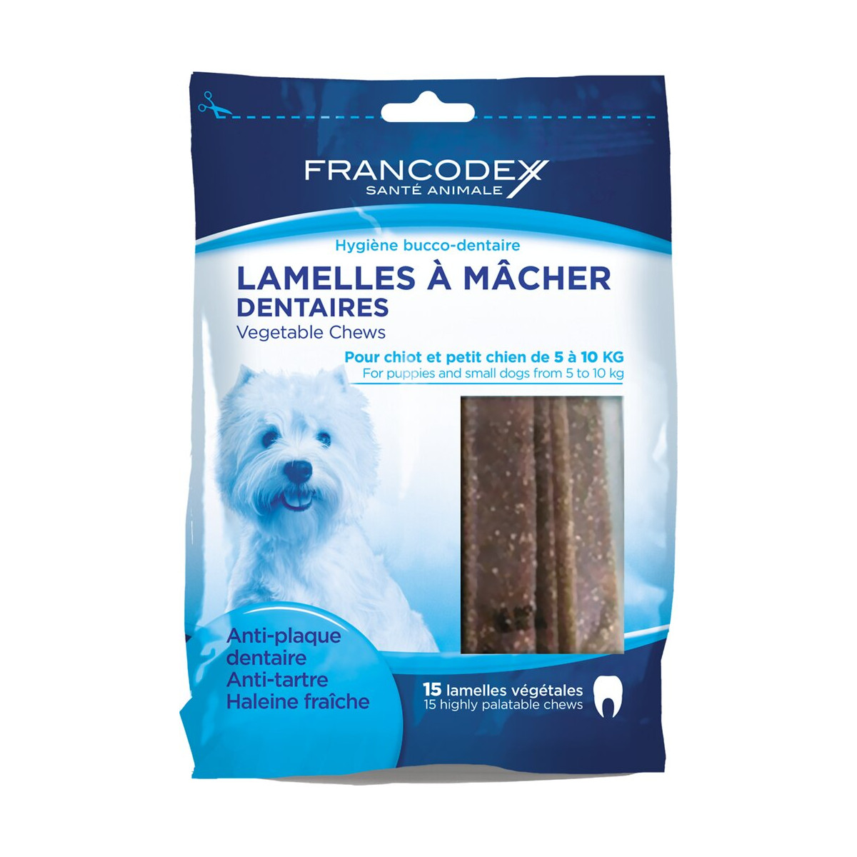 Les lamelles à mâcher pour chiot et petit chien Francodex permettent de réduire la formation de la plaque dentaire et du tartre grâce à une action mécanique abrasive non agressive. Leur forme en ‘Z’ spécifiquement conçue pour améliorer ce pouvoir abrasif, accentue également leur efficacité. Une utilisation régulière facilite le nettoyage simple des dents et des gencives de votre animal pour une hygiène bucco-dentaire parfaite. Contenance : 240 g soit 15 lamelles.
