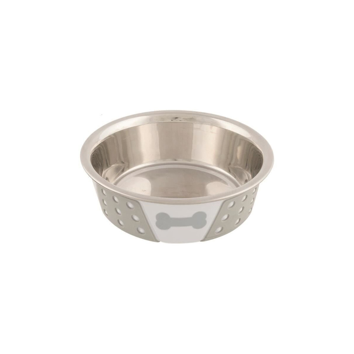 Ecuelle en acier inoxydable - Avec silicone - Antidérapante - Capacité : 0,4 L - Ø14cm - Coloris : blanc et gris - Pour chien.Spécifications techniques