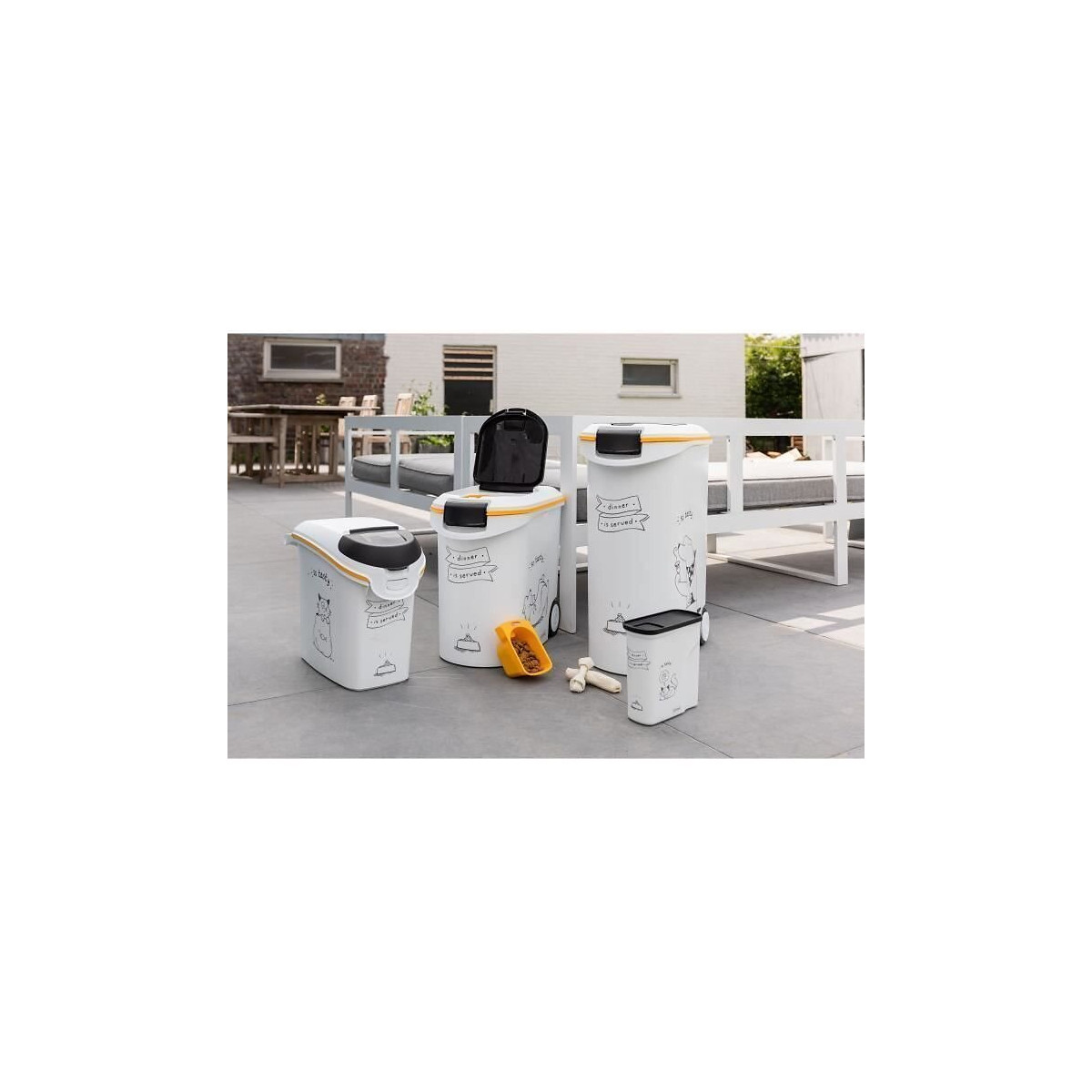 Conteneur de nourriture Le Diner est servi - 12 kg - 35 L - Blanc et noir - Pour chien - Pour stocker et conserver la nourriture de votre animal - Plastique - Poignée de préhension - Joint élastomere pour préserver la fraîcheur des aliments et éviter les odeurs - Double ouverture - Jauge pour mesurer le niveau - Godet inclus.Spécifications techniques