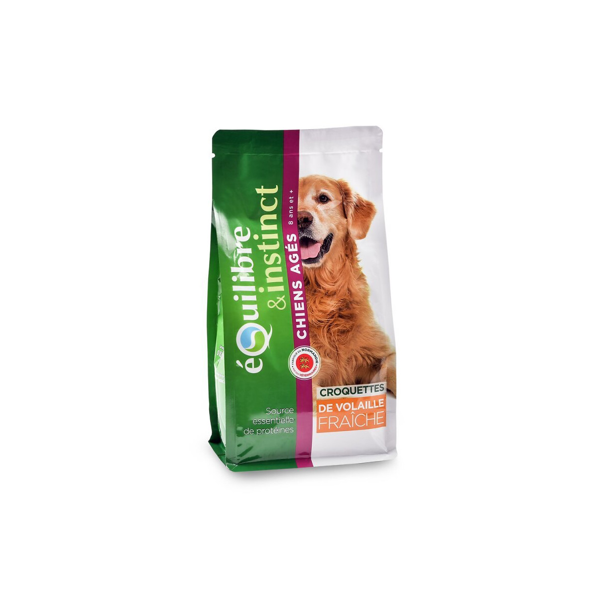 Sachet de 500 gr de croquettes de viandes fraîches à la volaille, peu encombrant, facile à ranger et simple d'utilisation. Sachet de 500 gr de croquettes de viandes fraîches à la volaille, peu encombrant, facile à ranger et simple d'utilisation. Aliment pour chien Fabriqué en France Elaboré par des Vétérinaires en Normandie Liste des Ingrédients : Volaille (26% min, ingrédients frais 14%), farinde de blé, farine de maïs, porc, graisse de canard (conservée avec antioxydants naturels), farine de riz, gluten de blé, levures, poudre d'oeuf, protéines de soja (garantie sans OGM). L'équilibre et la bonne santé de votre chien sont assurés grâce à des nutriments adaptés: - Digestibilité optimale grâce aux viandes blanches (volaille et porc). - Soutien des fonctions nerveuse et immunitaire par l'apport de levure de bière. - Métabolisme du fer et système immunitaire renforcés par la complémentation en vitamine C . - L'ajout de poudre d'oeuf permet d'apporter un cocktail d'acides aminés, d'acides gras essentiels et de minéraux complets. - Beauté et qualité de la peau et du pelage grâce au Zinc. - Aide au transit intestinal par l'apport de fibres de haute qualité. - Contient du poisson et des protéines végétales pour diversifier les protéines et améliorer le confort intestinal des chiens âgés. En prenant de l'âge, les chiens se dépensent moins, les croquettes Equilibre et Instinct pour chien âgé contiennent moins de matières grasses pour alléger leur ration. Elles sont aussi enrichies en vitamine D3 (assimilation du calcium) pour lutter contre la fragilisation des os et des dents. Grâce à des croquettes plus croustillantes, la mastication de votre chien sera renforcée et limitera ainsi la formation de tartre (amélioration de l'hygiène bucco-dentaire). Photo non contractuelle, car il y a plusieurs vendeurs sur une même fiche produit.Spécifications techniques