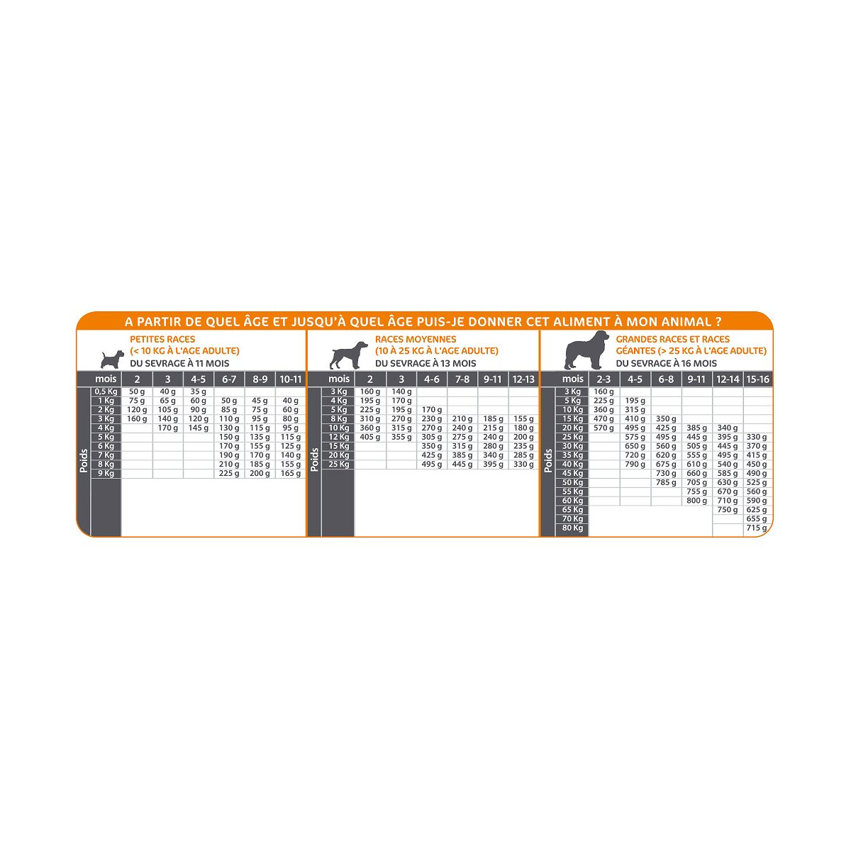 Ce produit couvre les besoins nutritionnels du chiot depuis le sevrage jusqu'à l'âge adulte. L'aliment Mastery Chiot a été formulé pour répondre aux besoins particuliers de votre chiot pendant sa croissance : Des apports renforcés en protéines et énergie, et adaptés en minéraux, vitamines et oligo-éléments favoriseront une croissance osseuse et musculaire harmonieuse. Une supplémentation en argile et fructo-oligosaccharides permettra d'assurer une meilleure sécurité digestive. Les apports en protéines et acides gras essentiels contenus dans les matières grasses favoriseront une peau saine et un poil brillant. L'apport en acides gras essentiels participera également au soutien de son immunité. composition: Protéines déshydratées de porc et volailles, maïs, blé, graisses animales, pulpe de betterave, pois entier, protéines de maïs, graine de lin, protéines hydrolysées de porc, minéraux, son de blé, poissons déshydratés, œufs en poudre, fructo-oligosaccharides (0,2 %), levure de bière. CONSEILS NUTRITIONNELS Aliment complet prêt à consommer. Mettez à disposition de l'eau fraîche et potable à volonté. Distribuez la ration quotidienne de préférence en 3 repas (matin, midi et soir) en suivant les tableaux de rationnement sur lesquels les quantités sont indicatives et peuvent varier en fonction de la température extérieure, du niveau d'activité et du tempérament de votre jeune chien. La densité énergétique du produit et sa haute digestibilité justifient des rations journalières de faible volume, qui respectent ainsi l'estomac de votre chien. Cet aliment convient également à la chienne pendant la gestation et la lactation. Si cet aliment est nouveau pour votre chien, il convient de respecter une période de transition sur quelques jours : jours 1 et 2, 25% de mastery jour 3 et 4, 50% jours 5 et 6, 75% et apres 100% Avant 3 mois : donner à volonté. sinon reporter vous au tableau en photo Ces rations sont indicatives et dépendent du statut de votre animal (entier ou stérilisé), de son niveau d'activité et de son mode de vie (intérieur / extérieur). Photo non contractuelle, car il y a plusieurs vendeurs sur une même fiche produit.Spécifications techniques