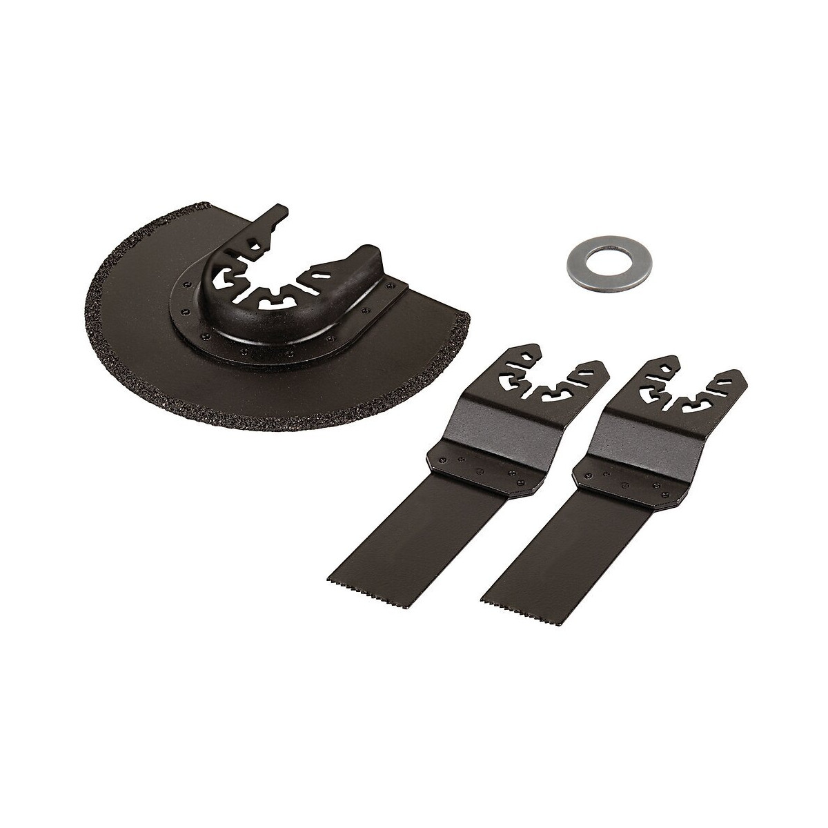 Kit d'accessoires outils multifonction bois métal plastique - 1 lame de scie segmentée BIM diamètre 85 mm. 1 lame de scie plongeante BIM 22 mm 1 lame de scie plongeante HCS 22 mm. 1 bague d'adaptation pour Bosch PMF 250 CES. Accessoires pour outils multifonctions. Convient pour AEG / Batavia / Black et Decker / Bosch PMF 180 E, PMF 190 E, PMF 10,8 Li, PMF 250 CES, GOP 10,8 V-Li, GOP 250 CE, PS50-2A, MX25EC-21 CRAFTSMAN / Capaz / DEWALT / DEXTER 5908.A Multi tool / DREMEL MM20, Mutli-maximum TM 6300, Multi-maximum TM 8300-q Einhell / Erbauer ERI616HTL-G / Fein FMM 250, FMM 250 Q, AFMM 14, FSN 400, MSX 636 II, MSX 315, MSX 636, MSXE 636 Greenworks 3600207a / Hitachi / Kraft Werkzeuge / Parkside / LUX TOOLS / Mac Allister MMT300 / Makita / Mastercraft Metabo / Milwaukee / Passat OS220 / Porter Cable / Renovator / Rockwell / RYOBI / Scheppach / SKIL Stanley / Titan / Westfalia / WORX WX675, WX671, WX677. Pour bois, métal et plastique.