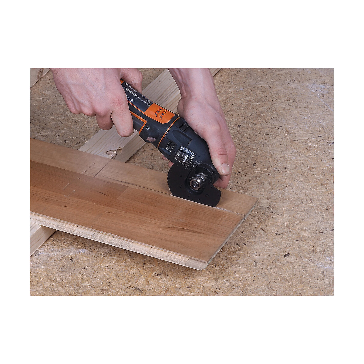 Lame de scie segmentée, accessoire pour outils multifonctions. Convient pour AEG / Batavia / Black et Decker Bosch PMF 180 E, PMF 190 E, PMF 10,8 Li, PMF 250 CES, GOP 10,8 V-Li, GOP 250 CE, PS50-2A, MX25EC-21 CRAFTSMAN / Capaz / DEWALT / DEXTER 5908.A Multi tool. DREMEL MM20, Mutli-maximum TM 6300, Multi-maximum TM 8300-q / Einhell / Erbauer ERI616HTL-G Fein FMM 250, FMM 250 Q, AFMM 14, FSN 400, MSX 636 II, MSX 315, MSX 636, MSXE 636 / Greenworks 3600207a Hitachi / KRAFTRONIC KT-MT 200 / Kraft Werkzeuge / Parkside / LUX TOOLS / Mac Allister MMT300 / Makita Mastercraft / Metabo / Milwaukee / Passat OS220 / Porter Cable / Renovator / Rockwell / RYOBI / Scheppach SKIL / Stanley / Titan / Westfalia / WORX WX675, WX671, WX677. Profondeur de coupe 19 mm - diamètre de coupe 85 mm. Pour sols stratifiés, parquets, métaux non-ferreux, tubes et mastics. Pour des coupes à angle droit sans surcoupe des sols stratifiés, parquets, métaux non-ferreux et tubes et pour enlever les mastics de fenêtres avec vitrages simples et composites, sans risque de bris de verre. Les lames coudées permettent un travail à plat au plus près de la surface. La segmentation permets des coupes à angle droit sans surcoupe. Label TUV.