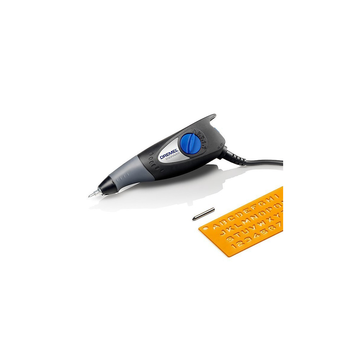 Graveur DREMEL Engraver. Outil de gravure avec contrôle de profondeur variable pour graver une grande variété de matériaux tels que les métaux, le verre, le bois, le plastique, la céramique, etc. Ce kit comprend également des gabarits qui permettent de graver facilement des chiffres et des lettres.Spécifications techniques