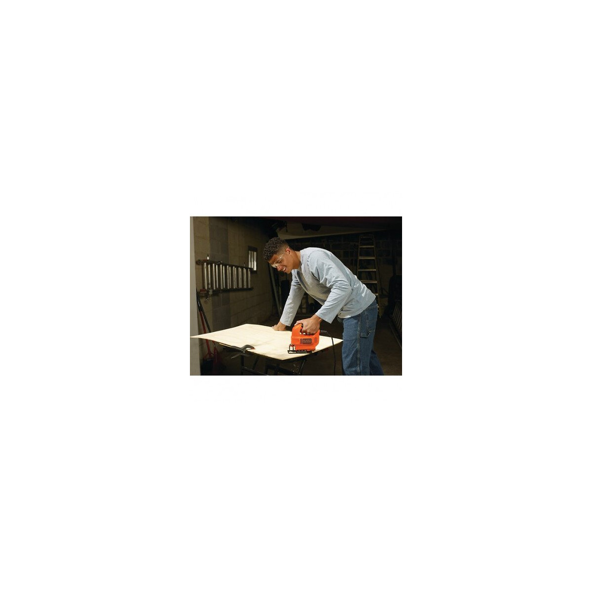 Scie Sauteuse filaire BLACK&DECKER Caractéristiques: - Coupes biaises à 0 et 45° - Faibles vibrations grâce au contrebalancier interne et au revêtement caoutchouc - Soufflerie intégrée pour dégager le trait de coupe - Interrupteur verrouillable pour les utilisations prolongées - Bonne visibilité du trait de coupe grâce à son design amélioré et à son pare-lame allégé - Bonne maniabilité et confort d'utilisation grâce à son design ergonomique Livraison en standard: - 1 lame bois - Scie sauteuse compacte 400W Donées techniques: - Type de Produit: Scie Sauteuse - Source d'énergie: Filaire - Puissance (V): 400 Watts - Tension en Voltage: 230 Volts - Vitesse: Unique - Coups: 3000 /min - Système Pendulaire: Non - Fixation de lame sans outil: Non - Interrupteur de verrouillage: Oui - Coupes biaises: 0 or 45 ° - Profondeur de coupe - Bois: 65 mm - Profondeur de coupe - Acier: 5 mm - Profondeur de coupe - Aluminium: 10 mm - Course de la lame: 19 mm - Soufflerie intégrée: Non - Extraction des poussières: Non - Poignée caoutchoutée: Non - Nombre de lames: 1 - Coffret: Non - Pression sonore: 85 dB(A) - Puissance sonore: 96 dB(A) - Vibration: 16.2 m/s²