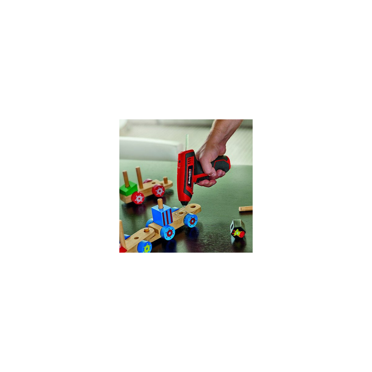 Pistolet à colle chaude sans fil TC-CG 3,6/1 Li Einhell Caractéristiques: - Liberté de collage sans fil grâce à la batterie lithium-ion 3,6 V - En raison de la taille compacte utilisable pour un large éventail de tâches de collage - Poignée ergonomique pour travailler sans fatigue - Manipulation sûre et confortable grâce à la poignée souple - Opérationnel pour le collage après seulement 30 secondes de préchauffage - Manipulation de jusqu'à 6 bâtons de colle avec une charge de batterie - Arrêt automatique après 5 minutes d'inactivité - LED pratique - indicateur de niveau de chaleur et de charge - Livraison en boite métal incl. chargeur et 4 bâtons de colle Données techniques: - Accumulateur 3,6 V | 1500 mAh | Li-Ion - Temps de chauffe 30 s - Max. température de collage 160 ° C - Diamètre du bâtonnet 7 mm - Longueur du bâton 150 mm - Temps de charge 3-5h - Poids du produit (kg) 0,24