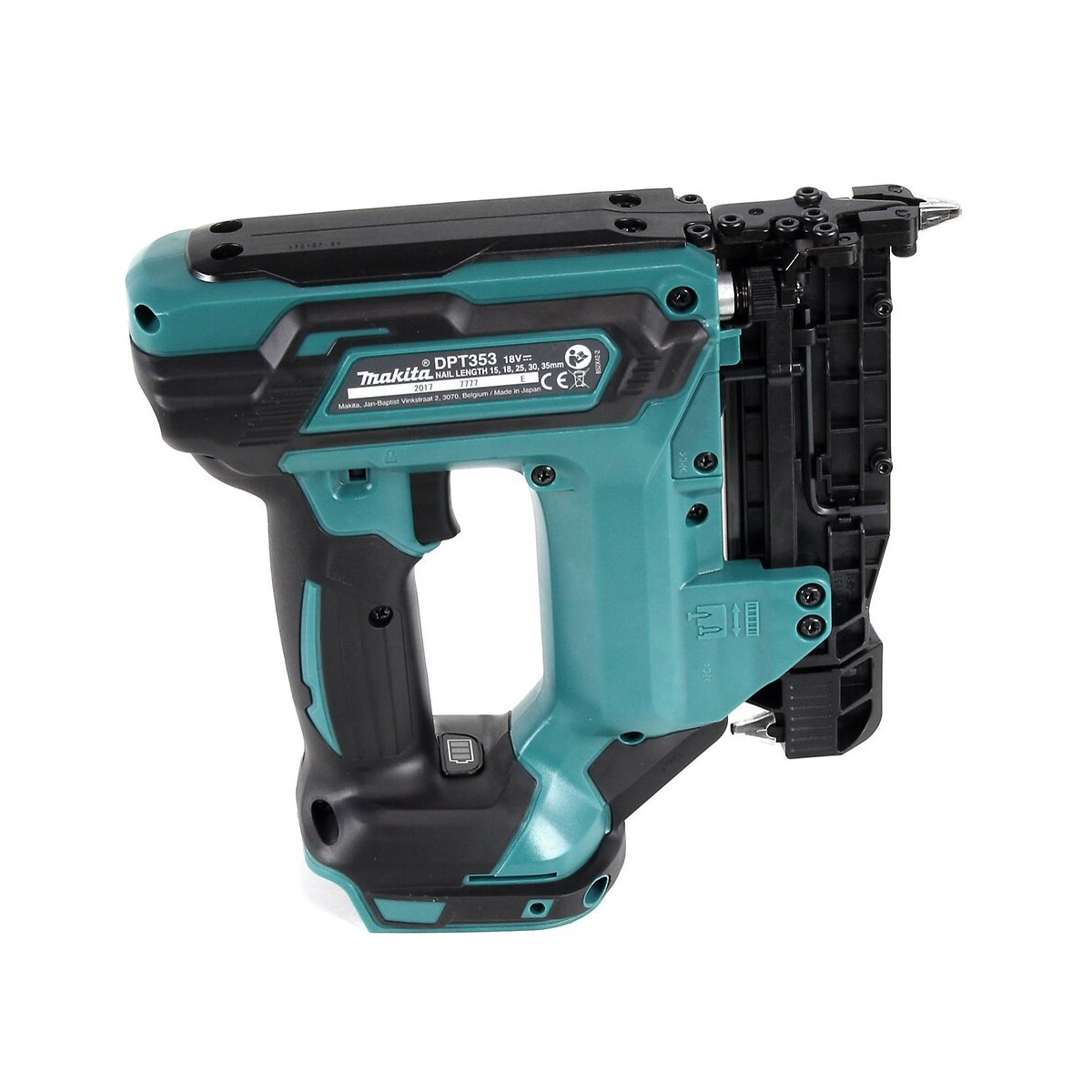 Cloueur 18V LXT 0,6 mm max. 35 mm Makita Caractéristiques: Cloueur sans fil au lithium-ion 18V Clou à broche de 0,6 mm de diamètre. - Permet différentes longueurs de clous, 15 mm, 18 mm, 25 mm, 30 mm. - Profondeur de clouage réglable, grâce à un cadran confortable et simple sur le devant. - Design compact et mince avec poignée antidérapante pour une prise confortable. - Gâchette de verrouillage pour éviter d'éventuels coups accidentels. - Accès facile au magasin de chargement des clous. - Mécanisme de clouage à faible réaction, offrant stabilité et confort - Mode continu, permet de clouer sans avoir besoin de soulever le nez du matériau à clouer. - Protection contre le lancement des clous, si le nez de la cloueuse n'est pas enfoncé, cela ne permettra pas de lancer le tir. - Nez conçu pour une meilleure vue du point où il va être cloué. - Comprend un protège-nez en silicone logé à l'arrière du chargeur pour le mettre en travail continu évitant ainsi de rayer la surface de la zone où il est cloué. - Indicateur de charge de la batterie. - Lumière LED pour un travail à faible luminescence. La lampe s'allumera tant que la gâchette de l'interrupteur est enfoncée. - Compatible avec les batteries au lithium-ion 18V, Bl1815N, BL1830, BL1840B, BL1850B. - Utilise des batteries au lithium conçues avec CXT, la technologie Compact Xtreme, ce qui les rend plus petites et plus légères. Données techniques: - Type de batterie LXT. - Tension de la batterie 18 V. - Diamètre du clou 0,6 mm. - Longueur du clou 18, 25, 30, 35 mm. - Nombre d'agrafes ou de clous par charge de batterie 6400 pcs. - Capacité de charge 120 pcs. - Poids selon EPTA 2,3 Kg. - Dimensions. LxlxH 257 x 94 x 226 mm. - Éclairage intégré. - Emission de vibrations 2,50 m / sec². - Incertitude de vibration (K) 1,50 m / sec². - Pression sonore 76,00 dB (A). - Puissance sonore 80,00 dB (A). - Incertitude sonore (K) 3,00 dB (A). - Crochet.