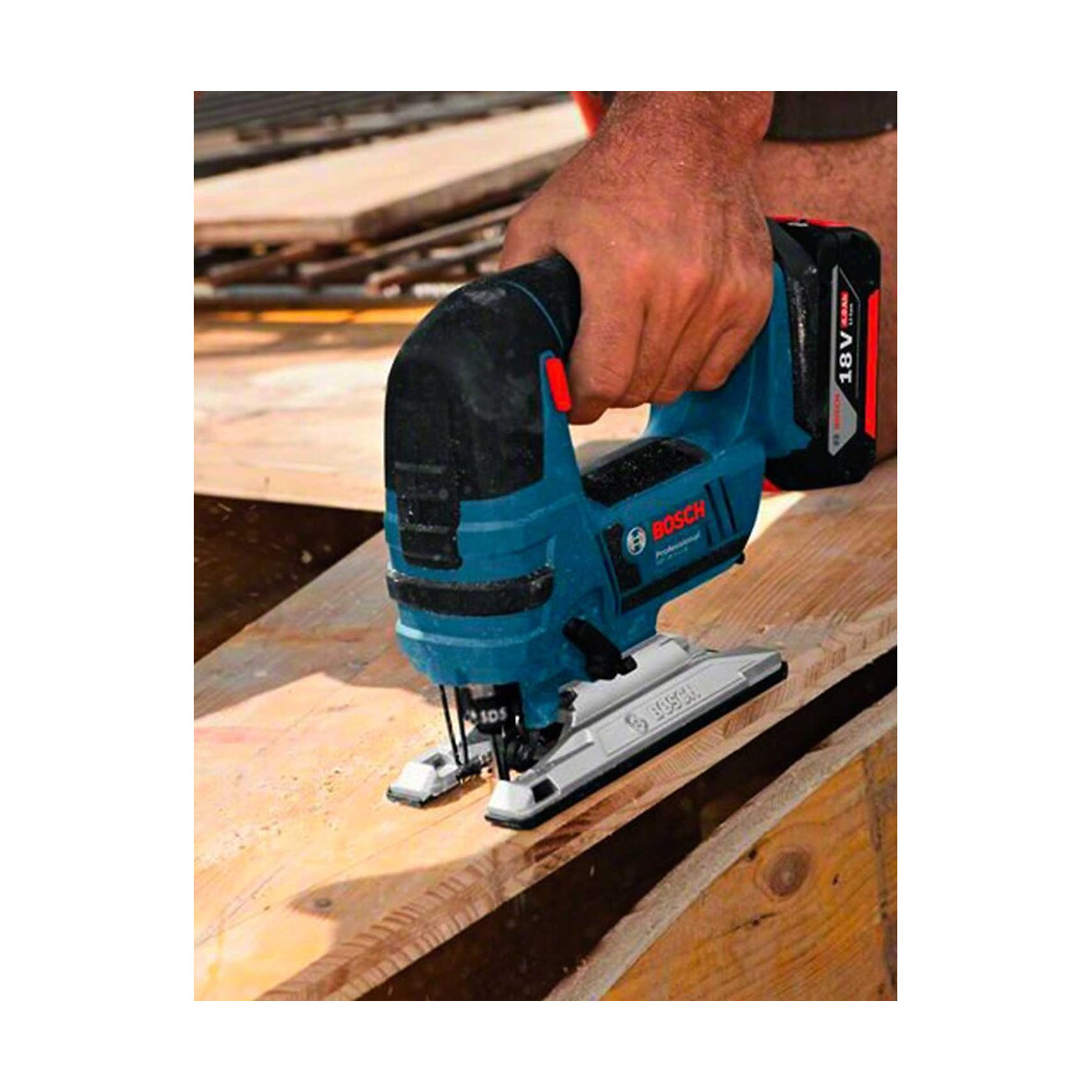 Scie Sauteuse BOSCH GST 18 V-LI B Professional - La Scie Sauteuse est la plus puissante de la catégorie 18 V - Modèle 18 V très performant pour une progression de travail rapide - Dispose aussi de la fonction Constant Speed, d'un éclairage LED, d'un mouvement orbital, du système de guidage Precision Control et d'une présélection de vitesse - Idéal pour les coupes courbes et transversales dans le bois massif, les panneaux agglomérés, les bois composites et les matériaux durs ou épais - Sa poignée étrier avec gâchette de vitesse permet une maîtrise parfaite et facile de l'outil - Grâce au système SDS Bosch, les lames peuvent être changées facilement et sans clé - Compatible avec le système d'aspiration de poussières Click & Clean Bosch et d'autres aspirateurs Bosch ainsi qu'avec les rails de guidage Bosch moyennant l'utilisation d'un adaptateur