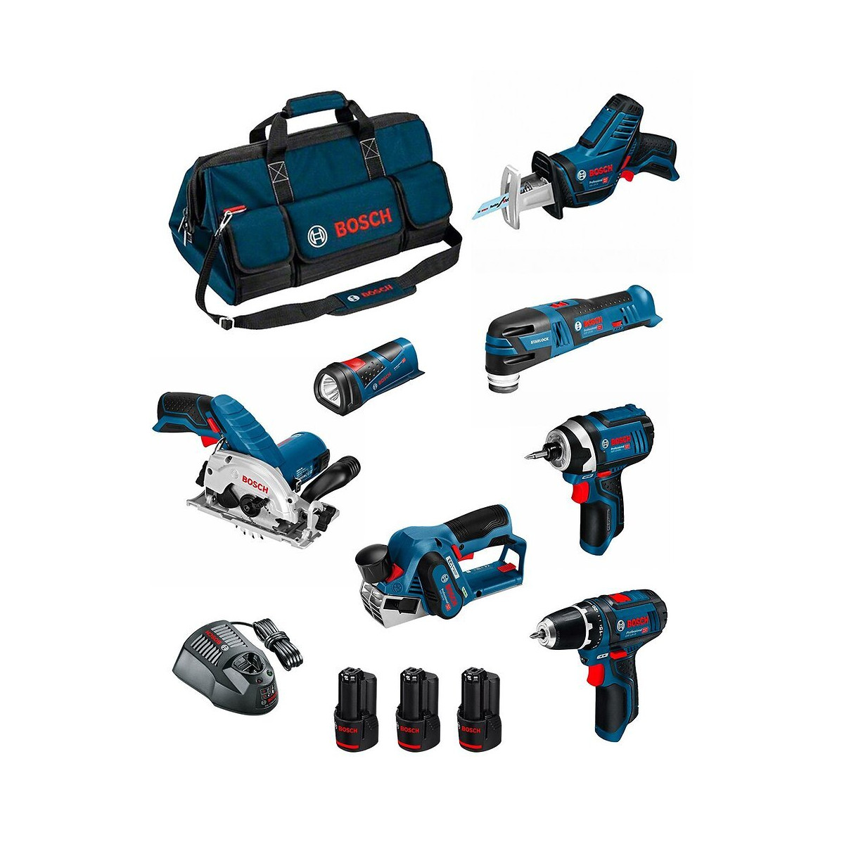 BOSCH Kit 12V BMKB7-28DD3 Perceuse-Visseuse BOSCH GSR 12V-15 Professional - Sa conception extrêmement réduite de 169 mm offre pour une prise en main optimale notamment lors des travaux de vissage et perçage en hauteur et dans les endroits difficiles d'accès - Performance professionnelle : son engrenage 2 vitesses garantit un couple puissant de 15 Nm (matériaux tendres), pour le perçage (jusqu'à 19 mm) et le vissage (jusqu'à 7 mm) - Mandrin Auto-Lock 10 mm - Éclairage LED intégré pour éclairer la zone de travail, même dans les endroits sombres Visseuse à Chocs BOSCH GDR 12V-105 Professional - Avec 137 mm, elle est la plus compacte de la catégorie 12 V. Elle assure une prise en main optimale notamment lors des travaux de vissage en hauteur et dans les endroits difficiles d'accès - Couple remarquable (105 Nm) suffisant pour 80 % des applications courantes dans le métal et le béton - Résultats parfaits grâce à la présélection de vitesse pour les applications nécessitant une vitesse adaptée au matériau - Réversibilité gauche/droite pour visser et dévisser - Très bonne maniabilité de la visseuse grâce à sa poignée antidérapante Soft Grip - Eclairage LED intégré pour illuminer la zone de travail, même dans les coins sombres Scie Circulaire BOSCH GKS 12V-26 Professional - La plus compacte des Scies Circulaires universelles professionnelles - La scie la plus compacte de sa catégorie pour une maniabilité parfaite et de nombreuses possibilités d'utilisation dans le bois - Ergonomie excellente : poignée fine et faible poids (1.4 kg seulement) pour un confort de travail maximal - Témoin de niveau de charge pratique : indique à tout moment les réserves d'énergie restantes - Système d'aspiration Bosch Outil Multifonction BOSCH GOP 12V-28 Professional - L'Outil Multifonction sans-fil le plus compact de la gamme Starlock Bosch - Interface Starlock avec système d'accroche en étoile pour une transmission optimale du couple entre l'outil et l'accessoire - Moteur BRUSHLESS : plus endurant, autonomie accrue, plus de puissance grâce au moteur sans charbon - Présélection de vitesse : des résultats parfaits pour les applications nécessitant une vitesse adaptée au matériau - Poignée très fine pour une prise en main très ergonomique et agréable - Grande légèreté pour une bonne maniabilité et un grand confort d'utilisation Scie Sabre BOSCH GSA 12V-14 Professional - La scie la plus compacte de sa catégorie pour une maniabilité parfaite et de nombreuses possibilités d'utilisation dans le bois, le métal et le plastique - Résultats parfaits grâce à la présélection de vitesse pour les applications nécessitant une vitesse adaptée au matériau - Ergonomie excellente : poignée fine et faible poids (1,2 kg seulement) pour un confort de travail maximal - Eclairage LED intégré pour illuminer la zone de travail, même dans les coins sombres Lampe LED BOSCH GLI 12V-80 Professional - Technologie LED à économie d'énergie permettant d'éclairer pendant toute une journée - Forme ergonomique et zones préhension à revêtement softgrip pour une bonne prise en main - Cette lampe torche classique est idéale pour éclairer de petits espaces ou des endroits exigus - Compatible avec toutes les batteries 12 V de Bosch Professional (Professional 12V System) Rabot BOSCH GHO 12V-20 Professional - Le premier Rabot professionnel 12 V avec une facilité de guidage inédite - Équilibrage optimisé pour un grand confort d'utilisation et une prise en main ergonomique - Grande compacité grâce au moteur EC sans charbon et au système 12 V - Grande liberté de mouvement et une utilisation facile dans toutes les positions de travail grâce à l'absence de fil - Conçu pour le rabotage du bois - Compatible avec toutes les batteries et tous les chargeurs 12 V de Bosch Professional (Professional 12V System) ainsi qu'avec les sacs à poussière et le système d'aspiration de poussières Click & Clean