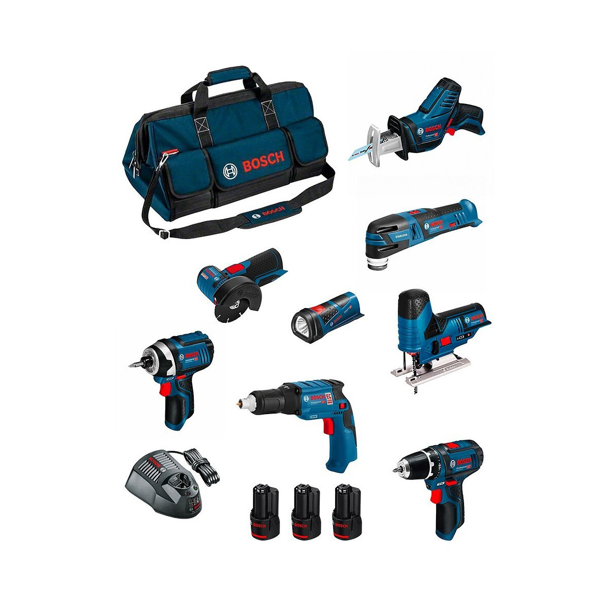 BOSCH Kit 12V BMKB8-28AD3 Perceuse-Visseuse BOSCH GSR 12V-15 Professional - Sa conception extrêmement réduite de 169 mm offre pour une prise en main optimale notamment lors des travaux de vissage et perçage en hauteur et dans les endroits difficiles d'accès - Performance professionnelle : son engrenage 2 vitesses garantit un couple puissant de 15 Nm (matériaux tendres), pour le perçage (jusqu'à 19 mm) et le vissage (jusqu'à 7 mm) - Mandrin Auto-Lock 10 mm - Éclairage LED intégré pour éclairer la zone de travail, même dans les endroits sombres Visseuse Plaquiste BOSCH GTB 12V-11 Professional - Conception légère et compacte de 0,9 kg avec batterie et poignée ergonomique, pour une prise en main confortable dans les espaces restreints - Moteur puissant et compact de 12V pour visser 1200 vis par charge de batterie - Moteur Brushless Bosch avec Electronic Motor Protection et frein moteur pour une grande longévité - Conçue pour fixer les vis de construction sèches dans des matériaux tels que le bois et le métal, bien qu'il soit également optimisé pour les plaques de plâtre - Comprend Autolock, butée de profondeur interchangeable, mode inverse et sélection de la vitesse - Compatible avec toutes les batteries et chargeurs Bosch Professional 12V (système Professional 12V) Visseuse à Chocs BOSCH GDR 12V-105 Professional - Avec 137 mm, elle est la plus compacte de la catégorie 12 V. Elle assure une prise en main optimale notamment lors des travaux de vissage en hauteur et dans les endroits difficiles d'accès - Couple remarquable (105 Nm) suffisant pour 80 % des applications courantes dans le métal et le béton - Résultats parfaits grâce à la présélection de vitesse pour les applications nécessitant une vitesse adaptée au matériau - Réversibilité gauche/droite pour visser et dévisser - Très bonne maniabilité de la visseuse grâce à sa poignée antidérapante Soft Grip - Eclairage LED intégré pour illuminer la zone de travail, même dans les coins sombres Meuleuse d'Angle BOSCH GWS 12V-76 Professional - Maniable dans chaque situation: extrêmement compacte et ergonomique pour un tronçonnage rapide sur les chantiers - Progression de travail rapide grâce au puissant moteur EC sans charbon - Usage polyvalent dans de nombreux matériaux Scie Sauteuse BOSCH GST 12V-70 Professional - Scie Sauteuse de 12 V compacte à poignée étrier - Poignée champignon, grande légèreté et forme compacte pour un maniement parfait même lors de la réalisation de coupes par en dessous - Poignée très proche de la ligne de coupe pour une prise en main parfaite en cours d'utilisation - Changement de lame facile et sans clé grâce au système SDS Bosch - Conçue pour les coupes courbes et transversales ainsi que pour les applications peu et moyennement exigeantes dans le bois massif, les panneaux agglomérés et les bois composites - Permet aussi de réaliser des coupes biaises et dispose de la fonction Constant Speed, d'un éclairage LED, d'un mouvement orbital, du système de guidage Precision Control et d'une présélection de vitesse - Compatible avec le système d'aspiration de poussières Click & Clean Bosch et d'autres aspirateurs Bosch ainsi qu'avec toutes les batteries et tous les chargeurs 12 V de Bosch Professional (Professional 12V System) Outil Multifonction BOSCH GOP 12V-28 Professional - L'Outil Multifonction sans-fil le plus compact de la gamme Starlock Bosch - Interface Starlock avec système d'accroche en étoile pour une transmission optimale du couple entre l'outil et l'accessoire - Moteur BRUSHLESS : plus endurant, autonomie accrue, plus de puissance grâce au moteur sans charbon - Présélection de vitesse : des résultats parfaits pour les applications nécessitant une vitesse adaptée au matériau - Poignée très fine pour une prise en main très ergonomique et agréable - Grande légèreté pour une bonne maniabilité et un grand confort d'utilisation Scie Sabre BOSCH GSA 12V-14 Professional - La scie la plus compacte de sa catégorie pour une maniabilité parfaite et de nombreuses possibilités d'utilisation dans le bois, le métal et le plastique - Résultats parfaits grâce à la présélection de vitesse pour les applications nécessitant une vitesse adaptée au matériau - Ergonomie excellente : poignée fine et faible poids (1,2 kg seulement) pour un confort de travail maximal - Eclairage LED intégré pour illuminer la zone de travail, même dans les coins sombres Lampe LED BOSCH GLI 12V-80 Professional - Technologie LED à économie d'énergie permettant d'éclairer pendant toute une journée - Forme ergonomique et zones préhension à revêtement softgrip pour une bonne prise en main - Cette lampe torche classique est idéale pour éclairer de petits espaces ou des endroits exigus - Compatible avec toutes les batteries 12 V de Bosch Professional (Professional 12V System)