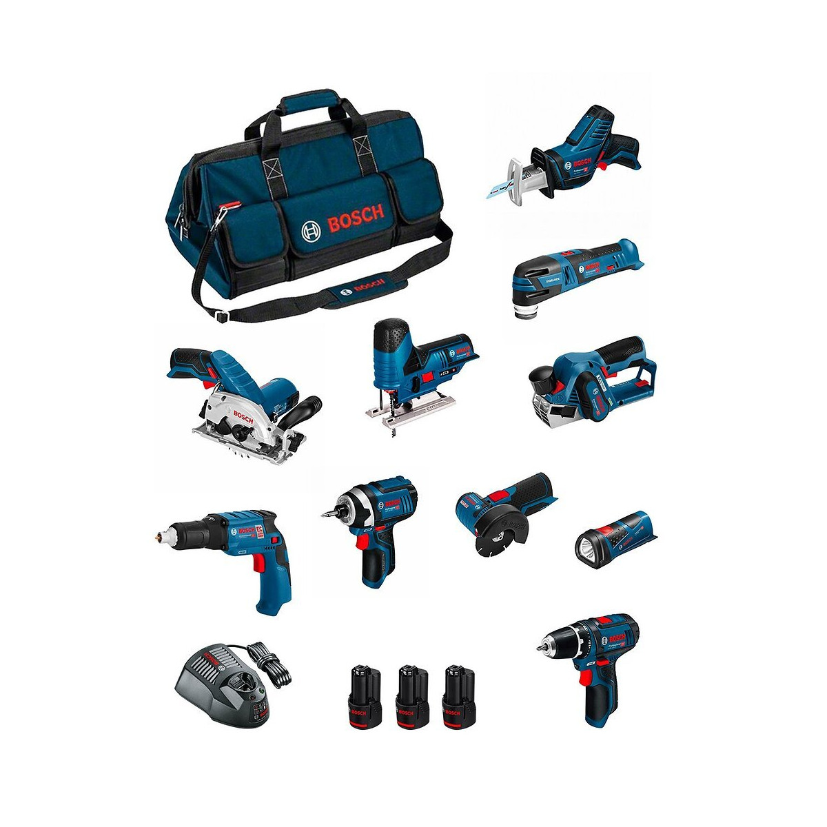BOSCH Kit 12V BMKB10-28CD3 Perceuse-Visseuse BOSCH GSR 12V-15 Professional - Sa conception extrêmement réduite de 169 mm offre pour une prise en main optimale notamment lors des travaux de vissage et perçage en hauteur et dans les endroits difficiles d'accès - Performance professionnelle : son engrenage 2 vitesses garantit un couple puissant de 15 Nm (matériaux tendres), pour le perçage (jusqu'à 19 mm) et le vissage (jusqu'à 7 mm) - Mandrin Auto-Lock 10 mm - Éclairage LED intégré pour éclairer la zone de travail, même dans les endroits sombres Visseuse Plaquiste BOSCH GTB 12V-11 Professional - Conception légère et compacte de 0,9 kg avec batterie et poignée ergonomique, pour une prise en main confortable dans les espaces restreints - Moteur puissant et compact de 12V pour visser 1200 vis par charge de batterie - Moteur Brushless Bosch avec Electronic Motor Protection et frein moteur pour une grande longévité - Conçue pour fixer les vis de construction sèches dans des matériaux tels que le bois et le métal, bien qu'il soit également optimisé pour les plaques de plâtre - Comprend Autolock, butée de profondeur interchangeable, mode inverse et sélection de la vitesse - Compatible avec toutes les batteries et chargeurs Bosch Professional 12V (système Professional 12V) Visseuse à Chocs BOSCH GDR 12V-105 Professional - Avec 137 mm, elle est la plus compacte de la catégorie 12 V. Elle assure une prise en main optimale notamment lors des travaux de vissage en hauteur et dans les endroits difficiles d'accès - Couple remarquable (105 Nm) suffisant pour 80 % des applications courantes dans le métal et le béton - Résultats parfaits grâce à la présélection de vitesse pour les applications nécessitant une vitesse adaptée au matériau - Réversibilité gauche/droite pour visser et dévisser - Très bonne maniabilité de la visseuse grâce à sa poignée antidérapante Soft Grip - Eclairage LED intégré pour illuminer la zone de travail, même dans les coins sombres Meuleuse d'Angle BOSCH GWS 12V-76 Professional - Maniable dans chaque situation: extrêmement compacte et ergonomique pour un tronçonnage rapide sur les chantiers - Progression de travail rapide grâce au puissant moteur EC sans charbon - Usage polyvalent dans de nombreux matériaux Scie Sauteuse BOSCH GST 12V-70 Professional - Scie Sauteuse de 12 V compacte à poignée étrier - Poignée champignon, grande légèreté et forme compacte pour un maniement parfait même lors de la réalisation de coupes par en dessous - Poignée très proche de la ligne de coupe pour une prise en main parfaite en cours d'utilisation - Changement de lame facile et sans clé grâce au système SDS Bosch - Conçue pour les coupes courbes et transversales ainsi que pour les applications peu et moyennement exigeantes dans le bois massif, les panneaux agglomérés et les bois composites - Permet aussi de réaliser des coupes biaises et dispose de la fonction Constant Speed, d'un éclairage LED, d'un mouvement orbital, du système de guidage Precision Control et d'une présélection de vitesse - Compatible avec le système d'aspiration de poussières Click & Clean Bosch et d'autres aspirateurs Bosch ainsi qu'avec toutes les batteries et tous les chargeurs 12 V de Bosch Professional (Professional 12V System) Scie Circulaire BOSCH GKS 12V-26 Professional - La plus compacte des Scies Circulaires universelles professionnelles - La scie la plus compacte de sa catégorie pour une maniabilité parfaite et de nombreuses possibilités d'utilisation dans le bois - Ergonomie excellente : poignée fine et faible poids (1.4 kg seulement) pour un confort de travail maximal - Témoin de niveau de charge pratique : indique à tout moment les réserves d'énergie restantes - Système d'aspiration Bosch Outil Multifonction BOSCH GOP 12V-28 Professional - L'Outil Multifonction sans-fil le plus compact de la gamme Starlock Bosch - Interface Starlock avec système d'accroche en étoile pour une transmission optimale du couple entre l'outil et l'accessoire - Moteur BRUSHLESS : plus endurant, autonomie accrue, plus de puissance grâce au moteur sans charbon - Présélection de vitesse : des résultats parfaits pour les applications nécessitant une vitesse adaptée au matériau - Poignée très fine pour une prise en main très ergonomique et agréable - Grande légèreté pour une bonne maniabilité et un grand confort d'utilisation Scie Sabre BOSCH GSA 12V-14 Professional - La scie la plus compacte de sa catégorie pour une maniabilité parfaite et de nombreuses possibilités d'utilisation dans le bois, le métal et le plastique - Résultats parfaits grâce à la présélection de vitesse pour les applications nécessitant une vitesse adaptée au matériau - Ergonomie excellente : poignée fine et faible poids (1,2 kg seulement) pour un confort de travail maximal - Eclairage LED intégré pour illuminer la zone de travail, même dans les coins sombres Lampe LED BOSCH GLI 12V-80 Professional - Technologie LED à économie d'énergie permettant d'éclairer pendant toute une journée - Forme ergonomique et zones préhension à revêtement softgrip pour une bonne prise en main - Cette lampe torche classique est idéale pour éclairer de petits espaces ou des endroits exigus - Compatible avec toutes les batteries 12 V de Bosch Professional (Professional 12V System) Rabot BOSCH GHO 12V-20 Professional - Le premier Rabot professionnel 12 V avec une facilité de guidage inédite - Équilibrage optimisé pour un grand confort d'utilisation et une prise en main ergonomique - Grande compacité grâce au moteur EC sans charbon et au système 12 V - Grande liberté de mouvement et une utilisation facile dans toutes les positions de travail grâce à l'absence de fil - Conçu pour le rabotage du bois - Compatible avec toutes les batteries et tous les chargeurs 12 V de Bosch Professional (Professional 12V System) ainsi qu'avec les sacs à poussière et le systè