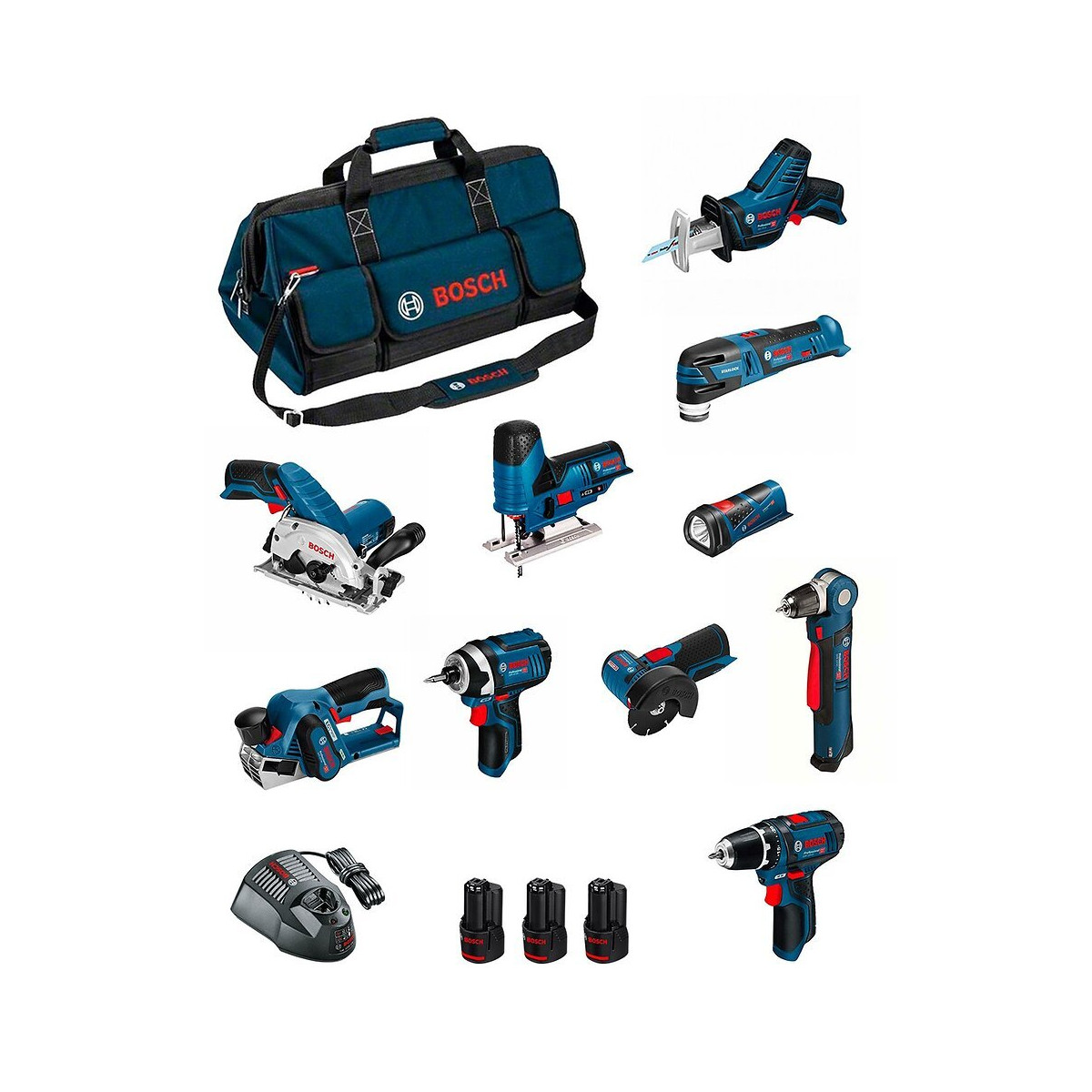 BOSCH Kit 12V BMKB10-28DD3 Perceuse-Visseuse BOSCH GSR 12V-15 Professional - Sa conception extrêmement réduite de 169 mm offre pour une prise en main optimale notamment lors des travaux de vissage et perçage en hauteur et dans les endroits difficiles d'accès - Performance professionnelle : son engrenage 2 vitesses garantit un couple puissant de 15 Nm (matériaux tendres), pour le perçage (jusqu'à 19 mm) et le vissage (jusqu'à 7 mm) - Mandrin Auto-Lock 10 mm - Éclairage LED intégré pour éclairer la zone de travail, même dans les endroits sombres Visseuse à Chocs BOSCH GDR 12V-105 Professional - Avec 137 mm, elle est la plus compacte de la catégorie 12 V. Elle assure une prise en main optimale notamment lors des travaux de vissage en hauteur et dans les endroits difficiles d'accès - Couple remarquable (105 Nm) suffisant pour 80 % des applications courantes dans le métal et le béton - Résultats parfaits grâce à la présélection de vitesse pour les applications nécessitant une vitesse adaptée au matériau - Réversibilité gauche/droite pour visser et dévisser - Très bonne maniabilité de la visseuse grâce à sa poignée antidérapante Soft Grip - Eclairage LED intégré pour illuminer la zone de travail, même dans les coins sombres Scie Circulaire BOSCH GKS 12V-26 Professional - La plus compacte des Scies Circulaires universelles professionnelles - La scie la plus compacte de sa catégorie pour une maniabilité parfaite et de nombreuses possibilités d'utilisation dans le bois - Ergonomie excellente : poignée fine et faible poids (1.4 kg seulement) pour un confort de travail maximal - Témoin de niveau de charge pratique : indique à tout moment les réserves d'énergie restantes - Système d'aspiration Bosch Meuleuse d'Angle BOSCH GWS 12V-76 Professional - Maniable dans chaque situation: extrêmement compacte et ergonomique pour un tronçonnage rapide sur les chantiers - Progression de travail rapide grâce au puissant moteur EC sans charbon - Usage polyvalent dans de nombreux matériaux Scie Sauteuse BOSCH GST 12V-70 Professional - Scie Sauteuse de 12 V compacte à poignée étrier - Poignée champignon, grande légèreté et forme compacte pour un maniement parfait même lors de la réalisation de coupes par en dessous - Poignée très proche de la ligne de coupe pour une prise en main parfaite en cours d'utilisation - Changement de lame facile et sans clé grâce au système SDS Bosch - Conçue pour les coupes courbes et transversales ainsi que pour les applications peu et moyennement exigeantes dans le bois massif, les panneaux agglomérés et les bois composites - Permet aussi de réaliser des coupes biaises et dispose de la fonction Constant Speed, d'un éclairage LED, d'un mouvement orbital, du système de guidage Precision Control et d'une présélection de vitesse - Compatible avec le système d'aspiration de poussières Click & Clean Bosch et d'autres aspirateurs Bosch ainsi qu'avec toutes les batteries et tous les chargeurs 12 V de Bosch Professional (Professional 12V System) Outil Multifonction BOSCH GOP 12V-28 Professional - L'Outil Multifonction sans-fil le plus compact de la gamme Starlock Bosch - Interface Starlock avec système d'accroche en étoile pour une transmission optimale du couple entre l'outil et l'accessoire - Moteur BRUSHLESS : plus endurant, autonomie accrue, plus de puissance grâce au moteur sans charbon - Présélection de vitesse : des résultats parfaits pour les applications nécessitant une vitesse adaptée au matériau - Poignée très fine pour une prise en main très ergonomique et agréable - Grande légèreté pour une bonne maniabilité et un grand confort d'utilisation Scie Sabre BOSCH GSA 12V-14 Professional - La scie la plus compacte de sa catégorie pour une maniabilité parfaite et de nombreuses possibilités d'utilisation dans le bois, le métal et le plastique - Résultats parfaits grâce à la présélection de vitesse pour les applications nécessitant une vitesse adaptée au matériau - Ergonomie excellente : poignée fine et faible poids (1,2 kg seulement) pour un confort de travail maximal - Eclairage LED intégré pour illuminer la zone de travail, même dans les coins sombres Perceuse d'Angle BOSCH GWB 12V-10 Professional - Très grande polyvalence grâce à sa tête orientable dans 5 positions : 0° / 22.5° / 45° / 67.5° / 90° - Très compacte : tête orientable extrêmement courte (seulement 11 cm) avec mandrin Auto-Lock de 10 mm - Régime élevé de 0 à 1300 trs/min pour une progression rapide, idéal pour les perçages Lampe LED BOSCH GLI 12V-80 Professional - Technologie LED à économie d'énergie permettant d'éclairer pendant toute une journée - Forme ergonomique et zones préhension à revêtement softgrip pour une bonne prise en main - Cette lampe torche classique est idéale pour éclairer de petits espaces ou des endroits exigus - Compatible avec toutes les batteries 12 V de Bosch Professional (Professional 12V System) Rabot BOSCH GHO 12V-20 Professional - Le premier Rabot professionnel 12 V avec une facilité de guidage inédite - Équilibrage optimisé pour un grand confort d'utilisation et une prise en main ergonomique - Grande compacité grâce au moteur EC sans charbon et au système 12 V - Grande liberté de mouvement et une utilisation facile dans toutes les positions de travail grâce à l'absence de fil - Conçu pour le rabotage du bois - Compatible avec toutes les batteries et tous les chargeurs 12 V de Bosch Professional (Professional 12V System) ainsi qu'avec les sacs à poussière et le système d'aspiration de poussières Click & Clean