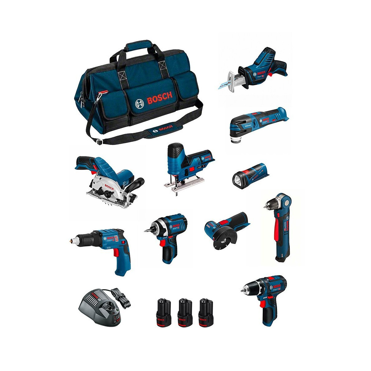 BOSCH Kit 12V BMKB10-28AD3 Perceuse-Visseuse BOSCH GSR 12V-15 Professional - Sa conception extrêmement réduite de 169 mm offre pour une prise en main optimale notamment lors des travaux de vissage et perçage en hauteur et dans les endroits difficiles d'accès - Performance professionnelle : son engrenage 2 vitesses garantit un couple puissant de 15 Nm (matériaux tendres), pour le perçage (jusqu'à 19 mm) et le vissage (jusqu'à 7 mm) - Mandrin Auto-Lock 10 mm - Éclairage LED intégré pour éclairer la zone de travail, même dans les endroits sombres Visseuse à Chocs BOSCH GDR 12V-105 Professional - Avec 137 mm, elle est la plus compacte de la catégorie 12 V. Elle assure une prise en main optimale notamment lors des travaux de vissage en hauteur et dans les endroits difficiles d'accès - Couple remarquable (105 Nm) suffisant pour 80 % des applications courantes dans le métal et le béton - Résultats parfaits grâce à la présélection de vitesse pour les applications nécessitant une vitesse adaptée au matériau - Réversibilité gauche/droite pour visser et dévisser - Très bonne maniabilité de la visseuse grâce à sa poignée antidérapante Soft Grip - Eclairage LED intégré pour illuminer la zone de travail, même dans les coins sombres Scie Circulaire BOSCH GKS 12V-26 Professional - La plus compacte des Scies Circulaires universelles professionnelles - La scie la plus compacte de sa catégorie pour une maniabilité parfaite et de nombreuses possibilités d'utilisation dans le bois - Ergonomie excellente : poignée fine et faible poids (1.4 kg seulement) pour un confort de travail maximal - Témoin de niveau de charge pratique : indique à tout moment les réserves d'énergie restantes - Système d'aspiration Bosch Meuleuse d'Angle BOSCH GWS 12V-76 Professional - Maniable dans chaque situation: extrêmement compacte et ergonomique pour un tronçonnage rapide sur les chantiers - Progression de travail rapide grâce au puissant moteur EC sans charbon - Usage polyvalent dans de nombreux matériaux Scie Sauteuse BOSCH GST 12V-70 Professional - Scie Sauteuse de 12 V compacte à poignée étrier - Poignée champignon, grande légèreté et forme compacte pour un maniement parfait même lors de la réalisation de coupes par en dessous - Poignée très proche de la ligne de coupe pour une prise en main parfaite en cours d'utilisation - Changement de lame facile et sans clé grâce au système SDS Bosch - Conçue pour les coupes courbes et transversales ainsi que pour les applications peu et moyennement exigeantes dans le bois massif, les panneaux agglomérés et les bois composites - Permet aussi de réaliser des coupes biaises et dispose de la fonction Constant Speed, d'un éclairage LED, d'un mouvement orbital, du système de guidage Precision Control et d'une présélection de vitesse - Compatible avec le système d'aspiration de poussières Click & Clean Bosch et d'autres aspirateurs Bosch ainsi qu'avec toutes les batteries et tous les chargeurs 12 V de Bosch Professional (Professional 12V System) Outil Multifonction BOSCH GOP 12V-28 Professional - L'Outil Multifonction sans-fil le plus compact de la gamme Starlock Bosch - Interface Starlock avec système d'accroche en étoile pour une transmission optimale du couple entre l'outil et l'accessoire - Moteur BRUSHLESS : plus endurant, autonomie accrue, plus de puissance grâce au moteur sans charbon - Présélection de vitesse : des résultats parfaits pour les applications nécessitant une vitesse adaptée au matériau - Poignée très fine pour une prise en main très ergonomique et agréable - Grande légèreté pour une bonne maniabilité et un grand confort d'utilisation Scie Sabre BOSCH GSA 12V-14 Professional - La scie la plus compacte de sa catégorie pour une maniabilité parfaite et de nombreuses possibilités d'utilisation dans le bois, le métal et le plastique - Résultats parfaits grâce à la présélection de vitesse pour les applications nécessitant une vitesse adaptée au matériau - Ergonomie excellente : poignée fine et faible poids (1,2 kg seulement) pour un confort de travail maximal - Eclairage LED intégré pour illuminer la zone de travail, même dans les coins sombres Perceuse d'Angle BOSCH GWB 12V-10 Professional - Très grande polyvalence grâce à sa tête orientable dans 5 positions : 0° / 22.5° / 45° / 67.5° / 90° - Très compacte : tête orientable extrêmement courte (seulement 11 cm) avec mandrin Auto-Lock de 10 mm - Régime élevé de 0 à 1300 trs/min pour une progression rapide, idéal pour les perçages Lampe LED BOSCH GLI 12V-80 Professional - Technologie LED à économie d'énergie permettant d'éclairer pendant toute une journée - Forme ergonomique et zones préhension à revêtement softgrip pour une bonne prise en main - Cette lampe torche classique est idéale pour éclairer de petits espaces ou des endroits exigus - Compatible avec toutes les batteries 12 V de Bosch Professional (Professional 12V System) Visseuse Plaquiste BOSCH GTB 12V-11 Professional - Conception légère et compacte de 0,9 kg avec batterie et poignée ergonomique, pour une prise en main confortable dans les espaces restreints - Moteur puissant et compact de 12V pour visser 1200 vis par charge de batterie - Moteur Brushless Bosch avec Electronic Motor Protection et frein moteur pour une grande longévité - Conçue pour fixer les vis de construction sèches dans des matériaux tels que le bois et le métal, bien qu'il soit également optimisé pour les plaques de plâtre - Comprend Autolock, butée de profondeur interchangeable, mode inverse et sélection de la vitesse - Compatible avec toutes les batteries et chargeurs Bosch Professional 12V (système Professional 12V)