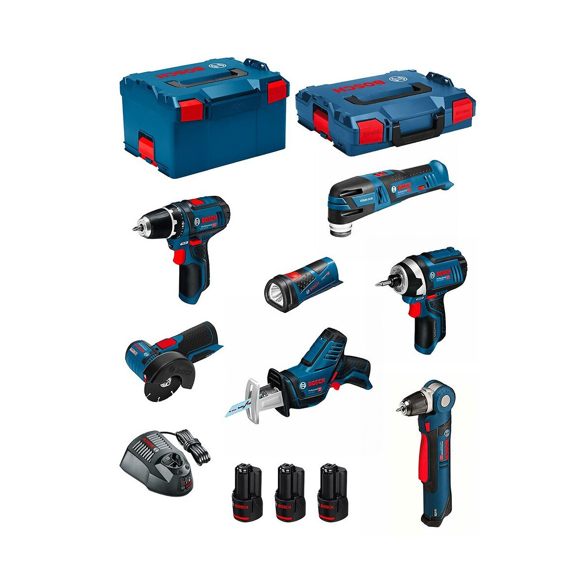 BOSCH Kit 12V BMK7-28CD3 Perceuse-Visseuse BOSCH GSR 12V-15 Professional - Sa conception extrêmement réduite de 169 mm offre pour une prise en main optimale notamment lors des travaux de vissage et perçage en hauteur et dans les endroits difficiles d'accès - Performance professionnelle : son engrenage 2 vitesses garantit un couple puissant de 15 Nm (matériaux tendres), pour le perçage (jusqu'à 19 mm) et le vissage (jusqu'à 7 mm) - Mandrin Auto-Lock 10 mm - Éclairage LED intégré pour éclairer la zone de travail, même dans les endroits sombres Visseuse à Chocs BOSCH GDR 12V-105 Professional - Avec 137 mm, elle est la plus compacte de la catégorie 12 V. Elle assure une prise en main optimale notamment lors des travaux de vissage en hauteur et dans les endroits difficiles d'accès - Couple remarquable (105 Nm) suffisant pour 80 % des applications courantes dans le métal et le béton - Résultats parfaits grâce à la présélection de vitesse pour les applications nécessitant une vitesse adaptée au matériau - Réversibilité gauche/droite pour visser et dévisser - Très bonne maniabilité de la visseuse grâce à sa poignée antidérapante Soft Grip - Eclairage LED intégré pour illuminer la zone de travail, même dans les coins sombres Perceuse d'Angle BOSCH GWB 12V-10 Professional - Très grande polyvalence grâce à sa tête orientable dans 5 positions : 0° / 22.5° / 45° / 67.5° / 90° - Très compacte : tête orientable extrêmement courte (seulement 11 cm) avec mandrin Auto-Lock de 10 mm - Régime élevé de 0 à 1300 trs/min pour une progression rapide, idéal pour les perçages Meuleuse d'Angle BOSCH GWS 12V-76 Professional - Maniable dans chaque situation: extrêmement compacte et ergonomique pour un tronçonnage rapide sur les chantiers - Progression de travail rapide grâce au puissant moteur EC sans charbon - Usage polyvalent dans de nombreux matériaux Outil Multifonction BOSCH GOP 12V-28 Professional - L'Outil Multifonction sans-fil le plus compact de la gamme Starlock Bosch - Interface Starlock avec système d'accroche en étoile pour une transmission optimale du couple entre l'outil et l'accessoire - Moteur BRUSHLESS : plus endurant, autonomie accrue, plus de puissance grâce au moteur sans charbon - Présélection de vitesse : des résultats parfaits pour les applications nécessitant une vitesse adaptée au matériau - Poignée très fine pour une prise en main très ergonomique et agréable - Grande légèreté pour une bonne maniabilité et un grand confort d'utilisation Scie Sabre BOSCH GSA 12V-14 Professional - La scie la plus compacte de sa catégorie pour une maniabilité parfaite et de nombreuses possibilités d'utilisation dans le bois, le métal et le plastique - Résultats parfaits grâce à la présélection de vitesse pour les applications nécessitant une vitesse adaptée au matériau - Ergonomie excellente : poignée fine et faible poids (1,2 kg seulement) pour un confort de travail maximal - Eclairage LED intégré pour illuminer la zone de travail, même dans les coins sombres Lampe LED BOSCH GLI 12V-80 Professional - Technologie LED à économie d'énergie permettant d'éclairer pendant toute une journée - Forme ergonomique et zones préhension à revêtement softgrip pour une bonne prise en main - Cette lampe torche classique est idéale pour éclairer de petits espaces ou des endroits exigus - Compatible avec toutes les batteries 12 V de Bosch Professional (Professional 12V System)