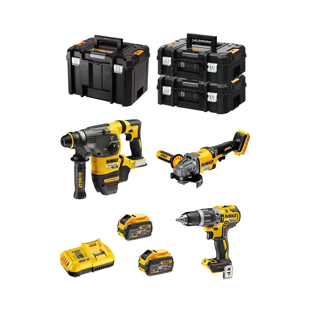 DeWALT Kit FVK381X2-QW 54V/18V Perforateur-Burineur DeWALT DCH333 FlexVolt - Performance de perçage à grande vitesse de premier niveau, plus de 66 trous (Ø 18 x 80 mm) par charge - Stop de rotation pour les travaux de burinage légers dans du plâtre et des tuiles, et un stop impact pour seulement un mode rotation pour percer du bois ou du métal - Moteur Brushless pour plus d'autonomie et moins de maintenance - Perform & Protect: meilleur de sa catégorie en termes de vibration (8,5 m/s²), pour réduire la fatigue de l'utilisateur - Eclairage LED puissant avec temporisation améliorant la visibilité - Idéal pour le perçage de trous d'ancrage dans le béton, la brique et les divers matériaux de construction de 4 à 30 mm - Design compact, léger et ergonomique pour un meilleur confort et support durant les périodes d'utilisation prolongées Perceuse à Percussion DeWALT DCD796 - Moteur avec technologie BRUSHLESS pour une efficacité optimale - Design compact, léger et ergonomique pour un meilleur confort et support durant les périodes d'utilisation prolongées et se glisse dans les petits espaces - Mode percussion pour percer les matériaux durs (brique, béton etc..) - 2 vitesses et engrenage entièrement métallique pour assurer une transmission efficace et une durabilité à toute épreuve - 15 réglages de couple différents pour une précision optimale - Gâchette intelligente efficace permettant un contrôle total sur toutes les applications - Eclairage LED 3 positions (haut/moyen/bas) avec une fonction de retardateur pour une meilleure visibilité et une fonctionnalité de torche - Poignée avec Grip ergonomique conçu pour améliorer le contrôle et le confort - Clip ceinture permettant d'accrocher la machine à la ceinture pour effectuer des applications Meuleuse DeWALT DCG414 FlexVolt - L'engrenage conique en acier permet d'augmenter considérablement la durabilité de l'outil - Cette conception assure également un niveau extrêmement faibles des vibrations - Blocage d'arbre pour changer facilement et rapidement de disque - Interrupteur à gâchette, système anti-redémarrage pour plus de contrôle et de sécurité - Carter réglable sans clé pour une grande polyvalence - Poignée latérale à deux positions, pour plus de confort et une meilleure maîtrise - Boîte d'engrenage dissipant bien la chaleur, pour une plus grande longévité