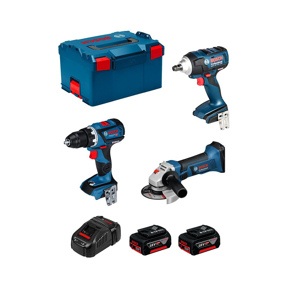 BOSCH Kit PSL3P2MC Perceuse-Visseuse BOSCH GSR 18V-60 C Professional - Personnalisation possible de certaines fonctions, telles que le réglage de l'embrayage de précision, à partir d'un smartphone pour une adaptation parfaite aux besoins - Possibilité de réglage à distance de la sensibilité du système KickBack Control - Compatible avec TrackMyTools, le système Bosch intelligent de gestion d'inventaire Clé à Chocs BOSCH GDS 18 V-EC 250 Professional - Couple de 250 Nm pour des applications hautes performances - Propulsé par le moteur Bosch EC pour une autonomie et une durée de vie plus longues - Maintenance simple des composants à remplacer fréquemment - Clip de ceinture pour une grande mobilité - Visseuse légère et compacte pour une manipulation facile - Conception de poignée mince et ergonomique pour un travail sans fatigue - L'éclairage LED offre un environnement de travail lumineux Meuleuse BOSCH GWS 18-125 V-LI Professional - La Meuleuse d'Angle de 18V la plus puissante - Capacité d'abrasion et capacité de coupe les plus élevées de sa catégorie par charge de batterie - Moteur 4 pôles hautes performances extrêmement robuste et endurant pour une longévité élevée - Forme compacte et poids léger (seulement 2.3 kg) pour un grand confort de travail, surtout dans les endroits difficiles d'accès et pour les travaux en hauteur