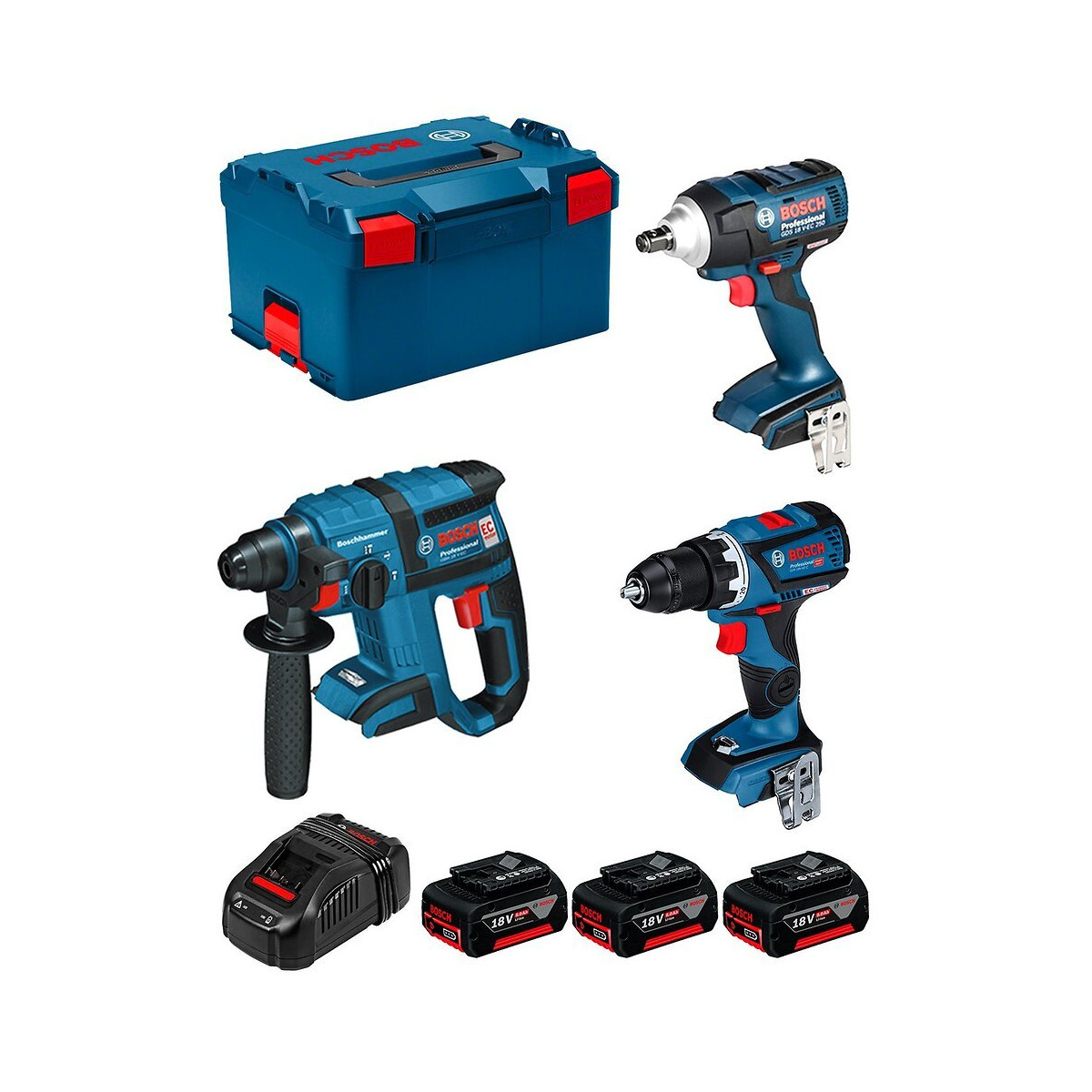 BOSCH Kit ECL3P3CEC Perceuse-Visseuse BOSCH GSR 18V-60 C Professional - Personnalisation possible de certaines fonctions, telles que le réglage de l'embrayage de précision, à partir d'un smartphone pour une adaptation parfaite aux besoins - Possibilité de réglage à distance de la sensibilité du système KickBack Control - Compatible avec TrackMyTools, le système Bosch intelligent de gestion d'inventaire Clé à Chocs BOSCH GDS 18 V-EC 250 Professional - Couple de 250 Nm pour des applications hautes performances - Propulsé par le moteur Bosch EC pour une autonomie et une durée de vie plus longues - Maintenance simple des composants à remplacer fréquemment - Clip de ceinture pour une grande mobilité - Visseuse légère et compacte pour une manipulation facile - Conception de poignée mince et ergonomique pour un travail sans fatigue - L'éclairage LED offre un environnement de travail lumineux Perforateur BOSCH GBH 18 V-EC Professional - Modèle au meilleur rapport poids/performance de la gamme des Perforateurs sans-fil SDS plus Bosch de 18 V - Conception compacte et légère permettant d'effectuer des perçages en hauteur - Longévité élevée grâce à des composants robustes et au moteur EC Brushless - Conçu pour les applications de perçage et burinage dans le béton, la maçonnerie, le bois et le métal - Dispose également d'une électronique de protection du moteur (EMP), d'un éclairage LED, d'un embrayage de sécurité, d'un variateur de vitesse et de la fonction Vario Lock - Compatible avec divers dispositifs d'aspiration de poussière ainsi qu'avec toutes les batteries et tous les chargeurs 18 V de Bosch Professional (Professional 18V System)
