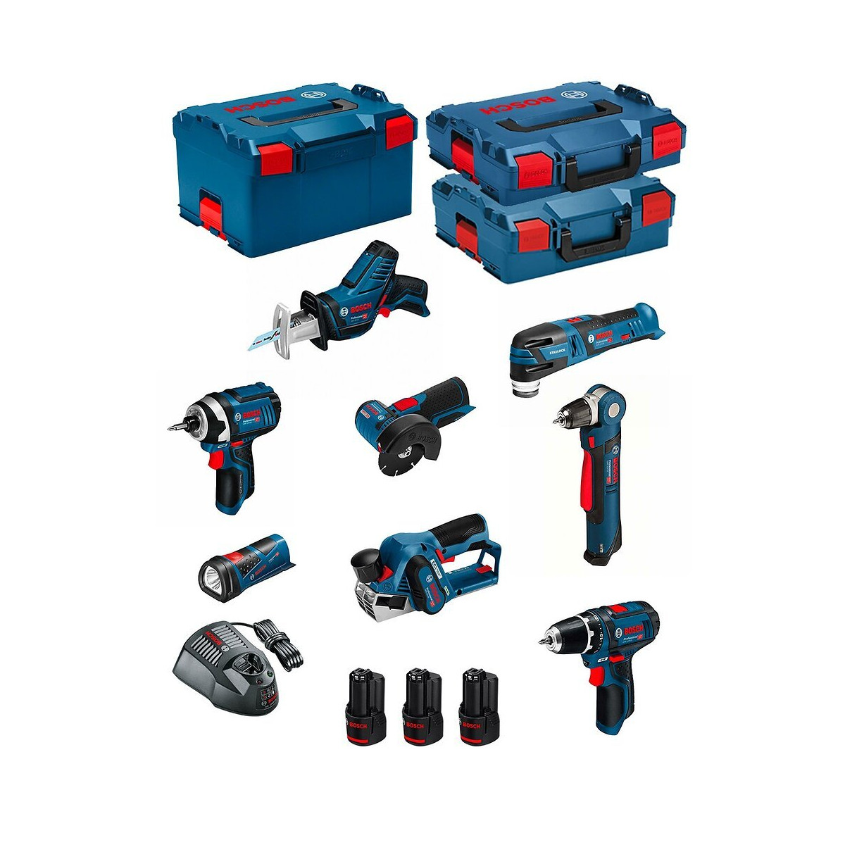 BOSCH Kit 12V BMK8-28ED3 Perceuse-Visseuse BOSCH GSR 12V-15 Professional - Sa conception extrêmement réduite de 169 mm offre pour une prise en main optimale notamment lors des travaux de vissage et perçage en hauteur et dans les endroits difficiles d'accès - Performance professionnelle : son engrenage 2 vitesses garantit un couple puissant de 15 Nm (matériaux tendres), pour le perçage (jusqu'à 19 mm) et le vissage (jusqu'à 7 mm) - Mandrin Auto-Lock 10 mm - Éclairage LED intégré pour éclairer la zone de travail, même dans les endroits sombres Visseuse à Chocs BOSCH GDR 12V-105 Professional - Avec 137 mm, elle est la plus compacte de la catégorie 12 V. Elle assure une prise en main optimale notamment lors des travaux de vissage en hauteur et dans les endroits difficiles d'accès - Couple remarquable (105 Nm) suffisant pour 80 % des applications courantes dans le métal et le béton - Résultats parfaits grâce à la présélection de vitesse pour les applications nécessitant une vitesse adaptée au matériau - Réversibilité gauche/droite pour visser et dévisser - Très bonne maniabilité de la visseuse grâce à sa poignée antidérapante Soft Grip - Eclairage LED intégré pour illuminer la zone de travail, même dans les coins sombres Perceuse d'Angle BOSCH GWB 12V-10 Professional - Très grande polyvalence grâce à sa tête orientable dans 5 positions : 0° / 22.5° / 45° / 67.5° / 90° - Très compacte : tête orientable extrêmement courte (seulement 11 cm) avec mandrin Auto-Lock de 10 mm - Régime élevé de 0 à 1300 trs/min pour une progression rapide, idéal pour les perçages Meuleuse d'Angle BOSCH GWS 12V-76 Professional - Maniable dans chaque situation: extrêmement compacte et ergonomique pour un tronçonnage rapide sur les chantiers - Progression de travail rapide grâce au puissant moteur EC sans charbon - Usage polyvalent dans de nombreux matériaux Outil Multifonction BOSCH GOP 12V-28 Professional - L'Outil Multifonction sans-fil le plus compact de la gamme Starlock Bosch - Interface Starlock avec système d'accroche en étoile pour une transmission optimale du couple entre l'outil et l'accessoire - Moteur BRUSHLESS : plus endurant, autonomie accrue, plus de puissance grâce au moteur sans charbon - Présélection de vitesse : des résultats parfaits pour les applications nécessitant une vitesse adaptée au matériau - Poignée très fine pour une prise en main très ergonomique et agréable - Grande légèreté pour une bonne maniabilité et un grand confort d'utilisation Scie Sabre BOSCH GSA 12V-14 Professional - La scie la plus compacte de sa catégorie pour une maniabilité parfaite et de nombreuses possibilités d'utilisation dans le bois, le métal et le plastique - Résultats parfaits grâce à la présélection de vitesse pour les applications nécessitant une vitesse adaptée au matériau - Ergonomie excellente : poignée fine et faible poids (1,2 kg seulement) pour un confort de travail maximal - Eclairage LED intégré pour illuminer la zone de travail, même dans les coins sombres Lampe LED BOSCH GLI 12V-80 Professional - Technologie LED à économie d'énergie permettant d'éclairer pendant toute une journée - Forme ergonomique et zones préhension à revêtement softgrip pour une bonne prise en main - Cette lampe torche classique est idéale pour éclairer de petits espaces ou des endroits exigus - Compatible avec toutes les batteries 12 V de Bosch Professional (Professional 12V System) Rabot BOSCH GHO 12V-20 Professional - Le premier Rabot professionnel 12 V avec une facilité de guidage inédite - Équilibrage optimisé pour un grand confort d'utilisation et une prise en main ergonomique - Grande compacité grâce au moteur EC sans charbon et au système 12 V - Grande liberté de mouvement et une utilisation facile dans toutes les positions de travail grâce à l'absence de fil - Conçu pour le rabotage du bois - Compatible avec toutes les batteries et tous les chargeurs 12 V de Bosch Professional (Professional 12V System) ainsi qu'avec les sacs à poussière et le système d'aspiration de poussières Click & Clean