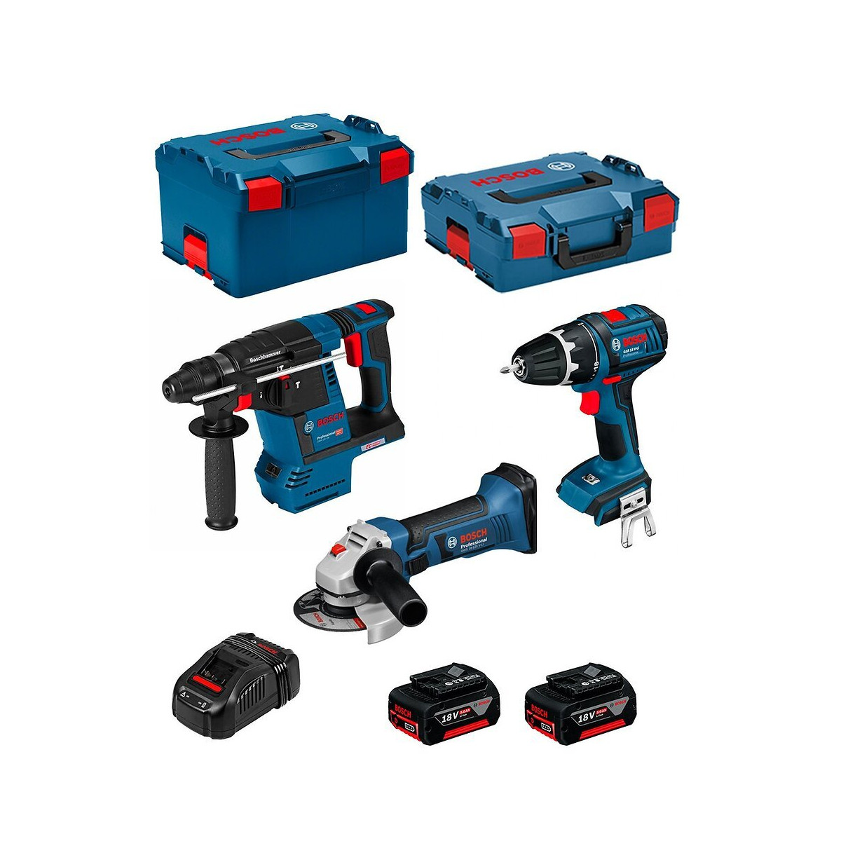 BOSCH Kit PSL3P3C Perforateur BOSCH GBH 18V-26 F Professional - Perforateur universel avec mandrin interchangeable de la gamme des perforateurs sans-fil SDS plus - Fonction KickBack Control et électronique EPC (Electronic Precision Control) pour une meilleure maîtrise de l'outil et une meilleure protection de l'utilisateur - Force de frappe de 2,6 J pour une progression de perçage rapide et une capacité de burinage élevée - Conçu pour les applications de perçage et burinage dans le béton, la maçonnerie, le bois et le métal - Dispose également de la fonction Constant Speed, d'un moteur sans charbon, d'une électronique de protection du moteur (EMP), d'un éclairage LED, d'un embrayage de sécurité, d'un variateur de vitesse, de la fonction Vario Lock et du système Vibration Control - Compatible avec divers dispositifs d'aspiration de poussière ainsi qu'avec toutes les batteries et tous les chargeurs 18 V de Bosch Professional (Professional 18V System) Perceuse à Percussion BOSCH GSB 18 V-LI Professional - Extrêmement compacte grâce à sa conception courte (seulement 195 mm) et encore plus légère (seulement 1,9 kg) pour une manipulation parfaite - Système Bosch ECP (Electronic Cell Protection) : protège la batterie contre la surcharge, l'échauffement et la décharge totale - Lumière LED intégrée pour l'éclairage de la zone de travail, même dans les endroits sombres - Clip de ceinture pratique pour accrocher les outils confortablement sur la ceinture ou l'échelle - Les batteries COOLPACK innovantes garantissent une dissipation thermique optimale et prolongent ainsi la durée de vie jusqu'à 100% (voir batteries lithium sans COOLPACK) - Frein moteur pour des travaux de serrage en série précis - Poignée ergonomique à longue prise et poignée anti-vibration Softgrip pour un travail sans effort Meuleuse BOSCH GWS 18-125 V-LI Professional - La Meuleuse d'Angle de 18V la plus puissante - Capacité d'abrasion et capacité de coupe les plus élevées de sa catégorie par charge de batterie - Moteur 4 pôles hautes performances extrêmement robuste et endurant pour une longévité élevée - Forme compacte et poids léger (seulement 2.3 kg) pour un grand confort de travail, surtout dans les endroits difficiles d'accès et pour les travaux en hauteur
