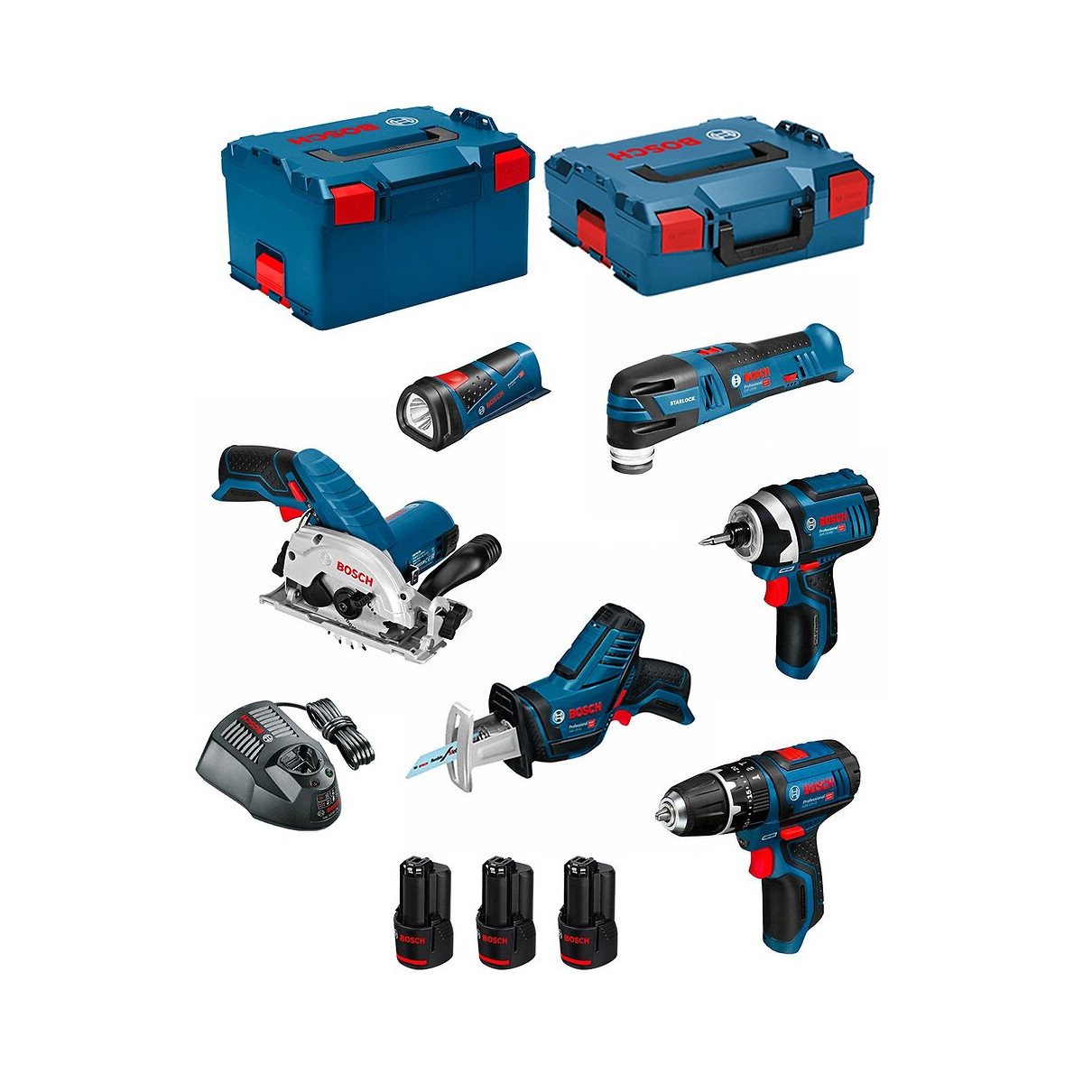 BOSCH Kit 12V BMK6-28BD3 Perceuse à Percussion BOSCH GSB 12V-15 Professional - Avec 189 mm, c'est la perceuse-visseuse la plus compacte de sa catégorie garantissant ainsi une prise en main optimale notamment lors des travaux de vissage et perçage en hauteur et dans les endroits difficiles d'accès - Engrenage 2 vitesses pour les applications de vissage et de perçage difficiles dans le bois et le métal et de percussion dans la maçonnerie - Mandrin Auto-Lock 10 mm Visseuse à Chocs BOSCH GDR 12V-105 Professional - Avec 137 mm, elle est la plus compacte de la catégorie 12 V. Elle assure une prise en main optimale notamment lors des travaux de vissage en hauteur et dans les endroits difficiles d'accès - Couple remarquable (105 Nm) suffisant pour 80 % des applications courantes dans le métal et le béton - Résultats parfaits grâce à la présélection de vitesse pour les applications nécessitant une vitesse adaptée au matériau - Réversibilité gauche/droite pour visser et dévisser - Très bonne maniabilité de la visseuse grâce à sa poignée antidérapante Soft Grip - Eclairage LED intégré pour illuminer la zone de travail, même dans les coins sombres Scie Circulaire BOSCH GKS 12V-26 Professional - La plus compacte des Scies Circulaires universelles professionnelles - La scie la plus compacte de sa catégorie pour une maniabilité parfaite et de nombreuses possibilités d'utilisation dans le bois - Ergonomie excellente : poignée fine et faible poids (1.4 kg seulement) pour un confort de travail maximal - Témoin de niveau de charge pratique : indique à tout moment les réserves d'énergie restantes - Système d'aspiration Bosch Outil Multifonction BOSCH GOP 12V-28 Professional - L'Outil Multifonction sans-fil le plus compact de la gamme Starlock Bosch - Interface Starlock avec système d'accroche en étoile pour une transmission optimale du couple entre l'outil et l'accessoire - Moteur BRUSHLESS : plus endurant, autonomie accrue, plus de puissance grâce au moteur sans charbon - Présélection de vitesse : des résultats parfaits pour les applications nécessitant une vitesse adaptée au matériau - Poignée très fine pour une prise en main très ergonomique et agréable - Grande légèreté pour une bonne maniabilité et un grand confort d'utilisation Scie Sabre BOSCH GSA 12V-14 Professional - La scie la plus compacte de sa catégorie pour une maniabilité parfaite et de nombreuses possibilités d'utilisation dans le bois, le métal et le plastique - Résultats parfaits grâce à la présélection de vitesse pour les applications nécessitant une vitesse adaptée au matériau - Ergonomie excellente : poignée fine et faible poids (1,2 kg seulement) pour un confort de travail maximal - Eclairage LED intégré pour illuminer la zone de travail, même dans les coins sombres Lampe LED BOSCH GLI 12V-80 Professional - Technologie LED à économie d'énergie permettant d'éclairer pendant toute une journée - Forme ergonomique et zones préhension à revêtement softgrip pour une bonne prise en main - Cette lampe torche classique est idéale pour éclairer de petits espaces ou des endroits exigus - Compatible avec toutes les batteries 12 V de Bosch Professional (Professional 12V System)