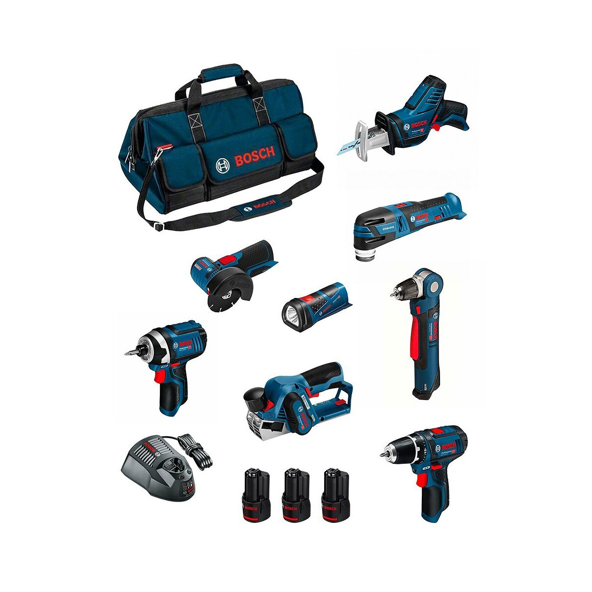 BOSCH Kit 12V BMKB8-28ED3 Perceuse-Visseuse BOSCH GSR 12V-15 Professional - Sa conception extrêmement réduite de 169 mm offre pour une prise en main optimale notamment lors des travaux de vissage et perçage en hauteur et dans les endroits difficiles d'accès - Performance professionnelle : son engrenage 2 vitesses garantit un couple puissant de 15 Nm (matériaux tendres), pour le perçage (jusqu'à 19 mm) et le vissage (jusqu'à 7 mm) - Mandrin Auto-Lock 10 mm - Éclairage LED intégré pour éclairer la zone de travail, même dans les endroits sombres Visseuse à Chocs BOSCH GDR 12V-105 Professional - Avec 137 mm, elle est la plus compacte de la catégorie 12 V. Elle assure une prise en main optimale notamment lors des travaux de vissage en hauteur et dans les endroits difficiles d'accès - Couple remarquable (105 Nm) suffisant pour 80 % des applications courantes dans le métal et le béton - Résultats parfaits grâce à la présélection de vitesse pour les applications nécessitant une vitesse adaptée au matériau - Réversibilité gauche/droite pour visser et dévisser - Très bonne maniabilité de la visseuse grâce à sa poignée antidérapante Soft Grip - Eclairage LED intégré pour illuminer la zone de travail, même dans les coins sombres Perceuse d'Angle BOSCH GWB 12V-10 Professional - Très grande polyvalence grâce à sa tête orientable dans 5 positions : 0° / 22.5° / 45° / 67.5° / 90° - Très compacte : tête orientable extrêmement courte (seulement 11 cm) avec mandrin Auto-Lock de 10 mm - Régime élevé de 0 à 1300 trs/min pour une progression rapide, idéal pour les perçages Meuleuse d'Angle BOSCH GWS 12V-76 Professional - Maniable dans chaque situation: extrêmement compacte et ergonomique pour un tronçonnage rapide sur les chantiers - Progression de travail rapide grâce au puissant moteur EC sans charbon - Usage polyvalent dans de nombreux matériaux Outil Multifonction BOSCH GOP 12V-28 Professional - L'Outil Multifonction sans-fil le plus compact de la gamme Starlock Bosch - Interface Starlock avec système d'accroche en étoile pour une transmission optimale du couple entre l'outil et l'accessoire - Moteur BRUSHLESS : plus endurant, autonomie accrue, plus de puissance grâce au moteur sans charbon - Présélection de vitesse : des résultats parfaits pour les applications nécessitant une vitesse adaptée au matériau - Poignée très fine pour une prise en main très ergonomique et agréable - Grande légèreté pour une bonne maniabilité et un grand confort d'utilisation Scie Sabre BOSCH GSA 12V-14 Professional - La scie la plus compacte de sa catégorie pour une maniabilité parfaite et de nombreuses possibilités d'utilisation dans le bois, le métal et le plastique - Résultats parfaits grâce à la présélection de vitesse pour les applications nécessitant une vitesse adaptée au matériau - Ergonomie excellente : poignée fine et faible poids (1,2 kg seulement) pour un confort de travail maximal - Eclairage LED intégré pour illuminer la zone de travail, même dans les coins sombres Lampe LED BOSCH GLI 12V-80 Professional - Technologie LED à économie d'énergie permettant d'éclairer pendant toute une journée - Forme ergonomique et zones préhension à revêtement softgrip pour une bonne prise en main - Cette lampe torche classique est idéale pour éclairer de petits espaces ou des endroits exigus - Compatible avec toutes les batteries 12 V de Bosch Professional (Professional 12V System) Rabot BOSCH GHO 12V-20 Professional - Le premier Rabot professionnel 12 V avec une facilité de guidage inédite - Équilibrage optimisé pour un grand confort d'utilisation et une prise en main ergonomique - Grande compacité grâce au moteur EC sans charbon et au système 12 V - Grande liberté de mouvement et une utilisation facile dans toutes les positions de travail grâce à l'absence de fil - Conçu pour le rabotage du bois - Compatible avec toutes les batteries et tous les chargeurs 12 V de Bosch Professional (Professional 12V System) ainsi qu'avec les sacs à poussière et le système d'aspiration de poussières Click & Clean
