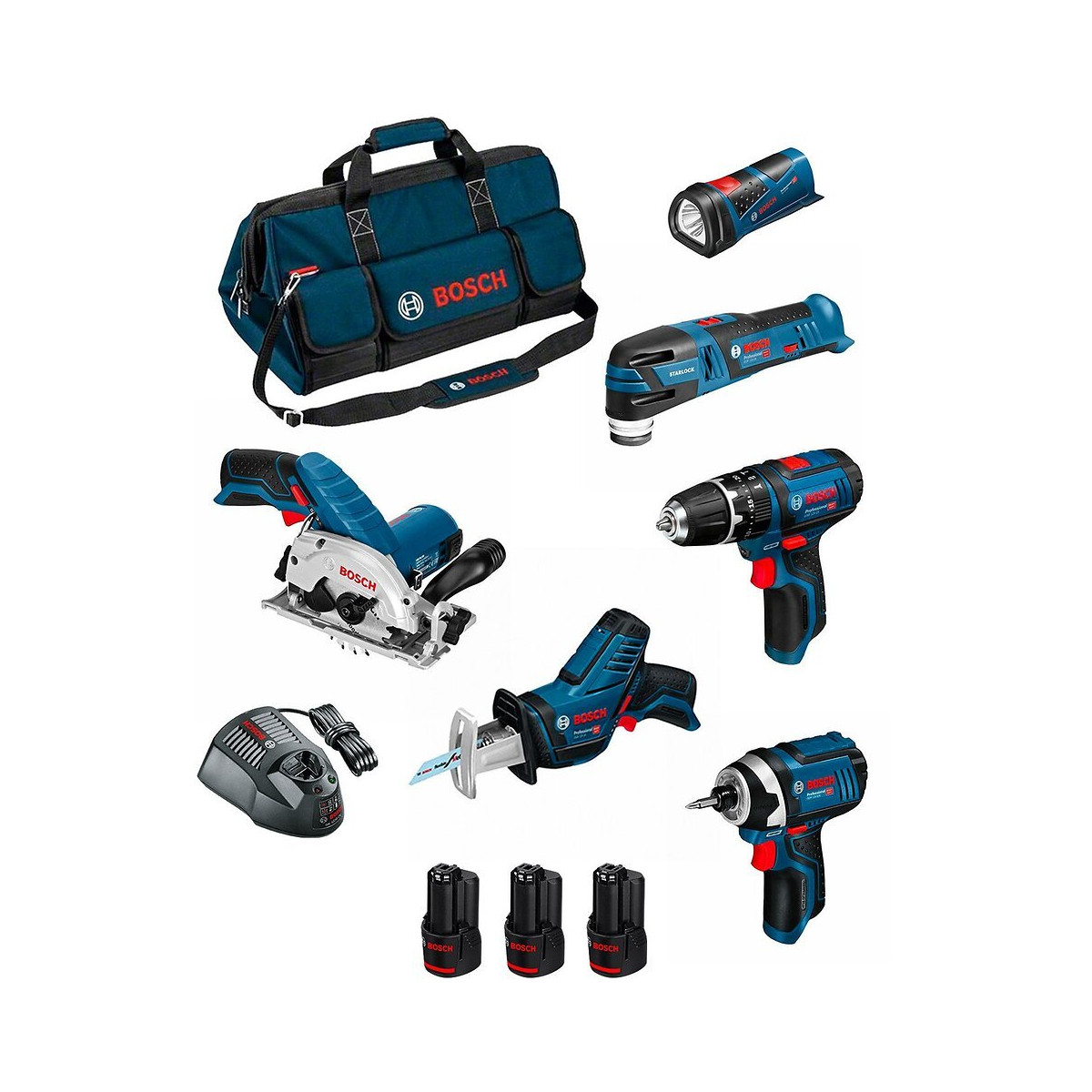 BOSCH Kit 12V BMKB6-28BD3 Perceuse à Percussion BOSCH GSB 12V-15 Professional - Avec 189 mm, c'est la perceuse-visseuse la plus compacte de sa catégorie garantissant ainsi une prise en main optimale notamment lors des travaux de vissage et perçage en hauteur et dans les endroits difficiles d'accès - Engrenage 2 vitesses pour les applications de vissage et de perçage difficiles dans le bois et le métal et de percussion dans la maçonnerie - Mandrin Auto-Lock 10 mm Visseuse à Chocs BOSCH GDR 12V-105 Professional - Avec 137 mm, elle est la plus compacte de la catégorie 12 V. Elle assure une prise en main optimale notamment lors des travaux de vissage en hauteur et dans les endroits difficiles d'accès - Couple remarquable (105 Nm) suffisant pour 80 % des applications courantes dans le métal et le béton - Résultats parfaits grâce à la présélection de vitesse pour les applications nécessitant une vitesse adaptée au matériau - Réversibilité gauche/droite pour visser et dévisser - Très bonne maniabilité de la visseuse grâce à sa poignée antidérapante Soft Grip - Eclairage LED intégré pour illuminer la zone de travail, même dans les coins sombres Scie Circulaire BOSCH GKS 12V-26 Professional - La plus compacte des Scies Circulaires universelles professionnelles - La scie la plus compacte de sa catégorie pour une maniabilité parfaite et de nombreuses possibilités d'utilisation dans le bois - Ergonomie excellente : poignée fine et faible poids (1.4 kg seulement) pour un confort de travail maximal - Témoin de niveau de charge pratique : indique à tout moment les réserves d'énergie restantes - Système d'aspiration Bosch Outil Multifonction BOSCH GOP 12V-28 Professional - L'Outil Multifonction sans-fil le plus compact de la gamme Starlock Bosch - Interface Starlock avec système d'accroche en étoile pour une transmission optimale du couple entre l'outil et l'accessoire - Moteur BRUSHLESS : plus endurant, autonomie accrue, plus de puissance grâce au moteur sans charbon - Présélection de vitesse : des résultats parfaits pour les applications nécessitant une vitesse adaptée au matériau - Poignée très fine pour une prise en main très ergonomique et agréable - Grande légèreté pour une bonne maniabilité et un grand confort d'utilisation Scie Sabre BOSCH GSA 12V-14 Professional - La scie la plus compacte de sa catégorie pour une maniabilité parfaite et de nombreuses possibilités d'utilisation dans le bois, le métal et le plastique - Résultats parfaits grâce à la présélection de vitesse pour les applications nécessitant une vitesse adaptée au matériau - Ergonomie excellente : poignée fine et faible poids (1,2 kg seulement) pour un confort de travail maximal - Eclairage LED intégré pour illuminer la zone de travail, même dans les coins sombres Lampe LED BOSCH GLI 12V-80 Professional - Technologie LED à économie d'énergie permettant d'éclairer pendant toute une journée - Forme ergonomique et zones préhension à revêtement softgrip pour une bonne prise en main - Cette lampe torche classique est idéale pour éclairer de petits espaces ou des endroits exigus - Compatible avec toutes les batteries 12 V de Bosch Professional (Professional 12V System)