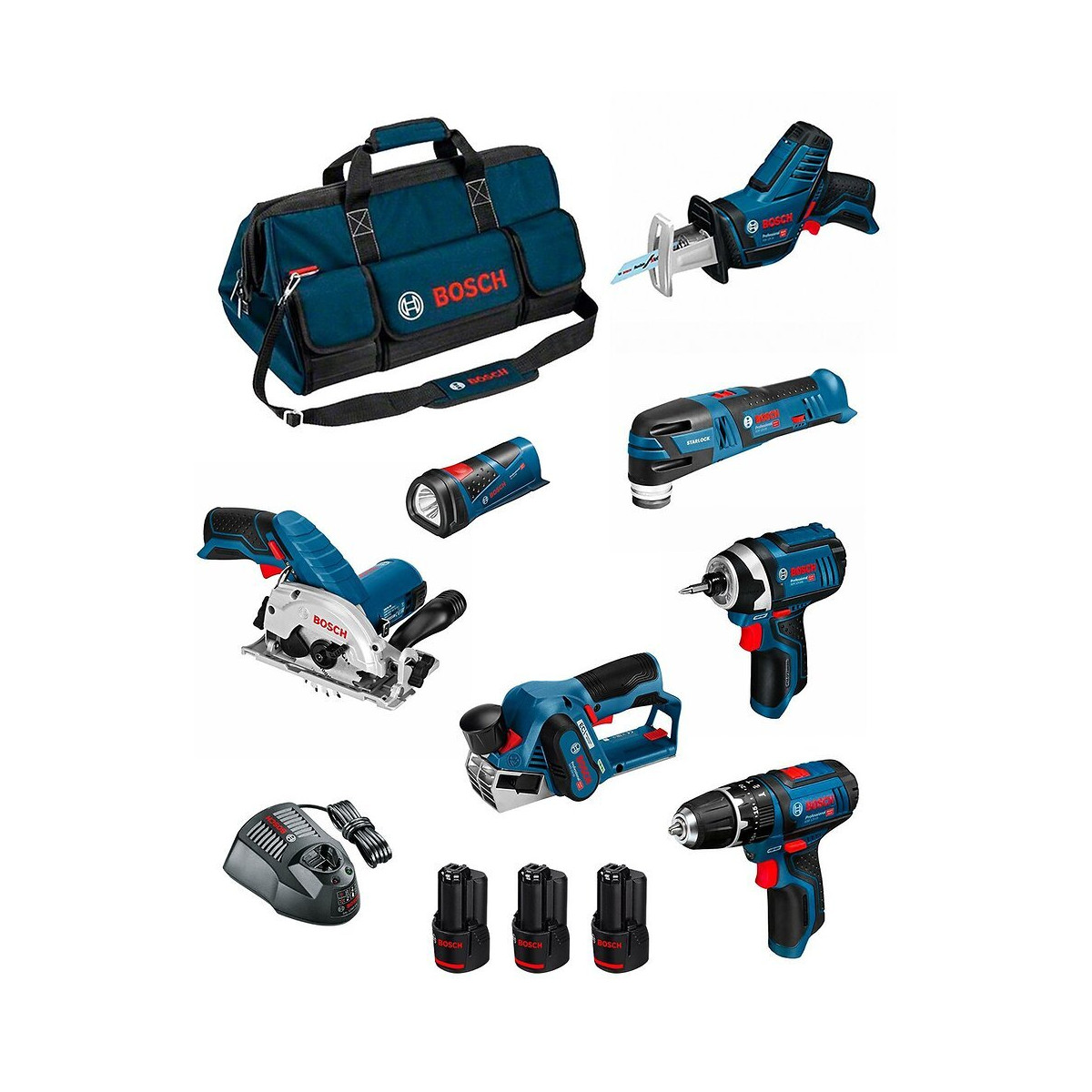 BOSCH Kit 12V BMKB7-28ED3 Perceuse à Percussion BOSCH GSB 12V-15 Professional - Avec 189 mm, c'est la perceuse-visseuse la plus compacte de sa catégorie garantissant ainsi une prise en main optimale notamment lors des travaux de vissage et perçage en hauteur et dans les endroits difficiles d'accès - Engrenage 2 vitesses pour les applications de vissage et de perçage difficiles dans le bois et le métal et de percussion dans la maçonnerie - Mandrin Auto-Lock 10 mm Visseuse à Chocs BOSCH GDR 12V-105 Professional - Avec 137 mm, elle est la plus compacte de la catégorie 12 V. Elle assure une prise en main optimale notamment lors des travaux de vissage en hauteur et dans les endroits difficiles d'accès - Couple remarquable (105 Nm) suffisant pour 80 % des applications courantes dans le métal et le béton - Résultats parfaits grâce à la présélection de vitesse pour les applications nécessitant une vitesse adaptée au matériau - Réversibilité gauche/droite pour visser et dévisser - Très bonne maniabilité de la visseuse grâce à sa poignée antidérapante Soft Grip - Eclairage LED intégré pour illuminer la zone de travail, même dans les coins sombres Scie Circulaire BOSCH GKS 12V-26 Professional - La plus compacte des Scies Circulaires universelles professionnelles - La scie la plus compacte de sa catégorie pour une maniabilité parfaite et de nombreuses possibilités d'utilisation dans le bois - Ergonomie excellente : poignée fine et faible poids (1.4 kg seulement) pour un confort de travail maximal - Témoin de niveau de charge pratique : indique à tout moment les réserves d'énergie restantes - Système d'aspiration Bosch Outil Multifonction BOSCH GOP 12V-28 Professional - L'Outil Multifonction sans-fil le plus compact de la gamme Starlock Bosch - Interface Starlock avec système d'accroche en étoile pour une transmission optimale du couple entre l'outil et l'accessoire - Moteur BRUSHLESS : plus endurant, autonomie accrue, plus de puissance grâce au moteur sans charbon - Présélection de vitesse : des résultats parfaits pour les applications nécessitant une vitesse adaptée au matériau - Poignée très fine pour une prise en main très ergonomique et agréable - Grande légèreté pour une bonne maniabilité et un grand confort d'utilisation Scie Sabre BOSCH GSA 12V-14 Professional - La scie la plus compacte de sa catégorie pour une maniabilité parfaite et de nombreuses possibilités d'utilisation dans le bois, le métal et le plastique - Résultats parfaits grâce à la présélection de vitesse pour les applications nécessitant une vitesse adaptée au matériau - Ergonomie excellente : poignée fine et faible poids (1,2 kg seulement) pour un confort de travail maximal - Eclairage LED intégré pour illuminer la zone de travail, même dans les coins sombres Lampe LED BOSCH GLI 12V-80 Professional - Technologie LED à économie d'énergie permettant d'éclairer pendant toute une journée - Forme ergonomique et zones préhension à revêtement softgrip pour une bonne prise en main - Cette lampe torche classique est idéale pour éclairer de petits espaces ou des endroits exigus - Compatible avec toutes les batteries 12 V de Bosch Professional (Professional 12V System) Rabot BOSCH GHO 12V-20 Professional - Le premier Rabot professionnel 12 V avec une facilité de guidage inédite - Équilibrage optimisé pour un grand confort d'utilisation et une prise en main ergonomique - Grande compacité grâce au moteur EC sans charbon et au système 12 V - Grande liberté de mouvement et une utilisation facile dans toutes les positions de travail grâce à l'absence de fil - Conçu pour le rabotage du bois - Compatible avec toutes les batteries et tous les chargeurs 12 V de Bosch Professional (Professional 12V System) ainsi qu'avec les sacs à poussière et le système d'aspiration de poussières Click & Clean