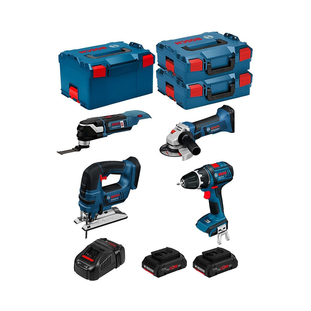BOSCH Kit PSL4WGM2CP Scie Sauteuse BOSCH GST 18 V-LI B Professional - La Scie Sauteuse est la plus puissante de la catégorie 18 V - Modèle 18 V très performant pour une progression de travail rapide - Dispose aussi de la fonction Constant Speed, d'un éclairage LED, d'un mouvement orbital, du système de guidage Precision Control et d'une présélection de vitesse - Idéal pour les coupes courbes et transversales dans le bois massif, les panneaux agglomérés, les bois composites et les matériaux durs ou épais - Sa poignée étrier avec gâchette de vitesse permet une maîtrise parfaite et facile de l'outil - Grâce au système SDS Bosch, les lames peuvent être changées facilement et sans clé - Compatible avec le système d'aspiration de poussières Click & Clean Bosch et d'autres aspirateurs Bosch ainsi qu'avec les rails de guidage Bosch moyennant l'utilisation d'un adaptateur Outil Multifonction BOSCH GOP 18V-28 Professional - Outil Multifonction puissant et polyvalent de la gamme StarlockPlus de Bosch - Interface Starlock avec système d'accroche en étoile pour une transmission optimale du couple entre l'outil et l'accessoire - Fonction Snap-in pour changer d'accessoire rapidement et facilement - Conçu pour réaliser des découpes dans des meubles, pour les travaux de rénovation de bateaux et pour sectionner des tuyaux et des clous - Peut être utilisé pour le bois, le plastique et le métal - Compatible avec les systèmes Starlock et StarlockPlus - Éclairage LED assurant une bonne visibilité de l'espace de travail dans les endroits sombres - Bénéficie de la fonction Constant Speed, d'une poignée Softgrip et d'une présélection de vitesse Meuleuse BOSCH GWS 18-125 V-LI Professional - La Meuleuse d'Angle de 18V la plus puissante - Capacité d'abrasion et capacité de coupe les plus élevées de sa catégorie par charge de batterie - Moteur 4 pôles hautes performances extrêmement robuste et endurant pour une longévité élevée - Forme compacte et poids léger (seulement 2.3 kg) pour un grand confort de travail, surtout dans les endroits difficiles d'accès et pour les travaux en hauteur Perceuse à Percussion BOSCH GSB 18 V-LI Professional - Extrêmement compacte grâce à sa conception courte (seulement 195 mm) et encore plus légère (seulement 1,9 kg) pour une manipulation parfaite - Système Bosch ECP (Electronic Cell Protection) : protège la batterie contre la surcharge, l'échauffement et la décharge totale - Lumière LED intégrée pour l'éclairage de la zone de travail, même dans les endroits sombres - Clip de ceinture pratique pour accrocher les outils confortablement sur la ceinture ou l'échelle - Les batteries COOLPACK innovantes garantissent une dissipation thermique optimale et prolongent ainsi la durée de vie jusqu'à 100% (voir batteries lithium sans COOLPACK) - Frein moteur pour des travaux de serrage en série précis - Poignée ergonomique à longue prise et poignée anti-vibration Softgrip pour un travail sans effort