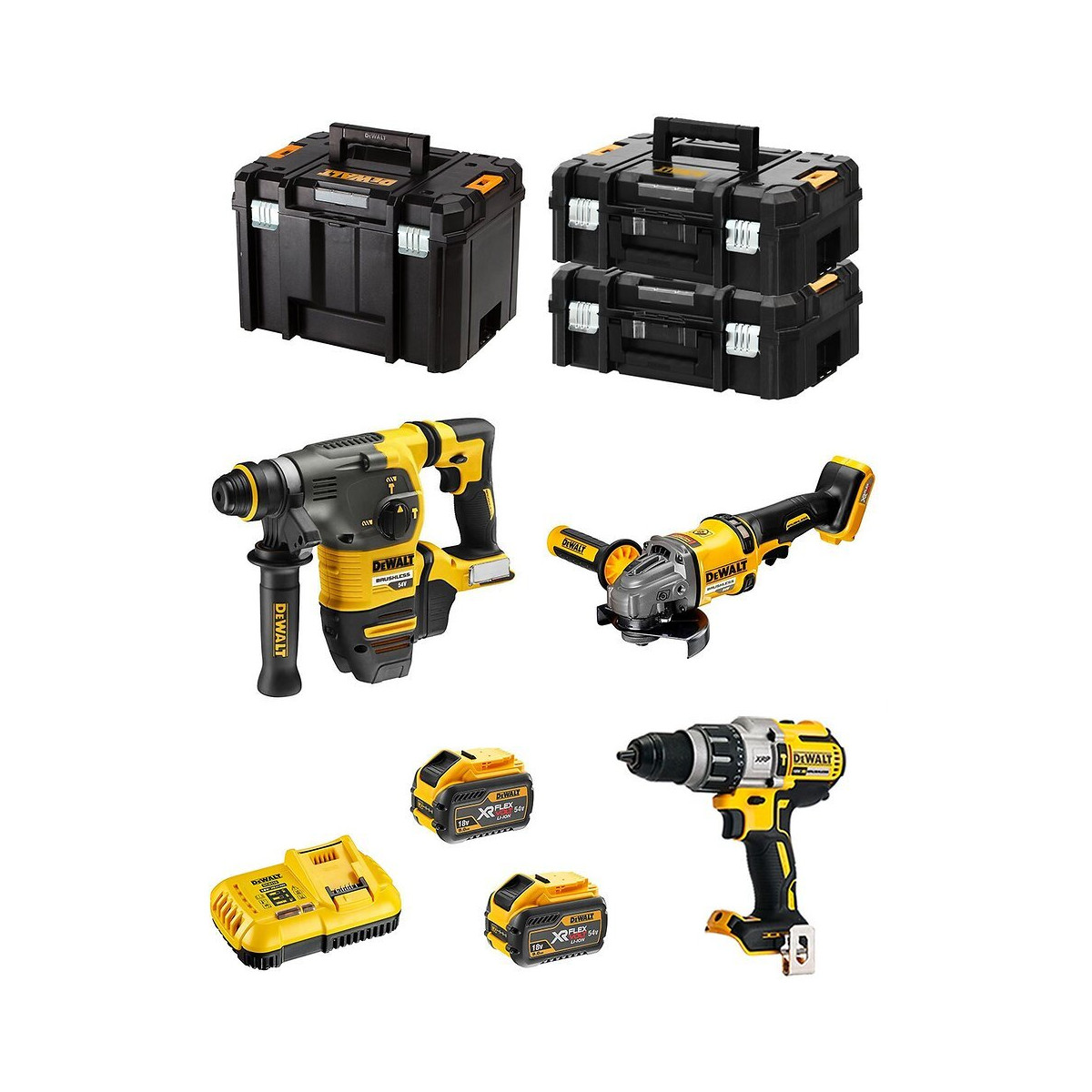 DeWALT Kit FVK381X2HD-QW 54V/18V Perforateur-Burineur DeWALT DCH333 FlexVolt - Performance de perçage à grande vitesse de premier niveau, plus de 66 trous (Ø 18 x 80 mm) par charge - Stop de rotation pour les travaux de burinage légers dans du plâtre et des tuiles, et un stop impact pour seulement un mode rotation pour percer du bois ou du métal - Moteur Brushless pour plus d'autonomie et moins de maintenance - Perform & Protect: meilleur de sa catégorie en termes de vibration (8,5 m/s²), pour réduire la fatigue de l'utilisateur - Eclairage LED puissant avec temporisation améliorant la visibilité - Idéal pour le perçage de trous d'ancrage dans le béton, la brique et les divers matériaux de construction de 4 à 30 mm - Design compact, léger et ergonomique pour un meilleur confort et support durant les périodes d'utilisation prolongées Perceuse à Percussion DeWALT DCD996 - Perceuse à percussion à grande puissance grâce à sa forte cadence de frappe (38250 cps/min max.) ce qui permet à l'utilisateur de travailler plus rapidement et avec efficacité - 3 vitesses réglables et réversibles avec une transmission métallique pour une plus grande autonomie et une durée de vie de la machine améliorée - Réglage de couple à 22 positions pour des résultats précis et constants - Mandrin auto-serrant de 13 mm : blocage d'arbre automatique pour un changement simple et rapide d'accessoires - Embrayage électronique et couple de serrage réglable en 11 positions pour des résultats précis et parfaits - Gâchette intelligente offrant un contrôle optimal dans toutes les applications - Poignée ergonomique conçue pour une meilleure prise en main - Eclairage LED puissant multifonctions pour permettre une visibilité optimale dans toutes les situations - Clip ceinture permettant d'accrocher la machine à la ceinture pour effectuer des applications manuelles Meuleuse DeWALT DCG414 FlexVolt - L'engrenage conique en acier permet d'augmenter considérablement la durabilité de l'outil - Cette conception assure également un niveau extrêmement faibles des vibrations - Blocage d'arbre pour changer facilement et rapidement de disque - Interrupteur à gâchette, système anti-redémarrage pour plus de contrôle et de sécurité - Carter réglable sans clé pour une grande polyvalence - Poignée latérale à deux positions, pour plus de confort et une meilleure maîtrise - Boîte d'engrenage dissipant bien la chaleur, pour une plus grande longévité