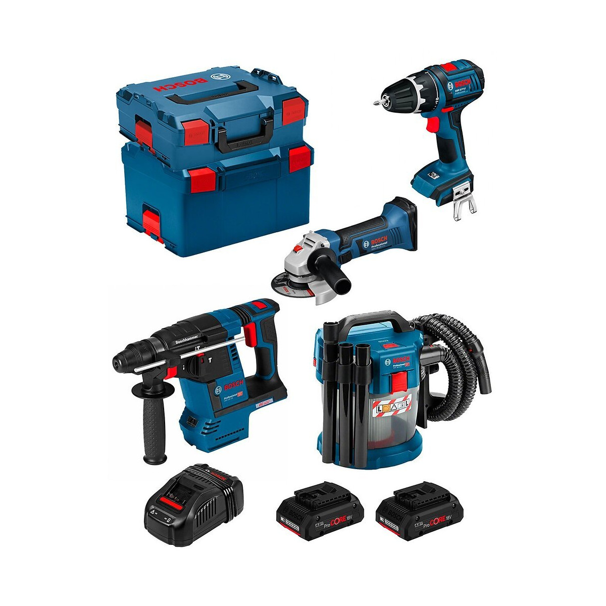 BOSCH Kit PSL4M2CP Perforateur BOSCH GBH 18V-26 F Professional - Perforateur universel avec mandrin interchangeable de la gamme des perforateurs sans-fil SDS plus - Fonction KickBack Control et électronique EPC (Electronic Precision Control) pour une meilleure maîtrise de l'outil et une meilleure protection de l'utilisateur - Force de frappe de 2,6 J pour une progression de perçage rapide et une capacité de burinage élevée - Conçu pour les applications de perçage et burinage dans le béton, la maçonnerie, le bois et le métal - Dispose également de la fonction Constant Speed, d'un moteur sans charbon, d'une électronique de protection du moteur (EMP), d'un éclairage LED, d'un embrayage de sécurité, d'un variateur de vitesse, de la fonction Vario Lock et du système Vibration Control - Compatible avec divers dispositifs d'aspiration de poussière ainsi qu'avec toutes les batteries et tous les chargeurs 18 V de Bosch Professional (Professional 18V System) Perceuse à Percussion BOSCH GSB 18 V-LI Professional - Extrêmement compacte grâce à sa conception courte (seulement 195 mm) et encore plus légère (seulement 1,9 kg) pour une manipulation parfaite - Système Bosch ECP (Electronic Cell Protection) : protège la batterie contre la surcharge, l'échauffement et la décharge totale - Lumière LED intégrée pour l'éclairage de la zone de travail, même dans les endroits sombres - Clip de ceinture pratique pour accrocher les outils confortablement sur la ceinture ou l'échelle - Les batteries COOLPACK innovantes garantissent une dissipation thermique optimale et prolongent ainsi la durée de vie jusqu'à 100% (voir batteries lithium sans COOLPACK) - Frein moteur pour des travaux de serrage en série précis - Poignée ergonomique à longue prise et poignée anti-vibration Softgrip pour un travail sans effort Meuleuse BOSCH GWS 18-125 V-LI Professional - La Meuleuse d'Angle de 18V la plus puissante - Capacité d'abrasion et capacité de coupe les plus élevées de sa catégorie par charge de batterie - Moteur 4 pôles hautes performances extrêmement robuste et endurant pour une longévité élevée - Forme compacte et poids léger (seulement 2.3 kg) pour un grand confort de travail, surtout dans les endroits difficiles d'accès et pour les travaux en hauteur Aspirateur BOSCH GAS 18V-10 L Professional - L'Aspirateur sans-fil 18 V de classe L avec pouvoir aspirant élevé - Pouvoir d'aspiration constant et continu grâce à la technologie cyclonique empêchent tout colmatage du filtre - Grande compacité et légèreté pour un transport et un rangement faciles - Conception sans sac et nombreux accessoires (inclus) pour une grande variété d'applications d'aspiration de matières solides et de liquides - Doté d'un filtre HEPA et il est homologué classe L selon les normes UE - Compatible avec le système d'aspiration de poussières Click & Clean ainsi qu'avec toutes les batteries et tous les chargeurs 18 V de Bosch Professional (Professional 18V System)