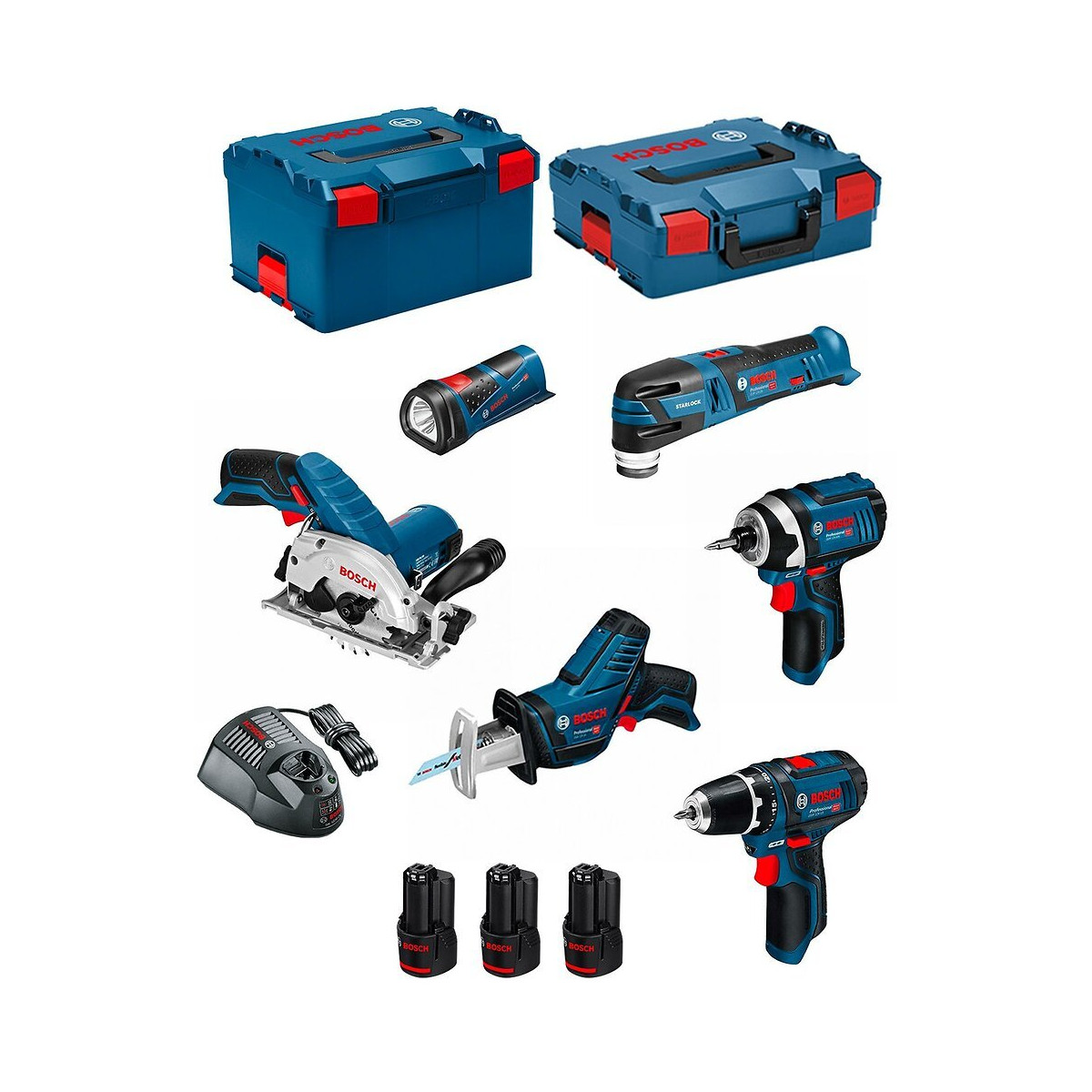 BOSCH Kit 12V BMK6-28AD3 Perceuse-Visseuse BOSCH GSR 12V-15 Professional - Sa conception extrêmement réduite de 169 mm offre pour une prise en main optimale notamment lors des travaux de vissage et perçage en hauteur et dans les endroits difficiles d'accès - Performance professionnelle : son engrenage 2 vitesses garantit un couple puissant de 15 Nm (matériaux tendres), pour le perçage (jusqu'à 19 mm) et le vissage (jusqu'à 7 mm) - Mandrin Auto-Lock 10 mm - Éclairage LED intégré pour éclairer la zone de travail, même dans les endroits sombres Visseuse à Chocs BOSCH GDR 12V-105 Professional - Avec 137 mm, elle est la plus compacte de la catégorie 12 V. Elle assure une prise en main optimale notamment lors des travaux de vissage en hauteur et dans les endroits difficiles d'accès - Couple remarquable (105 Nm) suffisant pour 80 % des applications courantes dans le métal et le béton - Résultats parfaits grâce à la présélection de vitesse pour les applications nécessitant une vitesse adaptée au matériau - Réversibilité gauche/droite pour visser et dévisser - Très bonne maniabilité de la visseuse grâce à sa poignée antidérapante Soft Grip - Eclairage LED intégré pour illuminer la zone de travail, même dans les coins sombres Scie Circulaire BOSCH GKS 12V-26 Professional - La plus compacte des Scies Circulaires universelles professionnelles - La scie la plus compacte de sa catégorie pour une maniabilité parfaite et de nombreuses possibilités d'utilisation dans le bois - Ergonomie excellente : poignée fine et faible poids (1.4 kg seulement) pour un confort de travail maximal - Témoin de niveau de charge pratique : indique à tout moment les réserves d'énergie restantes - Système d'aspiration Bosch Outil Multifonction BOSCH GOP 12V-28 Professional - L'Outil Multifonction sans-fil le plus compact de la gamme Starlock Bosch - Interface Starlock avec système d'accroche en étoile pour une transmission optimale du couple entre l'outil et l'accessoire - Moteur BRUSHLESS : plus endurant, autonomie accrue, plus de puissance grâce au moteur sans charbon - Présélection de vitesse : des résultats parfaits pour les applications nécessitant une vitesse adaptée au matériau - Poignée très fine pour une prise en main très ergonomique et agréable - Grande légèreté pour une bonne maniabilité et un grand confort d'utilisation Scie Sabre BOSCH GSA 12V-14 Professional - La scie la plus compacte de sa catégorie pour une maniabilité parfaite et de nombreuses possibilités d'utilisation dans le bois, le métal et le plastique - Résultats parfaits grâce à la présélection de vitesse pour les applications nécessitant une vitesse adaptée au matériau - Ergonomie excellente : poignée fine et faible poids (1,2 kg seulement) pour un confort de travail maximal - Eclairage LED intégré pour illuminer la zone de travail, même dans les coins sombres Lampe LED BOSCH GLI 12V-80 Professional - Technologie LED à économie d'énergie permettant d'éclairer pendant toute une journée - Forme ergonomique et zones préhension à revêtement softgrip pour une bonne prise en main - Cette lampe torche classique est idéale pour éclairer de petits espaces ou des endroits exigus - Compatible avec toutes les batteries 12 V de Bosch Professional (Professional 12V System)