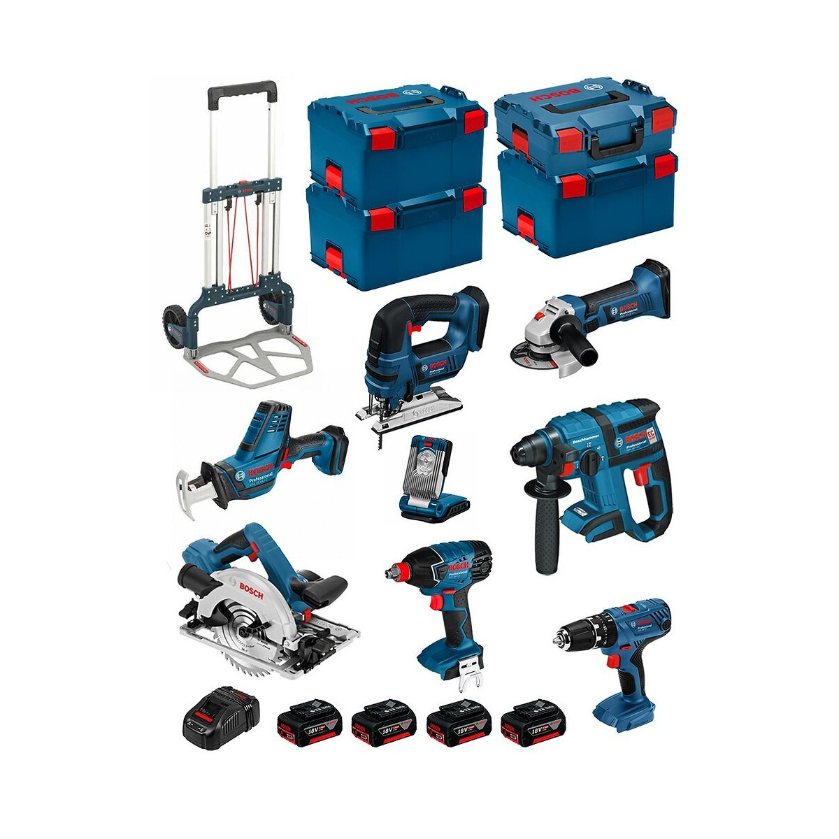 BOSCH Kit PSL8P4A+Caddy>/strong> Scie Sauteuse BOSCH GST 18 V-LI B Professional - La Scie Sauteuse est la plus puissante de la catégorie 18 V - Modèle 18 V très performant pour une progression de travail rapide - Dispose aussi de la fonction Constant Speed, d'un éclairage LED, d'un mouvement orbital, du système de guidage Precision Control et d'une présélection de vitesse - Idéal pour les coupes courbes et transversales dans le bois massif, les panneaux agglomérés, les bois composites et les matériaux durs ou épais - Sa poignée étrier avec gâchette de vitesse permet une maîtrise parfaite et facile de l'outil - Grâce au système SDS Bosch, les lames peuvent être changées facilement et sans clé - Compatible avec le système d'aspiration de poussières Click & Clean Bosch et d'autres aspirateurs Bosch ainsi qu'avec les rails de guidage Bosch moyennant l'utilisation d'un adaptateur Scie Circulaire BOSCH GKS 18V-57 G Professional - Une Scie Circulaire puissante pour des coupes rapides et précises - Puissance : progression de travail rapide et grande autonomie grâce au puissant moteur et aux batteries BOSCH - Flexibilité et précision : le rail de guidage permet de travailler rapidement et avec précision - Pour les besoins de chacun : la lame de la scie circulaire peut désormais aussi être placée du côté droit Visseuse à Chocs BOSCH GDX 18 V-LI Professional - Polyvalent et innovant : nouveau porte-outil 2 en 1 (six pans 1/4" et carré mâle 1/2") pour encore plus de possibilités d'utilisation - Couple élevé et régime élevé pour une progression rapide dans le métal et le bois - Conception compacte pour une prise en main parfaite même dans les endroits difficiles d'accès et lors des travaux en hauteur Perforateur BOSCH GBH 18 V-EC Professional - Modèle au meilleur rapport poids/performance de la gamme des Perforateurs sans-fil SDS plus Bosch de 18 V - Conception compacte et légère permettant d'effectuer des perçages en hauteur - Longévité élevée grâce à des composants robustes et au moteur EC Brushless - Conçu pour les applications de perçage et burinage dans le béton, la maçonnerie, le bois et le métal - Dispose également d'une électronique de protection du moteur (EMP), d'un éclairage LED, d'un embrayage de sécurité, d'un variateur de vitesse et de la fonction Vario Lock - Compatible avec divers dispositifs d'aspiration de poussière ainsi qu'avec toutes les batteries et tous les chargeurs 18 V de Bosch Professional (Professional 18V System) Scie Sabre BOSCH GSA 18 V-LI C Professional - Design compact pour des applications multiples, même d'une main ou en hauteur - Très faibles taux de vibration pour un travail agréable - Progression de travail rapide et grande autonomie grâce au puissant moteur et aux batteries endurantes Lampe BOSCH GLI VariLED Professional - Lampe de travail Bosch au format de poche la plus lumineuse de la catégorie 18V - Avec 3 puissantes LED produisant 420 lumens pour un éclairement intense - Mécanisme de rabattement innovant facilitant le transport et assurant un rangement compact - Faisceau réglable (éclairage diffus / éclairage concentré) et angle d'éclairage réglable dans 9 positions pour de multiples applications - Cette lampe de travail est idéal pour bien éclairer de petits espaces Perceuse à Percussion BOSCH GSB 18V-21 Professional - Performances professionnelles : puissance et autonomie suffisantes pour la majorité des applications grâce au couple de 55 Nm (vissages durs) - Qualité professionnelle : perceuse-visseuse fiable et endurante pour un usage au quotidien grâce à l'engrenage entièrement en métal et à l'électronique de protection des cellules (ECP) - Design professionnel : conception axée sur les applications professionnelles grâce au mandrin automatique de 13 mm Meuleuse BOSCH GWS 18-125 V-LI Professional - La Meuleuse d'Angle de 18V la plus puissante - Capacité d'abrasion et capacité de coupe les plus élevées de sa catégorie par charge de batterie - Moteur 4 pôles hautes performances extrêmement robuste et endurant pour une longévité élevée - Forme compacte et poids léger (seulement 2.3 kg) pour un grand confort de travail, surtout dans les endroits difficiles d'accès et pour les travaux en hauteur