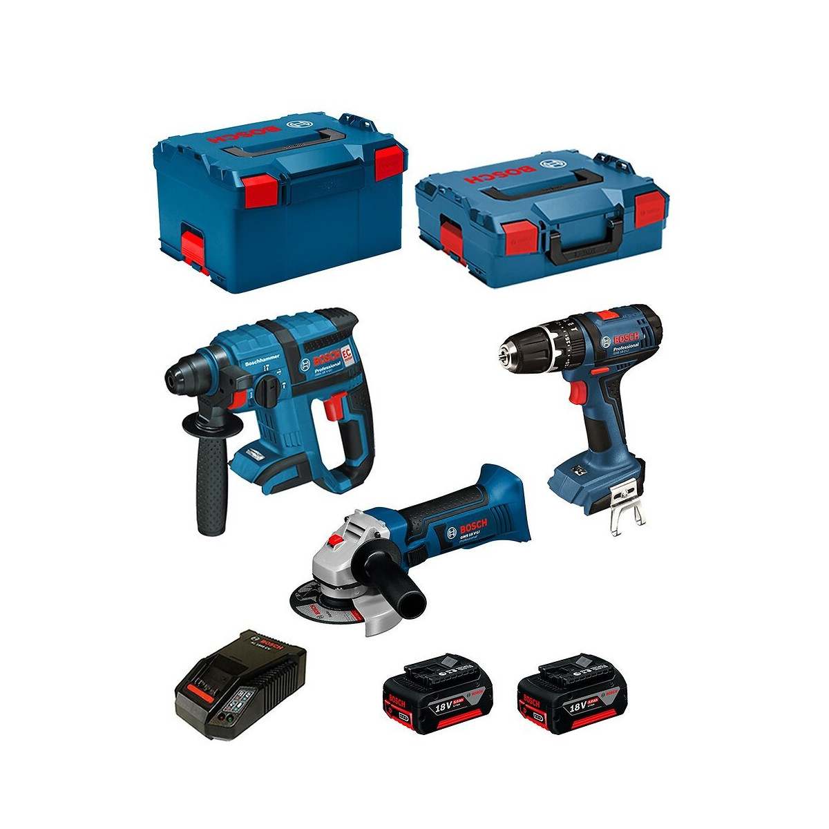 BOSCH Kit PSL3P3 Perforateur BOSCH GBH 18 V-EC Professional - Modèle au meilleur rapport poids/performance de la gamme des Perforateurs sans-fil SDS plus Bosch de 18 V - Conception compacte et légère permettant d'effectuer des perçages en hauteur - Longévité élevée grâce à des composants robustes et au moteur EC Brushless - Conçu pour les applications de perçage et burinage dans le béton, la maçonnerie, le bois et le métal - Dispose également d'une électronique de protection du moteur (EMP), d'un éclairage LED, d'un embrayage de sécurité, d'un variateur de vitesse et de la fonction Vario Lock - Compatible avec divers dispositifs d'aspiration de poussière ainsi qu'avec toutes les batteries et tous les chargeurs 18 V de Bosch Professional (Professional 18V System) Perceuse-Visseuse BOSCH GSB 18-2 LI Professional - La Perceuse-Visseuse sans fil la plus légère et la plus compacte de sa catégorie - Nouvel engrenage planétaire à 2 vitesses pour des applications puissantes de vissage et de perçage dans le bois (30 mm) et le métal (10 mm), ainsi que le perçage à percussion dans la maçonnerie (10 mm) - La conception la plus courte de 187 mm de sa catégorie offre une maniabilité optimale, en particulier dans les travaux de perçage et de vissage en hauteur et dans les espaces restreints - Faible poids: seulement 1,4 kg pour une manipulation parfaite et un travail sans effort Meuleuse BOSCH GWS 18 V-LI Professional - La Meuleuse Bosch la plus petite et la plus légère de la catégorie 18V - Offre la même puissance qu'une meuleuse filaire de 800 W grâce au moteur 4 pôles haute performance - Poids réduit de 2,3 kg et conception compacte du boîtier optimisé pour travailler en hauteur et dans des espaces confinés - Conçu pour couper et poncer le métal, les carreaux et les briques - Avec un couvercle de protection et une protection contre la reconnexion - Compatible avec l'aspirateur et le GDE 125 EA-S Professional, ainsi qu'avec les batteries et chargeurs Bosch Professional 18V (Professional 18V System)