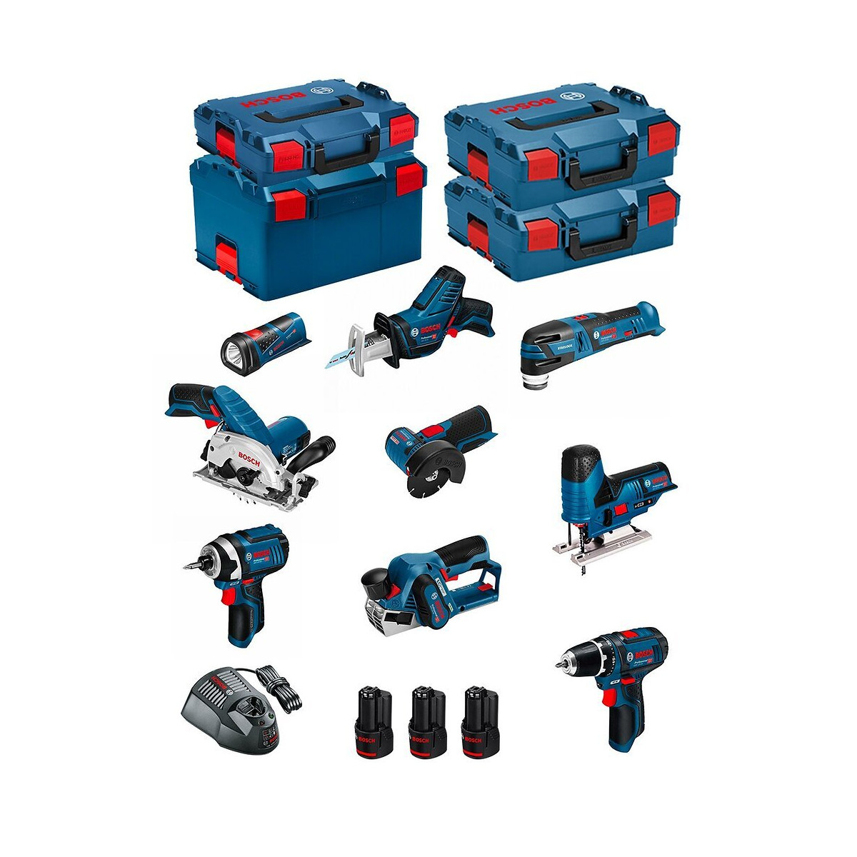 BOSCH Kit 12V BMK9-28DD3 Perceuse-Visseuse BOSCH GSR 12V-15 Professional - Sa conception extrêmement réduite de 169 mm offre pour une prise en main optimale notamment lors des travaux de vissage et perçage en hauteur et dans les endroits difficiles d'accès - Performance professionnelle : son engrenage 2 vitesses garantit un couple puissant de 15 Nm (matériaux tendres), pour le perçage (jusqu'à 19 mm) et le vissage (jusqu'à 7 mm) - Mandrin Auto-Lock 10 mm - Éclairage LED intégré pour éclairer la zone de travail, même dans les endroits sombres Visseuse à Chocs BOSCH GDR 12V-105 Professional - Avec 137 mm, elle est la plus compacte de la catégorie 12 V. Elle assure une prise en main optimale notamment lors des travaux de vissage en hauteur et dans les endroits difficiles d'accès - Couple remarquable (105 Nm) suffisant pour 80 % des applications courantes dans le métal et le béton - Résultats parfaits grâce à la présélection de vitesse pour les applications nécessitant une vitesse adaptée au matériau - Réversibilité gauche/droite pour visser et dévisser - Très bonne maniabilité de la visseuse grâce à sa poignée antidérapante Soft Grip - Eclairage LED intégré pour illuminer la zone de travail, même dans les coins sombres Scie Circulaire BOSCH GKS 12V-26 Professional - La plus compacte des Scies Circulaires universelles professionnelles - La scie la plus compacte de sa catégorie pour une maniabilité parfaite et de nombreuses possibilités d'utilisation dans le bois - Ergonomie excellente : poignée fine et faible poids (1.4 kg seulement) pour un confort de travail maximal - Témoin de niveau de charge pratique : indique à tout moment les réserves d'énergie restantes - Système d'aspiration Bosch Meuleuse d'Angle BOSCH GWS 12V-76 Professional - Maniable dans chaque situation: extrêmement compacte et ergonomique pour un tronçonnage rapide sur les chantiers - Progression de travail rapide grâce au puissant moteur EC sans charbon - Usage polyvalent dans de nombreux matériaux Scie Sauteuse BOSCH GST 12V-70 Professional - Scie Sauteuse de 12 V compacte à poignée étrier - Poignée champignon, grande légèreté et forme compacte pour un maniement parfait même lors de la réalisation de coupes par en dessous - Poignée très proche de la ligne de coupe pour une prise en main parfaite en cours d'utilisation - Changement de lame facile et sans clé grâce au système SDS Bosch - Conçue pour les coupes courbes et transversales ainsi que pour les applications peu et moyennement exigeantes dans le bois massif, les panneaux agglomérés et les bois composites - Permet aussi de réaliser des coupes biaises et dispose de la fonction Constant Speed, d'un éclairage LED, d'un mouvement orbital, du système de guidage Precision Control et d'une présélection de vitesse - Compatible avec le système d'aspiration de poussières Click & Clean Bosch et d'autres aspirateurs Bosch ainsi qu'avec toutes les batteries et tous les chargeurs 12 V de Bosch Professional (Professional 12V System) Outil Multifonction BOSCH GOP 12V-28 Professional - L'Outil Multifonction sans-fil le plus compact de la gamme Starlock Bosch - Interface Starlock avec système d'accroche en étoile pour une transmission optimale du couple entre l'outil et l'accessoire - Moteur BRUSHLESS : plus endurant, autonomie accrue, plus de puissance grâce au moteur sans charbon - Présélection de vitesse : des résultats parfaits pour les applications nécessitant une vitesse adaptée au matériau - Poignée très fine pour une prise en main très ergonomique et agréable - Grande légèreté pour une bonne maniabilité et un grand confort d'utilisation Scie Sabre BOSCH GSA 12V-14 Professional - La scie la plus compacte de sa catégorie pour une maniabilité parfaite et de nombreuses possibilités d'utilisation dans le bois, le métal et le plastique - Résultats parfaits grâce à la présélection de vitesse pour les applications nécessitant une vitesse adaptée au matériau - Ergonomie excellente : poignée fine et faible poids (1,2 kg seulement) pour un confort de travail maximal - Eclairage LED intégré pour illuminer la zone de travail, même dans les coins sombres Lampe LED BOSCH GLI 12V-80 Professional - Technologie LED à économie d'énergie permettant d'éclairer pendant toute une journée - Forme ergonomique et zones préhension à revêtement softgrip pour une bonne prise en main - Cette lampe torche classique est idéale pour éclairer de petits espaces ou des endroits exigus - Compatible avec toutes les batteries 12 V de Bosch Professional (Professional 12V System) Rabot BOSCH GHO 12V-20 Professional - Le premier Rabot professionnel 12 V avec une facilité de guidage inédite - Équilibrage optimisé pour un grand confort d'utilisation et une prise en main ergonomique - Grande compacité grâce au moteur EC sans charbon et au système 12 V - Grande liberté de mouvement et une utilisation facile dans toutes les positions de travail grâce à l'absence de fil - Conçu pour le rabotage du bois - Compatible avec toutes les batteries et tous les chargeurs 12 V de Bosch Professional (Professional 12V System) ainsi qu'avec les sacs à poussière et le système d'aspiration de poussières Click & Clean