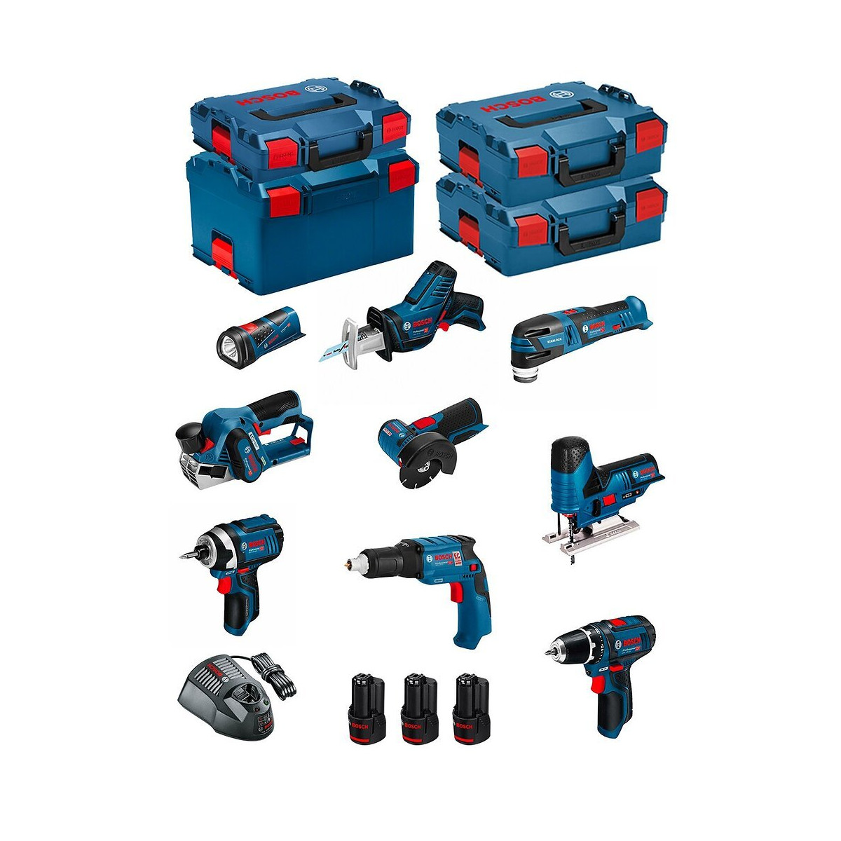 BOSCH Kit 12V BMK9-28CD3 Perceuse-Visseuse BOSCH GSR 12V-15 Professional - Sa conception extrêmement réduite de 169 mm offre pour une prise en main optimale notamment lors des travaux de vissage et perçage en hauteur et dans les endroits difficiles d'accès - Performance professionnelle : son engrenage 2 vitesses garantit un couple puissant de 15 Nm (matériaux tendres), pour le perçage (jusqu'à 19 mm) et le vissage (jusqu'à 7 mm) - Mandrin Auto-Lock 10 mm - Éclairage LED intégré pour éclairer la zone de travail, même dans les endroits sombres Visseuse Plaquiste BOSCH GTB 12V-11 Professional - Conception légère et compacte de 0,9 kg avec batterie et poignée ergonomique, pour une prise en main confortable dans les espaces restreints - Moteur puissant et compact de 12V pour visser 1200 vis par charge de batterie - Moteur Brushless Bosch avec Electronic Motor Protection et frein moteur pour une grande longévité - Conçue pour fixer les vis de construction sèches dans des matériaux tels que le bois et le métal, bien qu'il soit également optimisé pour les plaques de plâtre - Comprend Autolock, butée de profondeur interchangeable, mode inverse et sélection de la vitesse - Compatible avec toutes les batteries et chargeurs Bosch Professional 12V (système Professional 12V) Visseuse à Chocs BOSCH GDR 12V-105 Professional - Avec 137 mm, elle est la plus compacte de la catégorie 12 V. Elle assure une prise en main optimale notamment lors des travaux de vissage en hauteur et dans les endroits difficiles d'accès - Couple remarquable (105 Nm) suffisant pour 80 % des applications courantes dans le métal et le béton - Résultats parfaits grâce à la présélection de vitesse pour les applications nécessitant une vitesse adaptée au matériau - Réversibilité gauche/droite pour visser et dévisser - Très bonne maniabilité de la visseuse grâce à sa poignée antidérapante Soft Grip - Eclairage LED intégré pour illuminer la zone de travail, même dans les coins sombres Meuleuse d'Angle BOSCH GWS 12V-76 Professional - Maniable dans chaque situation: extrêmement compacte et ergonomique pour un tronçonnage rapide sur les chantiers - Progression de travail rapide grâce au puissant moteur EC sans charbon - Usage polyvalent dans de nombreux matériaux Scie Sauteuse BOSCH GST 12V-70 Professional - Scie Sauteuse de 12 V compacte à poignée étrier - Poignée champignon, grande légèreté et forme compacte pour un maniement parfait même lors de la réalisation de coupes par en dessous - Poignée très proche de la ligne de coupe pour une prise en main parfaite en cours d'utilisation - Changement de lame facile et sans clé grâce au système SDS Bosch - Conçue pour les coupes courbes et transversales ainsi que pour les applications peu et moyennement exigeantes dans le bois massif, les panneaux agglomérés et les bois composites - Permet aussi de réaliser des coupes biaises et dispose de la fonction Constant Speed, d'un éclairage LED, d'un mouvement orbital, du système de guidage Precision Control et d'une présélection de vitesse - Compatible avec le système d'aspiration de poussières Click & Clean Bosch et d'autres aspirateurs Bosch ainsi qu'avec toutes les batteries et tous les chargeurs 12 V de Bosch Professional (Professional 12V System) Outil Multifonction BOSCH GOP 12V-28 Professional - L'Outil Multifonction sans-fil le plus compact de la gamme Starlock Bosch - Interface Starlock avec système d'accroche en étoile pour une transmission optimale du couple entre l'outil et l'accessoire - Moteur BRUSHLESS : plus endurant, autonomie accrue, plus de puissance grâce au moteur sans charbon - Présélection de vitesse : des résultats parfaits pour les applications nécessitant une vitesse adaptée au matériau - Poignée très fine pour une prise en main très ergonomique et agréable - Grande légèreté pour une bonne maniabilité et un grand confort d'utilisation Scie Sabre BOSCH GSA 12V-14 Professional - La scie la plus compacte de sa catégorie pour une maniabilité parfaite et de nombreuses possibilités d'utilisation dans le bois, le métal et le plastique - Résultats parfaits grâce à la présélection de vitesse pour les applications nécessitant une vitesse adaptée au matériau - Ergonomie excellente : poignée fine et faible poids (1,2 kg seulement) pour un confort de travail maximal - Eclairage LED intégré pour illuminer la zone de travail, même dans les coins sombres Lampe LED BOSCH GLI 12V-80 Professional - Technologie LED à économie d'énergie permettant d'éclairer pendant toute une journée - Forme ergonomique et zones préhension à revêtement softgrip pour une bonne prise en main - Cette lampe torche classique est idéale pour éclairer de petits espaces ou des endroits exigus - Compatible avec toutes les batteries 12 V de Bosch Professional (Professional 12V System) Rabot BOSCH GHO 12V-20 Professional - Le premier Rabot professionnel 12 V avec une facilité de guidage inédite - Équilibrage optimisé pour un grand confort d'utilisation et une prise en main ergonomique - Grande compacité grâce au moteur EC sans charbon et au système 12 V - Grande liberté de mouvement et une utilisation facile dans toutes les positions de travail grâce à l'absence de fil - Conçu pour le rabotage du bois - Compatible avec toutes les batteries et tous les chargeurs 12 V de Bosch Professional (Professional 12V System) ainsi qu'avec les sacs à poussière et le système d'aspiration de poussières Click & Clean