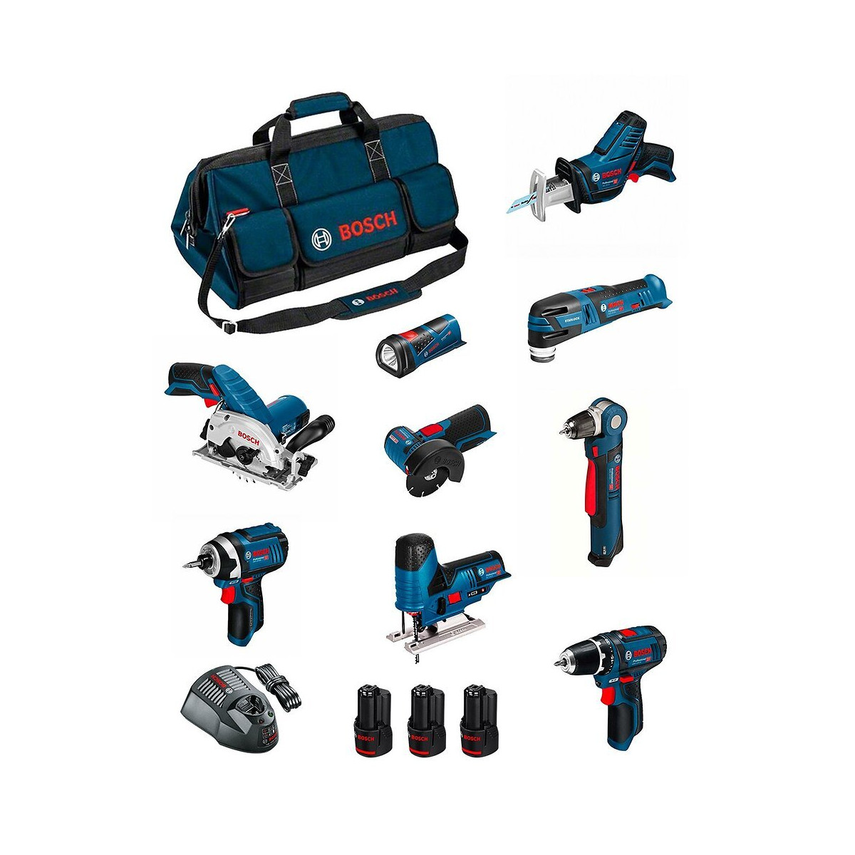BOSCH Kit 12V BMKB9-28BD3 Perceuse-Visseuse BOSCH GSR 12V-15 Professional - Sa conception extrêmement réduite de 169 mm offre pour une prise en main optimale notamment lors des travaux de vissage et perçage en hauteur et dans les endroits difficiles d'accès - Performance professionnelle : son engrenage 2 vitesses garantit un couple puissant de 15 Nm (matériaux tendres), pour le perçage (jusqu'à 19 mm) et le vissage (jusqu'à 7 mm) - Mandrin Auto-Lock 10 mm - Éclairage LED intégré pour éclairer la zone de travail, même dans les endroits sombres Visseuse à Chocs BOSCH GDR 12V-105 Professional - Avec 137 mm, elle est la plus compacte de la catégorie 12 V. Elle assure une prise en main optimale notamment lors des travaux de vissage en hauteur et dans les endroits difficiles d'accès - Couple remarquable (105 Nm) suffisant pour 80 % des applications courantes dans le métal et le béton - Résultats parfaits grâce à la présélection de vitesse pour les applications nécessitant une vitesse adaptée au matériau - Réversibilité gauche/droite pour visser et dévisser - Très bonne maniabilité de la visseuse grâce à sa poignée antidérapante Soft Grip - Eclairage LED intégré pour illuminer la zone de travail, même dans les coins sombres Scie Circulaire BOSCH GKS 12V-26 Professional - La plus compacte des Scies Circulaires universelles professionnelles - La scie la plus compacte de sa catégorie pour une maniabilité parfaite et de nombreuses possibilités d'utilisation dans le bois - Ergonomie excellente : poignée fine et faible poids (1.4 kg seulement) pour un confort de travail maximal - Témoin de niveau de charge pratique : indique à tout moment les réserves d'énergie restantes - Système d'aspiration Bosch Meuleuse d'Angle BOSCH GWS 12V-76 Professional - Maniable dans chaque situation: extrêmement compacte et ergonomique pour un tronçonnage rapide sur les chantiers - Progression de travail rapide grâce au puissant moteur EC sans charbon - Usage polyvalent dans de nombreux matériaux Scie Sauteuse BOSCH GST 12V-70 Professional - Scie Sauteuse de 12 V compacte à poignée étrier - Poignée champignon, grande légèreté et forme compacte pour un maniement parfait même lors de la réalisation de coupes par en dessous - Poignée très proche de la ligne de coupe pour une prise en main parfaite en cours d'utilisation - Changement de lame facile et sans clé grâce au système SDS Bosch - Conçue pour les coupes courbes et transversales ainsi que pour les applications peu et moyennement exigeantes dans le bois massif, les panneaux agglomérés et les bois composites - Permet aussi de réaliser des coupes biaises et dispose de la fonction Constant Speed, d'un éclairage LED, d'un mouvement orbital, du système de guidage Precision Control et d'une présélection de vitesse - Compatible avec le système d'aspiration de poussières Click & Clean Bosch et d'autres aspirateurs Bosch ainsi qu'avec toutes les batteries et tous les chargeurs 12 V de Bosch Professional (Professional 12V System) Outil Multifonction BOSCH GOP 12V-28 Professional - L'Outil Multifonction sans-fil le plus compact de la gamme Starlock Bosch - Interface Starlock avec système d'accroche en étoile pour une transmission optimale du couple entre l'outil et l'accessoire - Moteur BRUSHLESS : plus endurant, autonomie accrue, plus de puissance grâce au moteur sans charbon - Présélection de vitesse : des résultats parfaits pour les applications nécessitant une vitesse adaptée au matériau - Poignée très fine pour une prise en main très ergonomique et agréable - Grande légèreté pour une bonne maniabilité et un grand confort d'utilisation Scie Sabre BOSCH GSA 12V-14 Professional - La scie la plus compacte de sa catégorie pour une maniabilité parfaite et de nombreuses possibilités d'utilisation dans le bois, le métal et le plastique - Résultats parfaits grâce à la présélection de vitesse pour les applications nécessitant une vitesse adaptée au matériau - Ergonomie excellente : poignée fine et faible poids (1,2 kg seulement) pour un confort de travail maximal - Eclairage LED intégré pour illuminer la zone de travail, même dans les coins sombres Perceuse d'Angle BOSCH GWB 12V-10 Professional - Très grande polyvalence grâce à sa tête orientable dans 5 positions : 0° / 22.5° / 45° / 67.5° / 90° - Très compacte : tête orientable extrêmement courte (seulement 11 cm) avec mandrin Auto-Lock de 10 mm - Régime élevé de 0 à 1300 trs/min pour une progression rapide, idéal pour les perçages Lampe LED BOSCH GLI 12V-80 Professional - Technologie LED à économie d'énergie permettant d'éclairer pendant toute une journée - Forme ergonomique et zones préhension à revêtement softgrip pour une bonne prise en main - Cette lampe torche classique est idéale pour éclairer de petits espaces ou des endroits exigus - Compatible avec toutes les batteries 12 V de Bosch Professional (Professional 12V System)