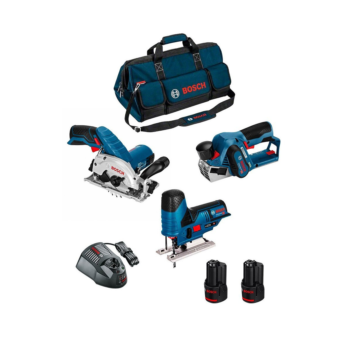 BOSCH Kit 12V BMKB3-28AD2 Scie Circulaire BOSCH GKS 12V-26 Professional - La plus compacte des Scies Circulaires universelles professionnelles - La scie la plus compacte de sa catégorie pour une maniabilité parfaite et de nombreuses possibilités d'utilisation dans le bois - Ergonomie excellente : poignée fine et faible poids (1.4 kg seulement) pour un confort de travail maximal - Témoin de niveau de charge pratique : indique à tout moment les réserves d'énergie restantes - Système d'aspiration Bosch Scie Sauteuse BOSCH GST 12V-70 Professional - Scie Sauteuse de 12 V compacte à poignée étrier - Poignée champignon, grande légèreté et forme compacte pour un maniement parfait même lors de la réalisation de coupes par en dessous - Poignée très proche de la ligne de coupe pour une prise en main parfaite en cours d'utilisation - Changement de lame facile et sans clé grâce au système SDS Bosch - Conçue pour les coupes courbes et transversales ainsi que pour les applications peu et moyennement exigeantes dans le bois massif, les panneaux agglomérés et les bois composites - Permet aussi de réaliser des coupes biaises et dispose de la fonction Constant Speed, d'un éclairage LED, d'un mouvement orbital, du système de guidage Precision Control et d'une présélection de vitesse - Compatible avec le système d'aspiration de poussières Click & Clean Bosch et d'autres aspirateurs Bosch ainsi qu'avec toutes les batteries et tous les chargeurs 12 V de Bosch Professional (Professional 12V System) Rabot BOSCH GHO 12V-20 Professional - Le premier Rabot professionnel 12 V avec une facilité de guidage inédite - Équilibrage optimisé pour un grand confort d'utilisation et une prise en main ergonomique - Grande compacité grâce au moteur EC sans charbon et au système 12 V - Grande liberté de mouvement et une utilisation facile dans toutes les positions de travail grâce à l'absence de fil - Conçu pour le rabotage du bois - Compatible avec toutes les batteries et tous les chargeurs 12 V de Bosch Professional (Professional 12V System) ainsi qu'avec les sacs à poussière et le système d'aspiration de poussières Click & Clean