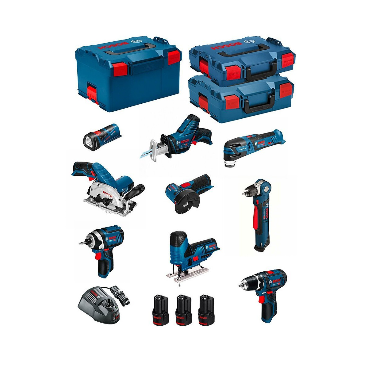 BOSCH Kit 12V BMK9-28BD3 Perceuse-Visseuse BOSCH GSR 12V-15 Professional - Sa conception extrêmement réduite de 169 mm offre pour une prise en main optimale notamment lors des travaux de vissage et perçage en hauteur et dans les endroits difficiles d'accès - Performance professionnelle : son engrenage 2 vitesses garantit un couple puissant de 15 Nm (matériaux tendres), pour le perçage (jusqu'à 19 mm) et le vissage (jusqu'à 7 mm) - Mandrin Auto-Lock 10 mm - Éclairage LED intégré pour éclairer la zone de travail, même dans les endroits sombres Visseuse à Chocs BOSCH GDR 12V-105 Professional - Avec 137 mm, elle est la plus compacte de la catégorie 12 V. Elle assure une prise en main optimale notamment lors des travaux de vissage en hauteur et dans les endroits difficiles d'accès - Couple remarquable (105 Nm) suffisant pour 80 % des applications courantes dans le métal et le béton - Résultats parfaits grâce à la présélection de vitesse pour les applications nécessitant une vitesse adaptée au matériau - Réversibilité gauche/droite pour visser et dévisser - Très bonne maniabilité de la visseuse grâce à sa poignée antidérapante Soft Grip - Eclairage LED intégré pour illuminer la zone de travail, même dans les coins sombres Scie Circulaire BOSCH GKS 12V-26 Professional - La plus compacte des Scies Circulaires universelles professionnelles - La scie la plus compacte de sa catégorie pour une maniabilité parfaite et de nombreuses possibilités d'utilisation dans le bois - Ergonomie excellente : poignée fine et faible poids (1.4 kg seulement) pour un confort de travail maximal - Témoin de niveau de charge pratique : indique à tout moment les réserves d'énergie restantes - Système d'aspiration Bosch Meuleuse d'Angle BOSCH GWS 12V-76 Professional - Maniable dans chaque situation: extrêmement compacte et ergonomique pour un tronçonnage rapide sur les chantiers - Progression de travail rapide grâce au puissant moteur EC sans charbon - Usage polyvalent dans de nombreux matériaux Scie Sauteuse BOSCH GST 12V-70 Professional - Scie Sauteuse de 12 V compacte à poignée étrier - Poignée champignon, grande légèreté et forme compacte pour un maniement parfait même lors de la réalisation de coupes par en dessous - Poignée très proche de la ligne de coupe pour une prise en main parfaite en cours d'utilisation - Changement de lame facile et sans clé grâce au système SDS Bosch - Conçue pour les coupes courbes et transversales ainsi que pour les applications peu et moyennement exigeantes dans le bois massif, les panneaux agglomérés et les bois composites - Permet aussi de réaliser des coupes biaises et dispose de la fonction Constant Speed, d'un éclairage LED, d'un mouvement orbital, du système de guidage Precision Control et d'une présélection de vitesse - Compatible avec le système d'aspiration de poussières Click & Clean Bosch et d'autres aspirateurs Bosch ainsi qu'avec toutes les batteries et tous les chargeurs 12 V de Bosch Professional (Professional 12V System) Outil Multifonction BOSCH GOP 12V-28 Professional - L'Outil Multifonction sans-fil le plus compact de la gamme Starlock Bosch - Interface Starlock avec système d'accroche en étoile pour une transmission optimale du couple entre l'outil et l'accessoire - Moteur BRUSHLESS : plus endurant, autonomie accrue, plus de puissance grâce au moteur sans charbon - Présélection de vitesse : des résultats parfaits pour les applications nécessitant une vitesse adaptée au matériau - Poignée très fine pour une prise en main très ergonomique et agréable - Grande légèreté pour une bonne maniabilité et un grand confort d'utilisation Scie Sabre BOSCH GSA 12V-14 Professional - La scie la plus compacte de sa catégorie pour une maniabilité parfaite et de nombreuses possibilités d'utilisation dans le bois, le métal et le plastique - Résultats parfaits grâce à la présélection de vitesse pour les applications nécessitant une vitesse adaptée au matériau - Ergonomie excellente : poignée fine et faible poids (1,2 kg seulement) pour un confort de travail maximal - Eclairage LED intégré pour illuminer la zone de travail, même dans les coins sombres Perceuse d'Angle BOSCH GWB 12V-10 Professional - Très grande polyvalence grâce à sa tête orientable dans 5 positions : 0° / 22.5° / 45° / 67.5° / 90° - Très compacte : tête orientable extrêmement courte (seulement 11 cm) avec mandrin Auto-Lock de 10 mm - Régime élevé de 0 à 1300 trs/min pour une progression rapide, idéal pour les perçages Lampe LED BOSCH GLI 12V-80 Professional - Technologie LED à économie d'énergie permettant d'éclairer pendant toute une journée - Forme ergonomique et zones préhension à revêtement softgrip pour une bonne prise en main - Cette lampe torche classique est idéale pour éclairer de petits espaces ou des endroits exigus - Compatible avec toutes les batteries 12 V de Bosch Professional (Professional 12V System)