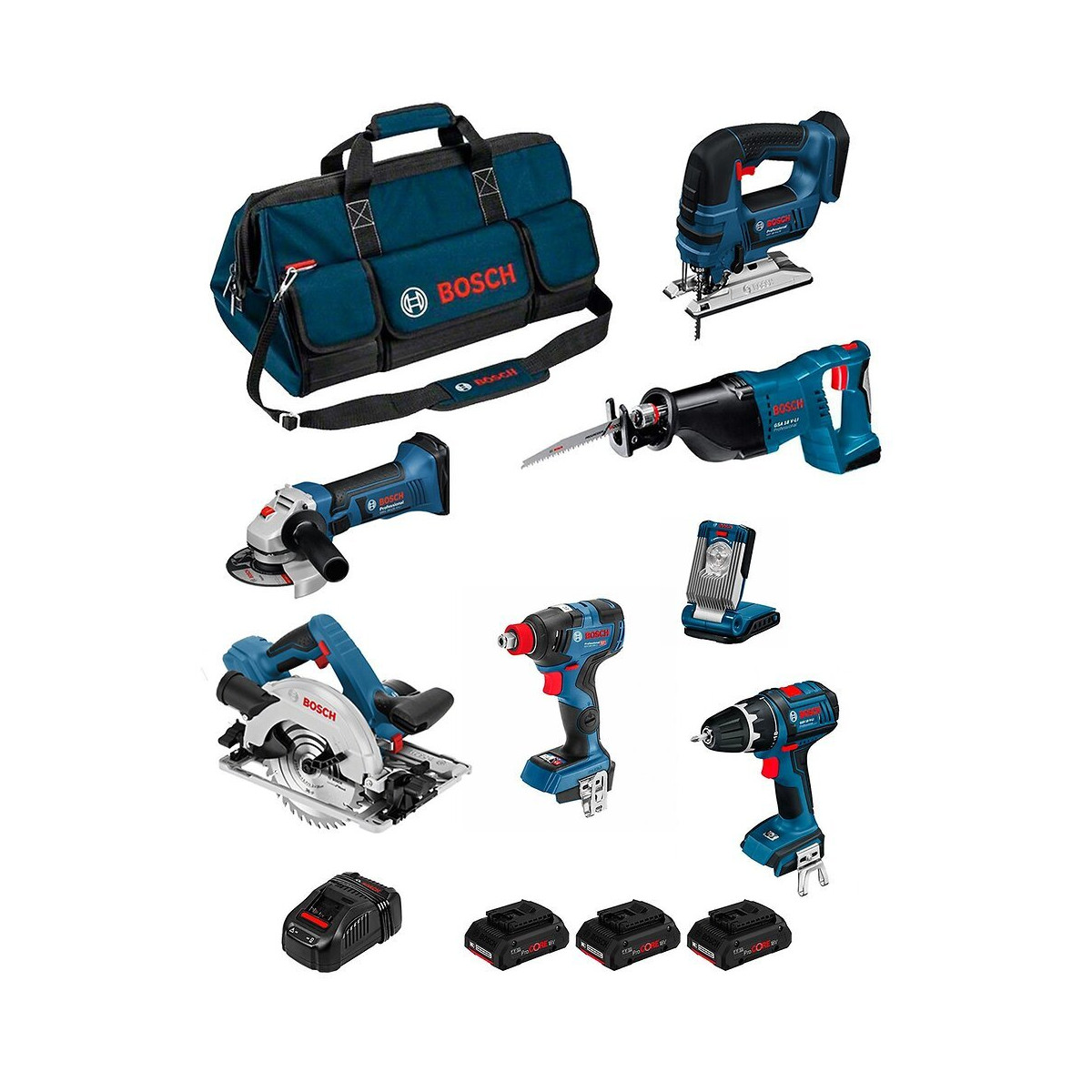 BOSCH Kit PSB7MXM3DP Meuleuse BOSCH GWS 18-125 V-LI Professional - La Meuleuse d'Angle de 18V la plus puissante - Capacité d'abrasion et capacité de coupe les plus élevées de sa catégorie par charge de batterie - Moteur 4 pôles hautes performances extrêmement robuste et endurant pour une longévité élevée - Forme compacte et poids léger (seulement 2.3 kg) pour un grand confort de travail, surtout dans les endroits difficiles d'accès et pour les travaux en hauteur Perceuse à Percussion BOSCH GSB 18 V-LI Professional - Extrêmement compacte grâce à sa conception courte (seulement 195 mm) et encore plus légère (seulement 1,9 kg) pour une manipulation parfaite - Système Bosch ECP (Electronic Cell Protection) : protège la batterie contre la surcharge, l'échauffement et la décharge totale - Lumière LED intégrée pour l'éclairage de la zone de travail, même dans les endroits sombres - Clip de ceinture pratique pour accrocher les outils confortablement sur la ceinture ou l'échelle - Les batteries COOLPACK innovantes garantissent une dissipation thermique optimale et prolongent ainsi la durée de vie jusqu'à 100% (voir batteries lithium sans COOLPACK) - Frein moteur pour des travaux de serrage en série précis - Poignée ergonomique à longue prise et poignée anti-vibration Softgrip pour un travail sans effort Scie Sauteuse BOSCH GST 18 V-LI B Professional - La Scie Sauteuse est la plus puissante de la catégorie 18 V - Modèle 18 V très performant pour une progression de travail rapide - Dispose aussi de la fonction Constant Speed, d'un éclairage LED, d'un mouvement orbital, du système de guidage Precision Control et d'une présélection de vitesse - Idéal pour les coupes courbes et transversales dans le bois massif, les panneaux agglomérés, les bois composites et les matériaux durs ou épais - Sa poignée étrier avec gâchette de vitesse permet une maîtrise parfaite et facile de l'outil - Grâce au système SDS Bosch, les lames peuvent être changées facilement et sans clé - Compatible avec le système d'aspiration de poussières Click & Clean Bosch et d'autres aspirateurs Bosch ainsi qu'avec les rails de guidage Bosch moyennant l'utilisation d'un adaptateur Clé à Chocs BOSCH GDX 18V-200 C Professional - La Clé à Chocs 18 V Bosch la plus puissante avec porte-outil 2 en 1 et moteur Brushless - Extrêmement puissante pour applications très exigeantes grâce au couple de 200 Nm - Grande polyvalence dans une grande gamme d'applications grâce au porte-outil 2 en 1 (six pans creux 1/4" et carré mâle 1/2") - Connectivité Bluetooth permettant à l'utilisateur d'être informé activement de l'état de l'outil, des besoins d'entretien et de paramétrer à distance certaines fonctions - Conçu pour le vissage dans le bois et le métal de vis de diamètres M6 à M14 - Dispose également d'une électronique ECP (Electronic Cell Protection), d'une électronique EMP (Electronic Motor Protection), d'un éclairage LED, de trois vitesses au choix, d'une réversibilité gauche-droit et d'un variateur de vitesse - Compatible avec toutes les batteries et tous les chargeurs 18 V de Bosch Professional (Professional 18V System) Scie Circulaire BOSCH GKS 18V-57 G Professional - Une Scie Circulaire puissante pour des coupes rapides et précises - Puissance : progression de travail rapide et grande autonomie grâce au puissant moteur et aux batteries BOSCH - Flexibilité et précision : le rail de guidage permet de travailler rapidement et avec précision - Pour les besoins de chacun : la lame de la scie circulaire peut désormais aussi être placée du côté droit Scie Sabre BOSCH GSA 18 V-LI Professional - Meilleures performances de coupe dans sa catégorie - Capacité de coupe par charge : plus de 100 poutrelles en sapin (100 x 100 mm) - Système Electronic Motor Protection (protection électronique du moteur) : protège le moteur contre les surcharges et garantit ainsi une longévité élevée - Une manipulation aisée : grâce au mécanisme SDS, le changement de la lame est simple et rapide Lampe BOSCH GLI VariLED Professional - Lampe de travail Bosch au format de poche la plus lumineuse de la catégorie 18V - Avec 3 puissantes LED produisant 420 lumens pour un éclairement intense - Mécanisme de rabattement innovant facilitant le transport et assurant un rangement compact - Faisceau réglable (éclairage diffus / éclairage concentré) et angle d'éclairage réglable dans 9 positions pour de multiples applications - Cette lampe de travail est idéal pour bien éclairer de petits espaces
