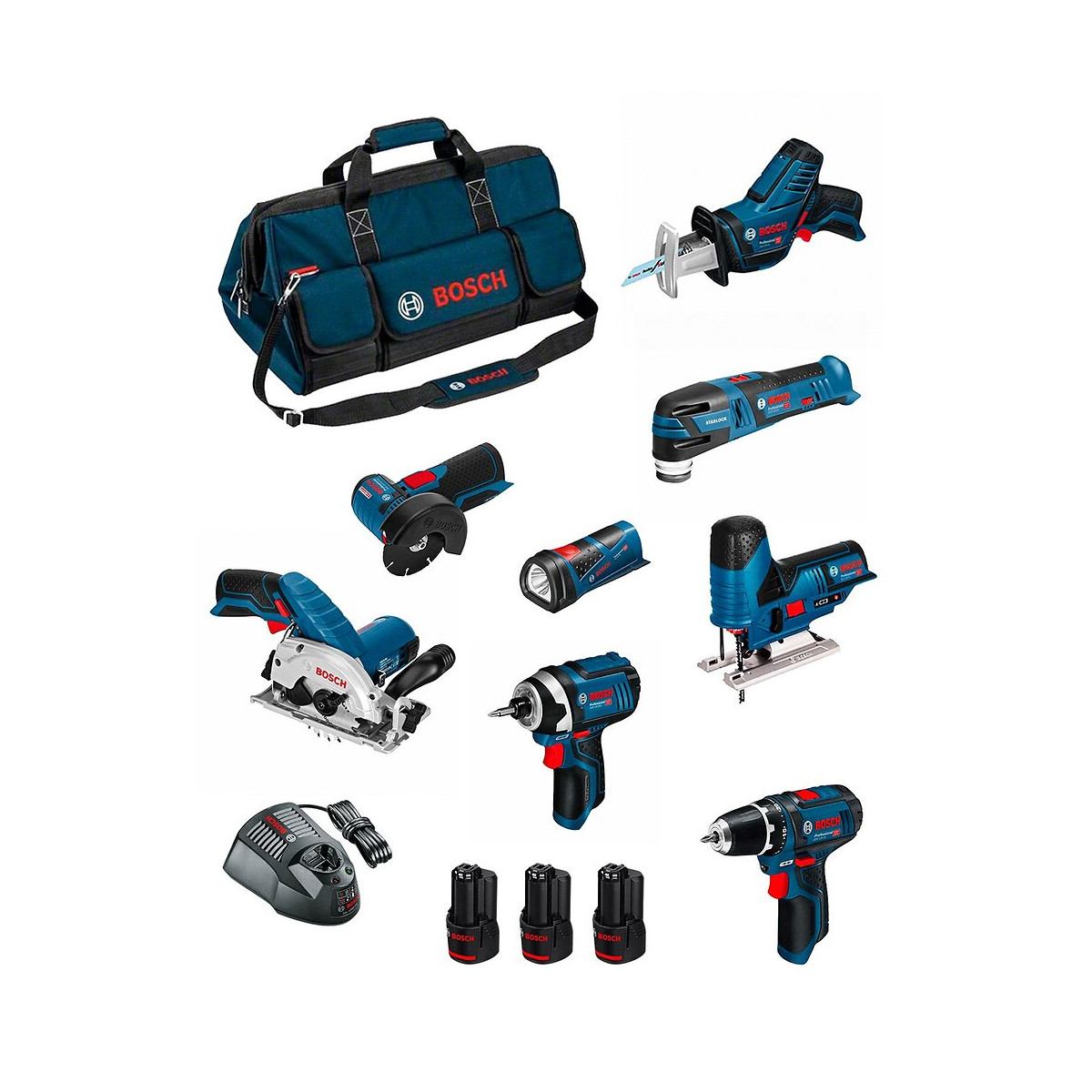 BOSCH Kit 12V BMKB8-28BD3 Perceuse-Visseuse BOSCH GSR 12V-15 Professional - Sa conception extrêmement réduite de 169 mm offre pour une prise en main optimale notamment lors des travaux de vissage et perçage en hauteur et dans les endroits difficiles d'accès - Performance professionnelle : son engrenage 2 vitesses garantit un couple puissant de 15 Nm (matériaux tendres), pour le perçage (jusqu'à 19 mm) et le vissage (jusqu'à 7 mm) - Mandrin Auto-Lock 10 mm - Éclairage LED intégré pour éclairer la zone de travail, même dans les endroits sombres Visseuse à Chocs BOSCH GDR 12V-105 Professional - Avec 137 mm, elle est la plus compacte de la catégorie 12 V. Elle assure une prise en main optimale notamment lors des travaux de vissage en hauteur et dans les endroits difficiles d'accès - Couple remarquable (105 Nm) suffisant pour 80 % des applications courantes dans le métal et le béton - Résultats parfaits grâce à la présélection de vitesse pour les applications nécessitant une vitesse adaptée au matériau - Réversibilité gauche/droite pour visser et dévisser - Très bonne maniabilité de la visseuse grâce à sa poignée antidérapante Soft Grip - Eclairage LED intégré pour illuminer la zone de travail, même dans les coins sombres Scie Circulaire BOSCH GKS 12V-26 Professional - La plus compacte des Scies Circulaires universelles professionnelles - La scie la plus compacte de sa catégorie pour une maniabilité parfaite et de nombreuses possibilités d'utilisation dans le bois - Ergonomie excellente : poignée fine et faible poids (1.4 kg seulement) pour un confort de travail maximal - Témoin de niveau de charge pratique : indique à tout moment les réserves d'énergie restantes - Système d'aspiration Bosch Meuleuse d'Angle BOSCH GWS 12V-76 Professional - Maniable dans chaque situation: extrêmement compacte et ergonomique pour un tronçonnage rapide sur les chantiers - Progression de travail rapide grâce au puissant moteur EC sans charbon - Usage polyvalent dans de nombreux matériaux Scie Sauteuse BOSCH GST 12V-70 Professional - Scie Sauteuse de 12 V compacte à poignée étrier - Poignée champignon, grande légèreté et forme compacte pour un maniement parfait même lors de la réalisation de coupes par en dessous - Poignée très proche de la ligne de coupe pour une prise en main parfaite en cours d'utilisation - Changement de lame facile et sans clé grâce au système SDS Bosch - Conçue pour les coupes courbes et transversales ainsi que pour les applications peu et moyennement exigeantes dans le bois massif, les panneaux agglomérés et les bois composites - Permet aussi de réaliser des coupes biaises et dispose de la fonction Constant Speed, d'un éclairage LED, d'un mouvement orbital, du système de guidage Precision Control et d'une présélection de vitesse - Compatible avec le système d'aspiration de poussières Click & Clean Bosch et d'autres aspirateurs Bosch ainsi qu'avec toutes les batteries et tous les chargeurs 12 V de Bosch Professional (Professional 12V System) Outil Multifonction BOSCH GOP 12V-28 Professional - L'Outil Multifonction sans-fil le plus compact de la gamme Starlock Bosch - Interface Starlock avec système d'accroche en étoile pour une transmission optimale du couple entre l'outil et l'accessoire - Moteur BRUSHLESS : plus endurant, autonomie accrue, plus de puissance grâce au moteur sans charbon - Présélection de vitesse : des résultats parfaits pour les applications nécessitant une vitesse adaptée au matériau - Poignée très fine pour une prise en main très ergonomique et agréable - Grande légèreté pour une bonne maniabilité et un grand confort d'utilisation Scie Sabre BOSCH GSA 12V-14 Professional - La scie la plus compacte de sa catégorie pour une maniabilité parfaite et de nombreuses possibilités d'utilisation dans le bois, le métal et le plastique - Résultats parfaits grâce à la présélection de vitesse pour les applications nécessitant une vitesse adaptée au matériau - Ergonomie excellente : poignée fine et faible poids (1,2 kg seulement) pour un confort de travail maximal - Eclairage LED intégré pour illuminer la zone de travail, même dans les coins sombres Lampe LED BOSCH GLI 12V-80 Professional - Technologie LED à économie d'énergie permettant d'éclairer pendant toute une journée - Forme ergonomique et zones préhension à revêtement softgrip pour une bonne prise en main - Cette lampe torche classique est idéale pour éclairer de petits espaces ou des endroits exigus - Compatible avec toutes les batteries 12 V de Bosch Professional (Professional 12V System)