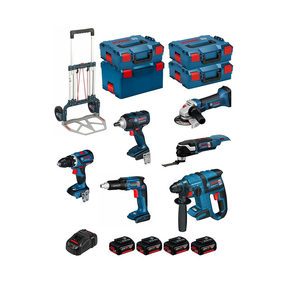 BOSCH Kit PSL6P4MCEC Meuleuse BOSCH GWS 18-125 V-LI Professional - La Meuleuse d'Angle de 18V la plus puissante - Capacité d'abrasion et capacité de coupe les plus élevées de sa catégorie par charge de batterie - Moteur 4 pôles hautes performances extrêmement robuste et endurant pour une longévité élevée - Forme compacte et poids léger (seulement 2.3 kg) pour un grand confort de travail, surtout dans les endroits difficiles d'accès et pour les travaux en hauteur Perceuse-Visseuse BOSCH GSR 18V-60 C Professional - Personnalisation possible de certaines fonctions, telles que le réglage de l'embrayage de précision, à partir d'un smartphone pour une adaptation parfaite aux besoins - Possibilité de réglage à distance de la sensibilité du système KickBack Control - Compatible avec TrackMyTools, le système Bosch intelligent de gestion d'inventaire Outil Multifonction BOSCH GOP 18V-28 Professional - Outil Multifonction puissant et polyvalent de la gamme StarlockPlus de Bosch - Interface Starlock avec système d'accroche en étoile pour une transmission optimale du couple entre l'outil et l'accessoire - Fonction Snap-in pour changer d'accessoire rapidement et facilement - Conçu pour réaliser des découpes dans des meubles, pour les travaux de rénovation de bateaux et pour sectionner des tuyaux et des clous - Peut être utilisé pour le bois, le plastique et le métal - Compatible avec les systèmes Starlock et StarlockPlus - Éclairage LED assurant une bonne visibilité de l'espace de travail dans les endroits sombres - Bénéficie de la fonction Constant Speed, d'une poignée Softgrip et d'une présélection de vitesse Clé à Chocs BOSCH GDS 18 V-EC 250 Professional - Couple de 250 Nm pour des applications hautes performances - Propulsé par le moteur Bosch EC pour une autonomie et une durée de vie plus longues - Maintenance simple des composants à remplacer fréquemment - Clip de ceinture pour une grande mobilité - Visseuse légère et compacte pour une manipulation facile - Conception de poignée mince et ergonomique pour un travail sans fatigue - L'éclairage LED offre un environnement de travail lumineux Visseuse Plaquiste BOSCH GSR 18V-EC TE Professional - Visseuse Plaquiste sans fil Bosch la plus puissante de la catégorie 18 V - Moteur Brushless Bosch avec Electronic Motor Protection et frein moteur pour une grande longévité - Puissant moteur de 18 V très compact permettant de visser jusqu'à 3400 vis par charge de batterie (4,0 Ah) - Conception compacte et légère, 1,6 kg, pour une prise en main parfaite et un travail sans effort - Conçu pour le vissage de vis dans des ossatures en matériaux tendres tels que le bois et métal - Dispose aussi d'un mandrin Autolock, d'une réversibilité droite/gauche et d'une présélection de vitesse - Compatible avec toutes les batteries et tous les chargeurs 18 V de Bosch Professional (Professional 18V System) Perforateur BOSCH GBH 18 V-EC Professional - Modèle au meilleur rapport poids/performance de la gamme des Perforateurs sans-fil SDS plus Bosch de 18 V - Conception compacte et légère permettant d'effectuer des perçages en hauteur - Longévité élevée grâce à des composants robustes et au moteur EC Brushless - Conçu pour les applications de perçage et burinage dans le béton, la maçonnerie, le bois et le métal - Dispose également d'une électronique de protection du moteur (EMP), d'un éclairage LED, d'un embrayage de sécurité, d'un variateur de vitesse et de la fonction Vario Lock - Compatible avec divers dispositifs d'aspiration de poussière ainsi qu'avec toutes les batteries et tous les chargeurs 18 V de Bosch Professional (Professional 18V System)