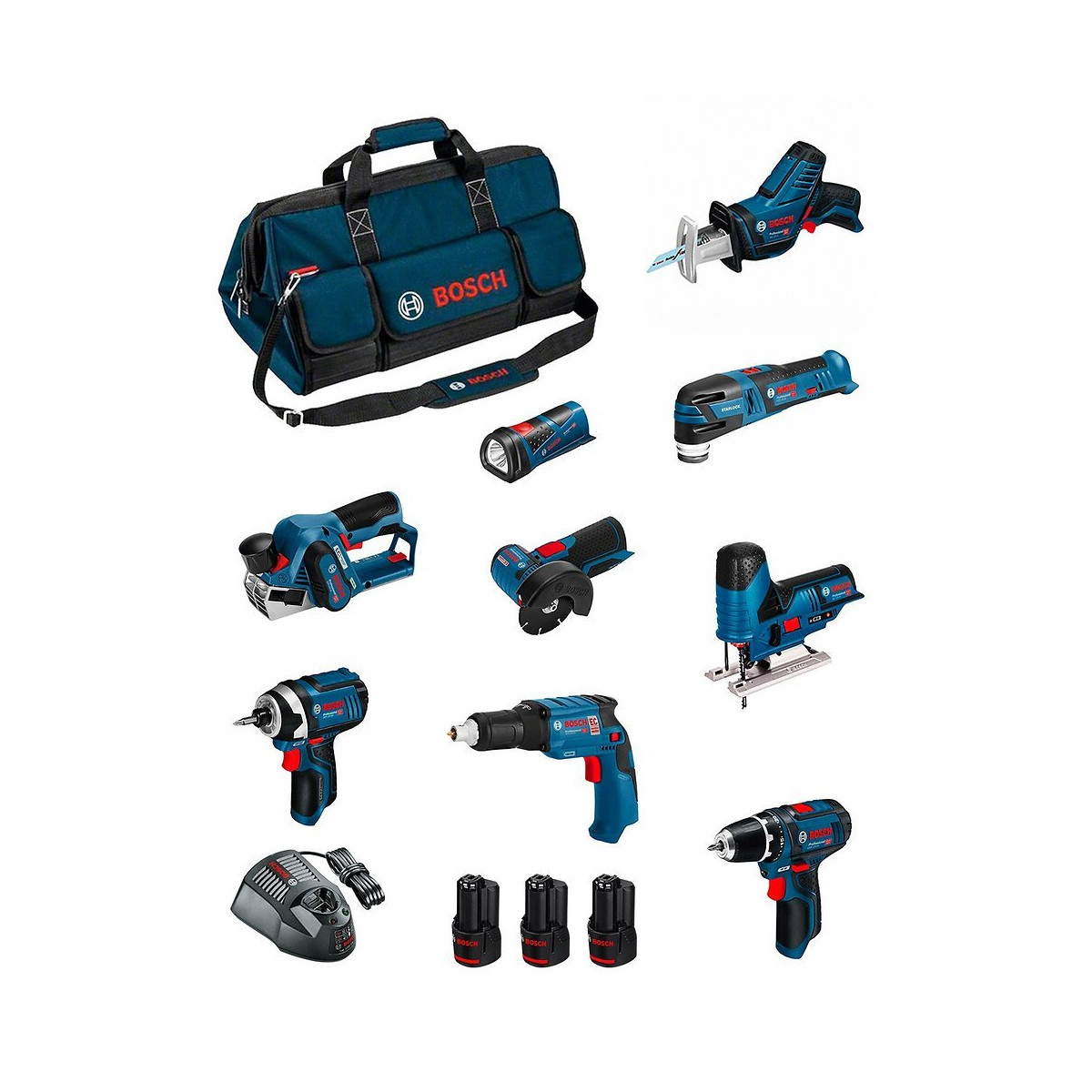 BOSCH Kit 12V BMKB9-28CD3 Perceuse-Visseuse BOSCH GSR 12V-15 Professional - Sa conception extrêmement réduite de 169 mm offre pour une prise en main optimale notamment lors des travaux de vissage et perçage en hauteur et dans les endroits difficiles d'accès - Performance professionnelle : son engrenage 2 vitesses garantit un couple puissant de 15 Nm (matériaux tendres), pour le perçage (jusqu'à 19 mm) et le vissage (jusqu'à 7 mm) - Mandrin Auto-Lock 10 mm - Éclairage LED intégré pour éclairer la zone de travail, même dans les endroits sombres Visseuse Plaquiste BOSCH GTB 12V-11 Professional - Conception légère et compacte de 0,9 kg avec batterie et poignée ergonomique, pour une prise en main confortable dans les espaces restreints - Moteur puissant et compact de 12V pour visser 1200 vis par charge de batterie - Moteur Brushless Bosch avec Electronic Motor Protection et frein moteur pour une grande longévité - Conçue pour fixer les vis de construction sèches dans des matériaux tels que le bois et le métal, bien qu'il soit également optimisé pour les plaques de plâtre - Comprend Autolock, butée de profondeur interchangeable, mode inverse et sélection de la vitesse - Compatible avec toutes les batteries et chargeurs Bosch Professional 12V (système Professional 12V) Visseuse à Chocs BOSCH GDR 12V-105 Professional - Avec 137 mm, elle est la plus compacte de la catégorie 12 V. Elle assure une prise en main optimale notamment lors des travaux de vissage en hauteur et dans les endroits difficiles d'accès - Couple remarquable (105 Nm) suffisant pour 80 % des applications courantes dans le métal et le béton - Résultats parfaits grâce à la présélection de vitesse pour les applications nécessitant une vitesse adaptée au matériau - Réversibilité gauche/droite pour visser et dévisser - Très bonne maniabilité de la visseuse grâce à sa poignée antidérapante Soft Grip - Eclairage LED intégré pour illuminer la zone de travail, même dans les coins sombres Meuleuse d'Angle BOSCH GWS 12V-76 Professional - Maniable dans chaque situation: extrêmement compacte et ergonomique pour un tronçonnage rapide sur les chantiers - Progression de travail rapide grâce au puissant moteur EC sans charbon - Usage polyvalent dans de nombreux matériaux Scie Sauteuse BOSCH GST 12V-70 Professional - Scie Sauteuse de 12 V compacte à poignée étrier - Poignée champignon, grande légèreté et forme compacte pour un maniement parfait même lors de la réalisation de coupes par en dessous - Poignée très proche de la ligne de coupe pour une prise en main parfaite en cours d'utilisation - Changement de lame facile et sans clé grâce au système SDS Bosch - Conçue pour les coupes courbes et transversales ainsi que pour les applications peu et moyennement exigeantes dans le bois massif, les panneaux agglomérés et les bois composites - Permet aussi de réaliser des coupes biaises et dispose de la fonction Constant Speed, d'un éclairage LED, d'un mouvement orbital, du système de guidage Precision Control et d'une présélection de vitesse - Compatible avec le système d'aspiration de poussières Click & Clean Bosch et d'autres aspirateurs Bosch ainsi qu'avec toutes les batteries et tous les chargeurs 12 V de Bosch Professional (Professional 12V System) Outil Multifonction BOSCH GOP 12V-28 Professional - L'Outil Multifonction sans-fil le plus compact de la gamme Starlock Bosch - Interface Starlock avec système d'accroche en étoile pour une transmission optimale du couple entre l'outil et l'accessoire - Moteur BRUSHLESS : plus endurant, autonomie accrue, plus de puissance grâce au moteur sans charbon - Présélection de vitesse : des résultats parfaits pour les applications nécessitant une vitesse adaptée au matériau - Poignée très fine pour une prise en main très ergonomique et agréable - Grande légèreté pour une bonne maniabilité et un grand confort d'utilisation Scie Sabre BOSCH GSA 12V-14 Professional - La scie la plus compacte de sa catégorie pour une maniabilité parfaite et de nombreuses possibilités d'utilisation dans le bois, le métal et le plastique - Résultats parfaits grâce à la présélection de vitesse pour les applications nécessitant une vitesse adaptée au matériau - Ergonomie excellente : poignée fine et faible poids (1,2 kg seulement) pour un confort de travail maximal - Eclairage LED intégré pour illuminer la zone de travail, même dans les coins sombres Lampe LED BOSCH GLI 12V-80 Professional - Technologie LED à économie d'énergie permettant d'éclairer pendant toute une journée - Forme ergonomique et zones préhension à revêtement softgrip pour une bonne prise en main - Cette lampe torche classique est idéale pour éclairer de petits espaces ou des endroits exigus - Compatible avec toutes les batteries 12 V de Bosch Professional (Professional 12V System) Rabot BOSCH GHO 12V-20 Professional - Le premier Rabot professionnel 12 V avec une facilité de guidage inédite - Équilibrage optimisé pour un grand confort d'utilisation et une prise en main ergonomique - Grande compacité grâce au moteur EC sans charbon et au système 12 V - Grande liberté de mouvement et une utilisation facile dans toutes les positions de travail grâce à l'absence de fil - Conçu pour le rabotage du bois - Compatible avec toutes les batteries et tous les chargeurs 12 V de Bosch Professional (Professional 12V System) ainsi qu'avec les sacs à poussière et le système d'aspiration de poussières Click & Clean