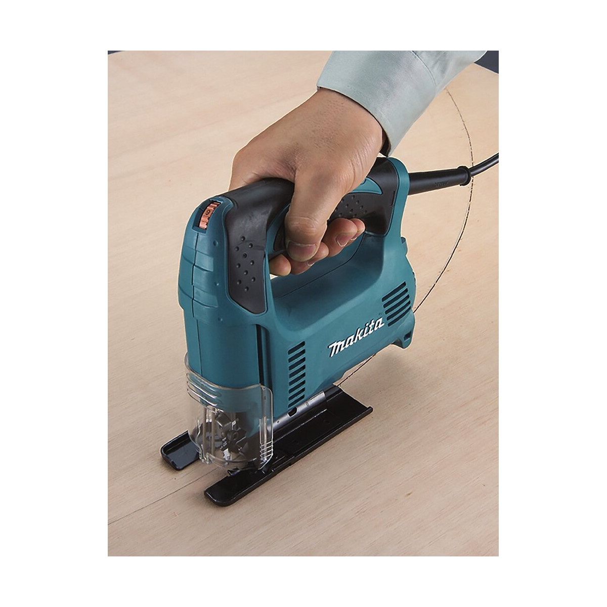 Scie Sauteuse MAKITA 4327 - Régulateur de vitesse électronique à 6 positions - Flux d'air forcé sur la zone de travail, pour une coupe plus nette - Utilisation de lames de scie avec insert universel - Nouveau design, avec poignée antidérapante et plus de puissance - Particulièrement léger et extrêmement équilibré - Protecteur de coupure transparent