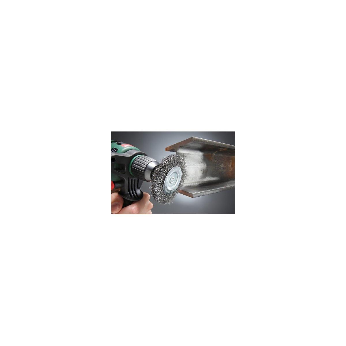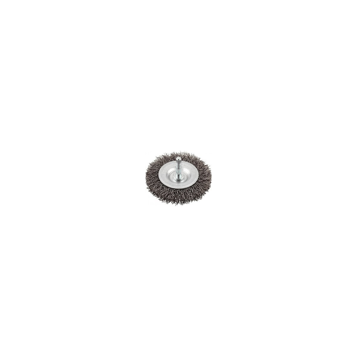 Brosse circulaire, fil d'acier HSS ondulé, pour le dérouillage, le nettoyage, l'élimination de peintures, de dépôts et de bavures, pour métal ou pierre, pour le travail sur des bords et chants étroits, cadres, poteaux, grilles et tuyaux. 100mm