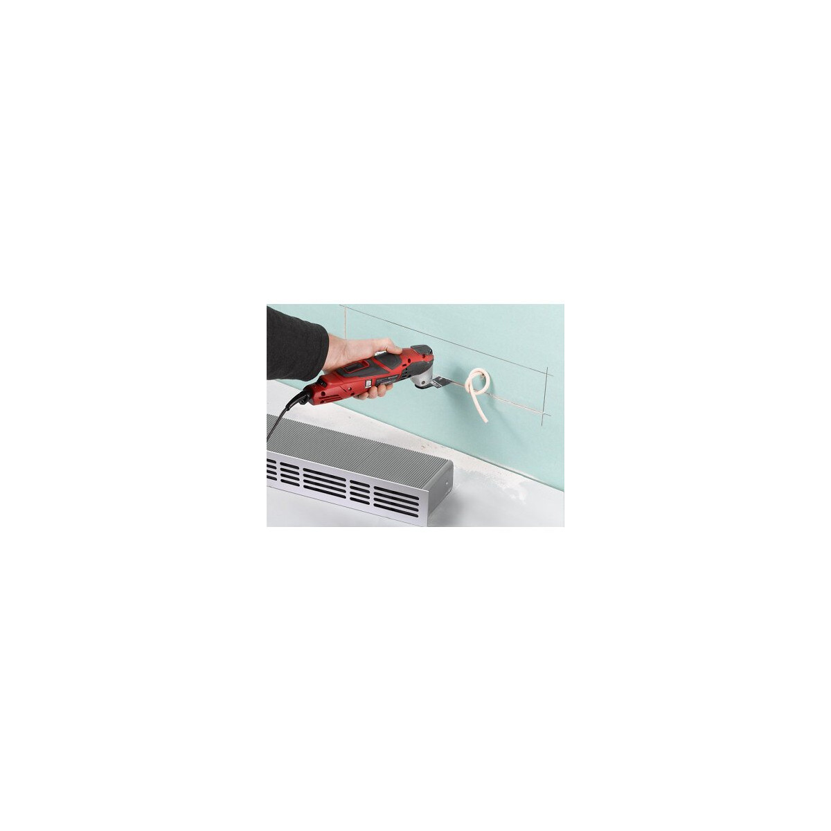 Avec rainures de serrage brevetées pour une puissance de travail plus élevée et plus rapide et logement de changement rapide. Pour des coupes propres dans les bois durs, les bois tendres, le parquet, la carton plâtre, le plastique etc. Pénétration facile dans le matériau à n´importe quel endroit pour couper les plaques, le parquet, le plastique. Par exemple pour les coupes plongeantes faciles dans les plans de travail de cuisine pour les grilles d´aération, dans les placards ou les plaques de plâtre pour l´accès aux prises de courant. 25% PLUS RAPIDE - 25% D'ÉCONOMIE D'ÉNERGIE