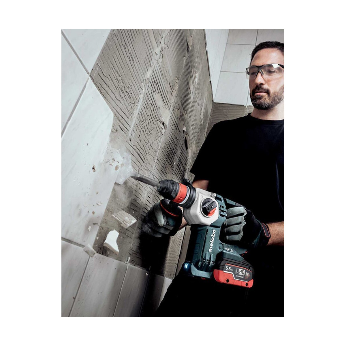 Marteau Perforateur METABO KHA 18 LTX BL 24 Quick - Marteau Perforateur extrêmement léger et maniable avec raccord d'aspiration intégré - Puissance de perçage, efficacité et longévité maximales grâce à la technologie Brushless et au mécanisme de frappe haute performance - Marteau Perforateur avec 3 fonctions : perçage à percussion, perçage et burinage - Metabo VibraTech : système d'amortissement intégré et poignée supplémentaire pour réduire les vibrations et protéger la santé - Metabo Quick : changement de mandrin rapide et sans outil pour travailler avec des forets SDS-plus et cylindriques - Système électronique Vario-Constamatic : pour percer avec des vitesses adaptées aux matériaux et qui restent quasi constantes en charge - Double sécurité grâce à l'arrêt électronique et mécanique de sécurité en cas de blocage du foret - Lampe de travail à LED pour une visibilité optimale de la zone de perçage
